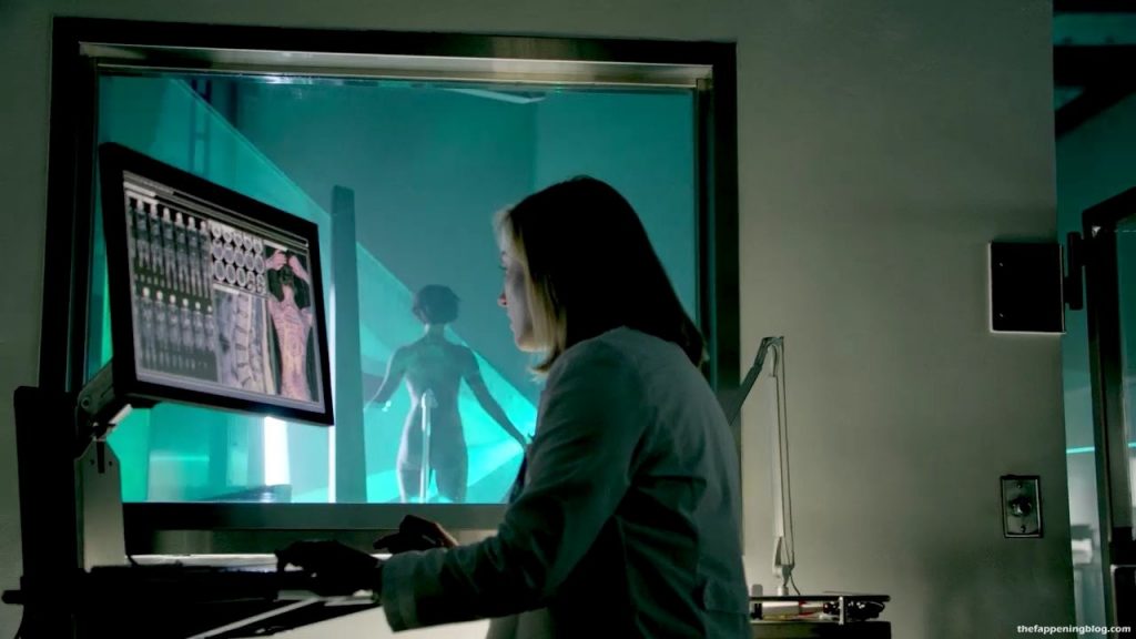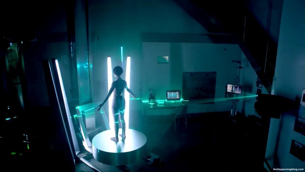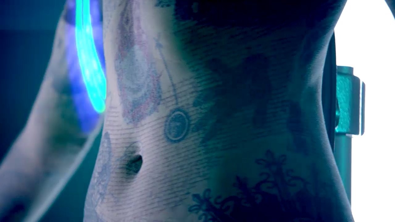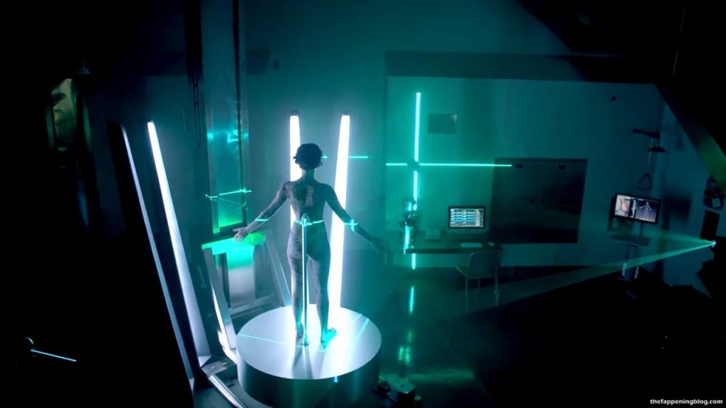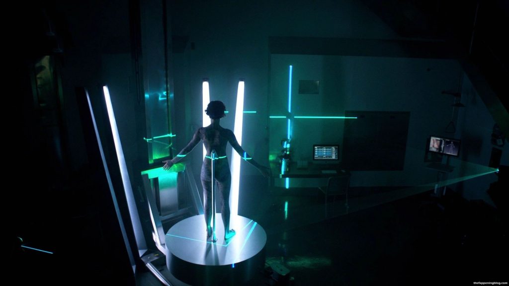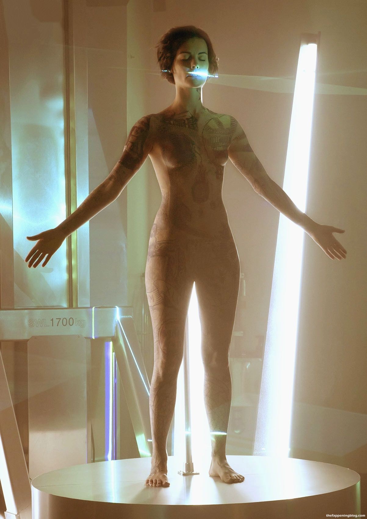 Jaimie is showing her ass, legs and stomach as she stands on a pedestal in the middle of a room spinning around in circles while they laser scan the tattoos on her body all while Ashley Johnson reviews the images on a computer screen in the next room.