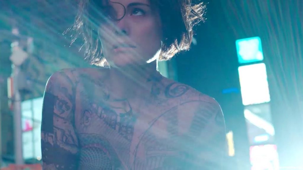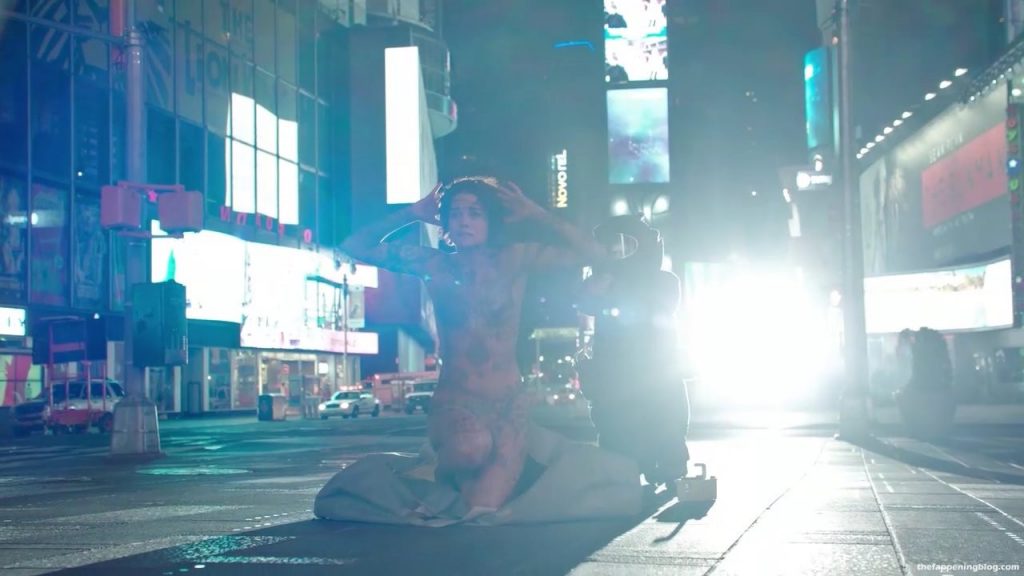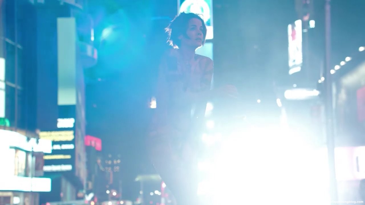 Jaimie Alexander is unzipping herself from a bag in the middle of Times Square and then standing up naked covered in tattoos as policemen shine a spotlight over her body and then make her get down on her knees.