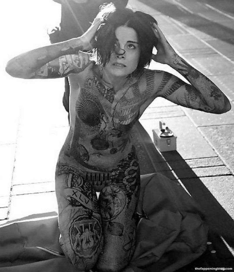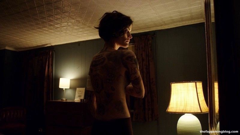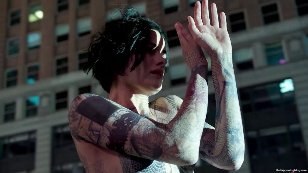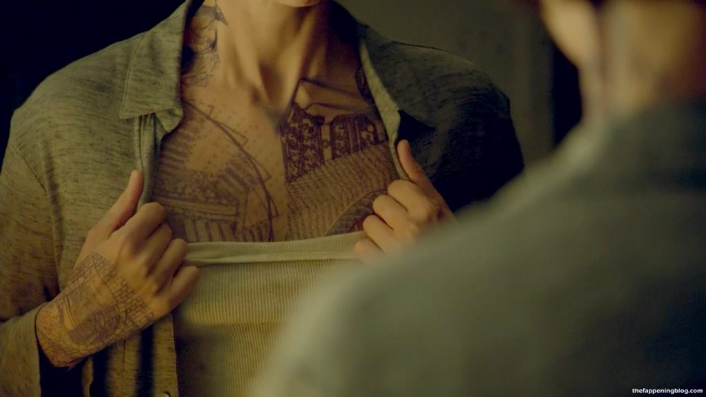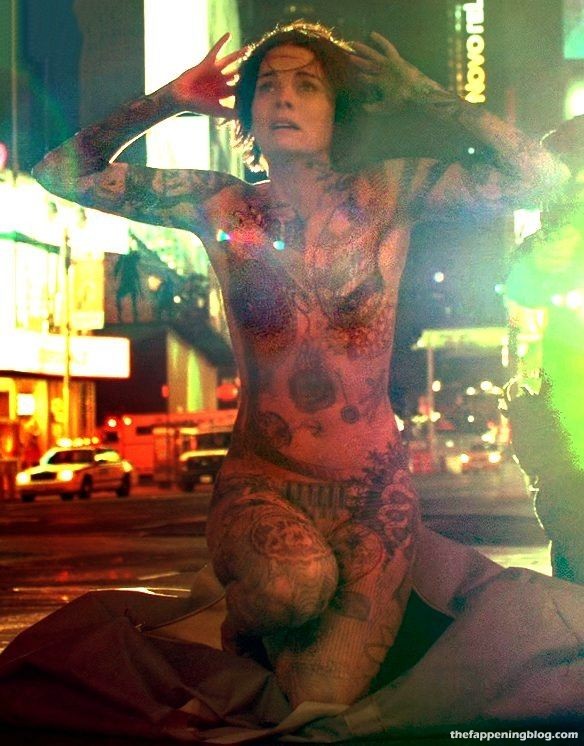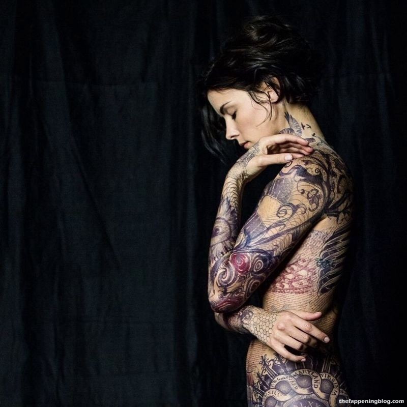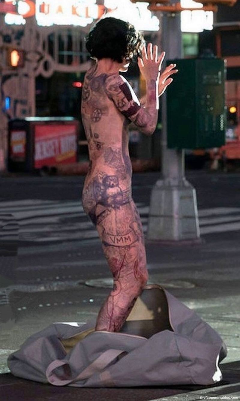 Ella dijo en una entrevista que no le pintaron los tatuajes en su cuerpo. Dijo que es un traje muy ligero que cubre todo su cuerpo. Más o menos como lo que hicieron con Jennifer Lawrence en X-Men.