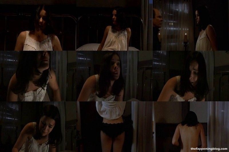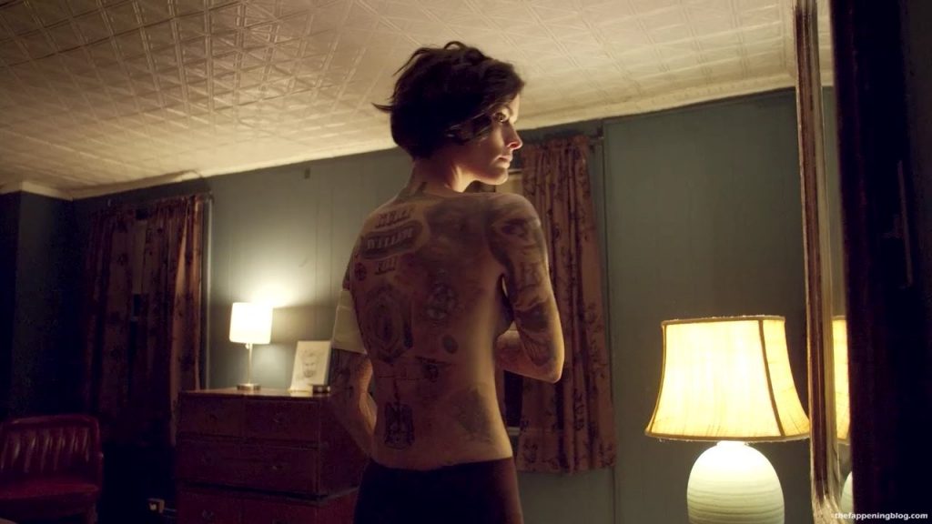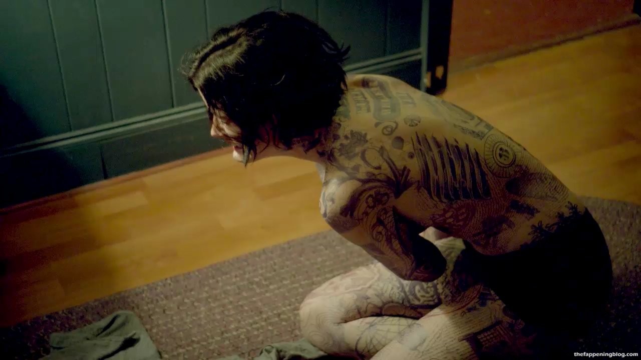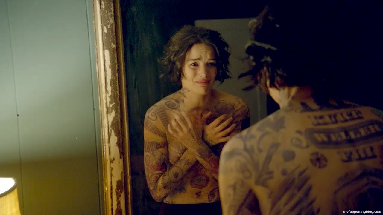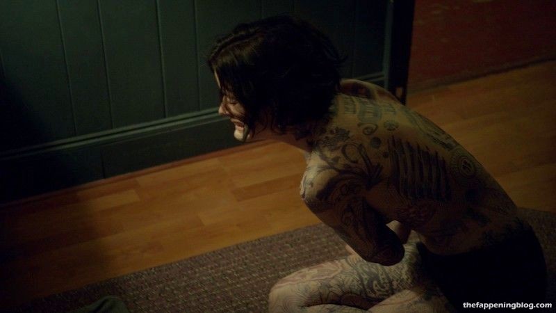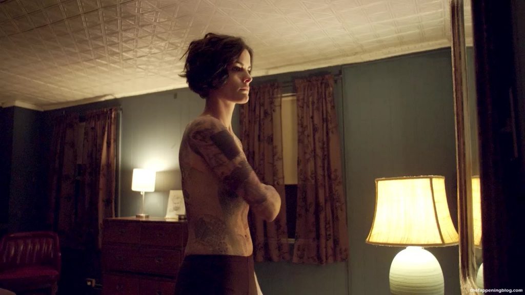 Jaimie Alexander is standing in front of a mirror as she pulls her shirt down to reveal tattoos all over her chest and then removing her shirt and standing topless and in black panties as she examines herself some more before she starts to cry and then collapses onto the ground covering her breasts with her arms.