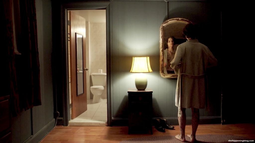 Jaimie Alexander is in front of a mirror as she removes a robe to reveal black panties and tattoos all over her breasts before she repositions herself giving us a look at the side of her right breast in the process.