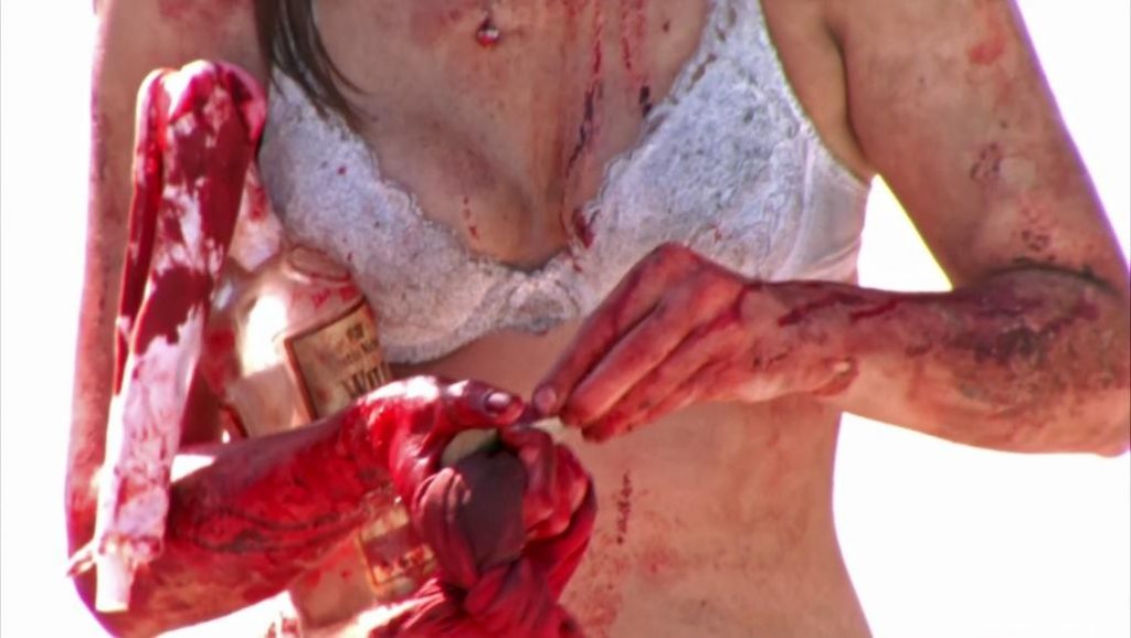 Jaimie is in an office as she rips her white tanktop off to reveal a white lace bra and then grabs an empty liquor bottle and goes outside. She then tries to pop the hood of a car before getting underneath and using a hose to pour gasoline out of the car and into the bottle. Finally she stands in the middle of the road trying to light a match as a car drives towards her until she gets the Molotov cocktail lit and throws it at the car causing it to explode all while she’s still just in her bra and jeans.