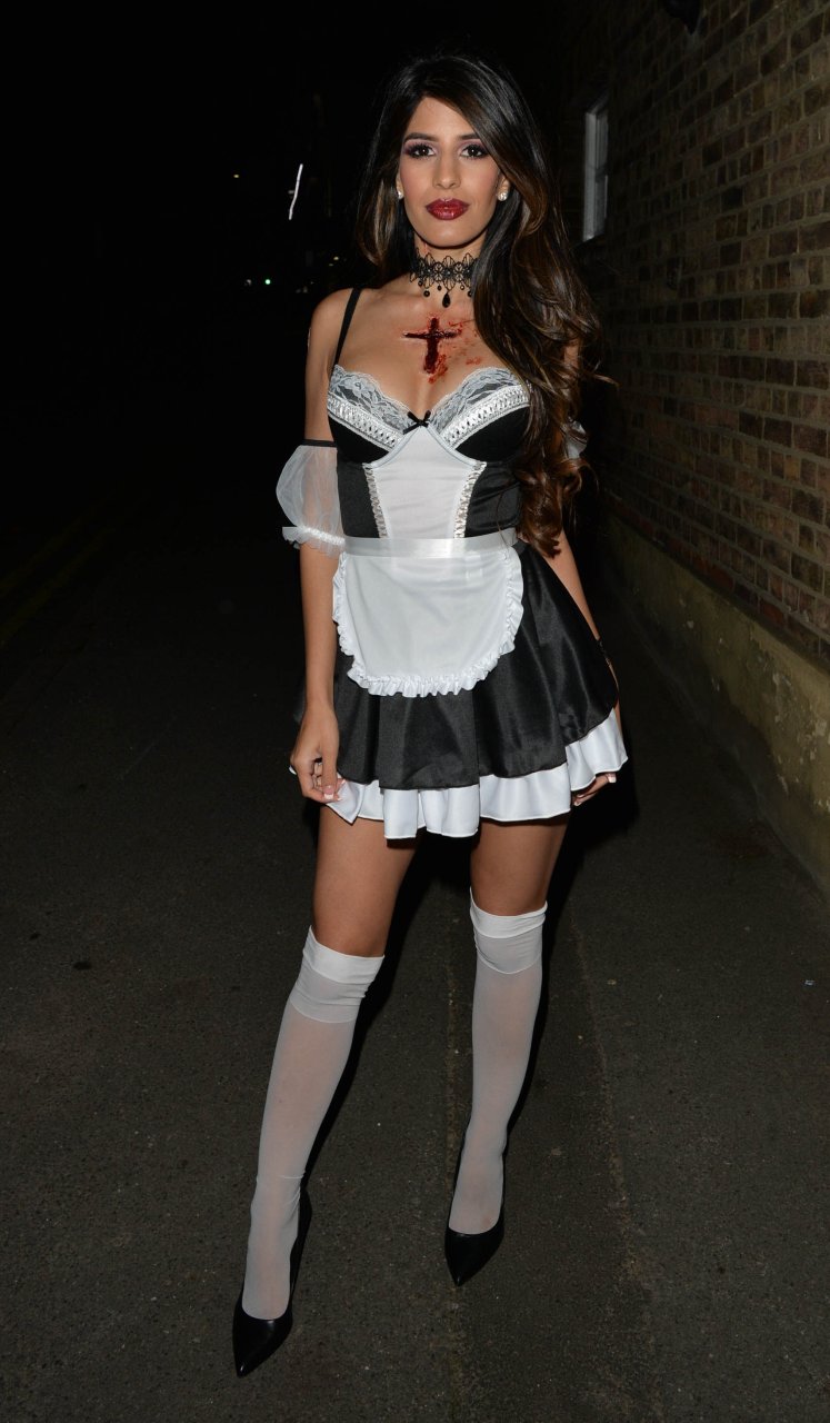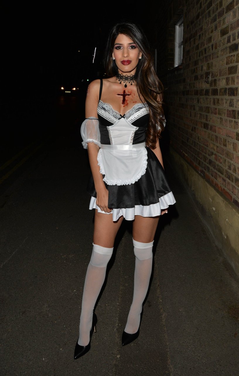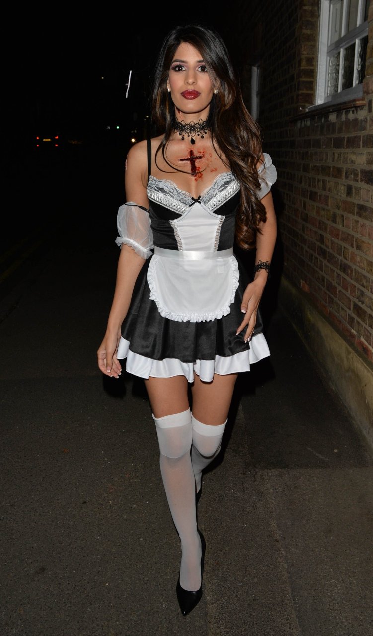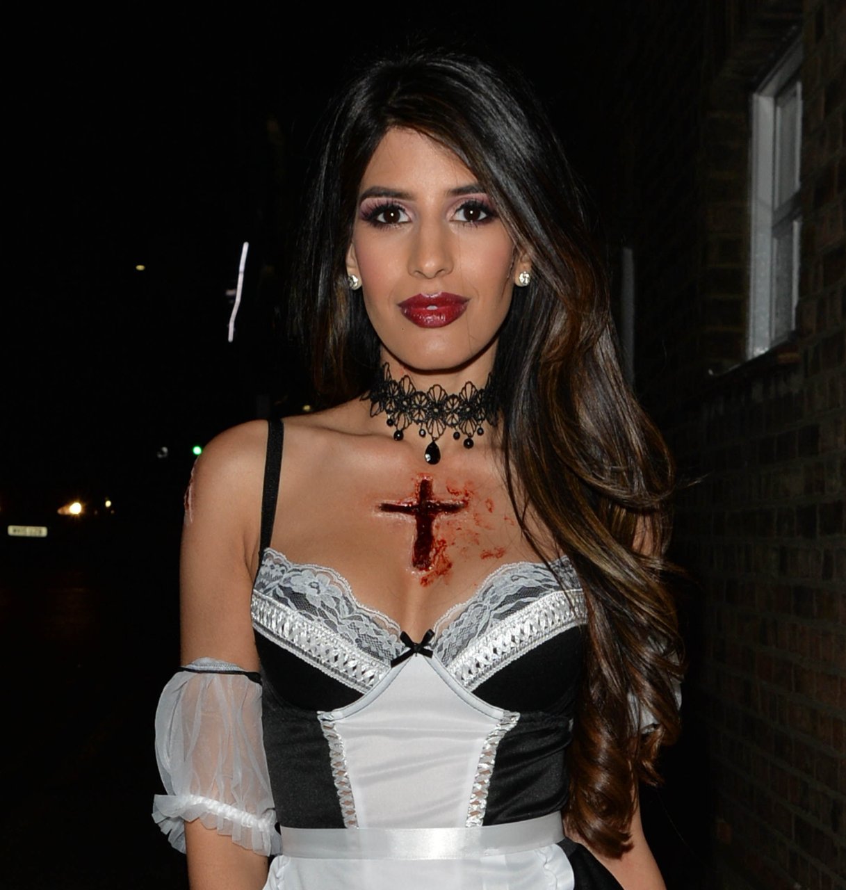 Jasmin Walia fue vista celebrando Halloween con amigos en Londres, 27/10/2018. La estrella de televisión de 26 años llevaba un disfraz de criada muerta con una cruz ensangrentada en el pecho.