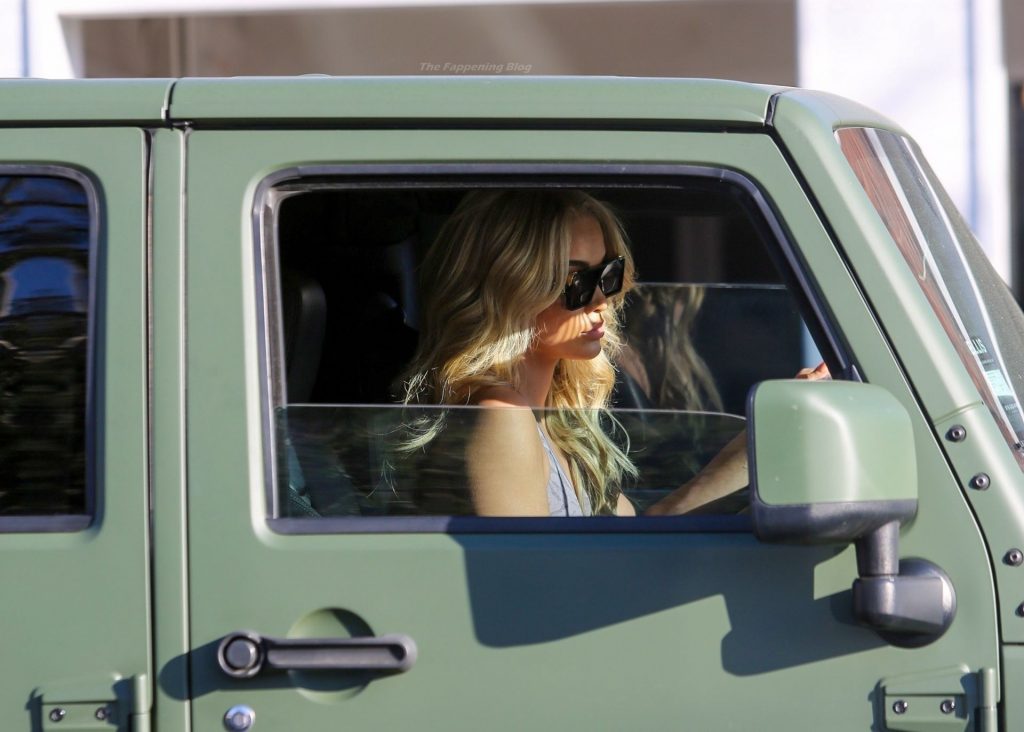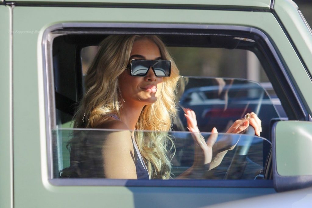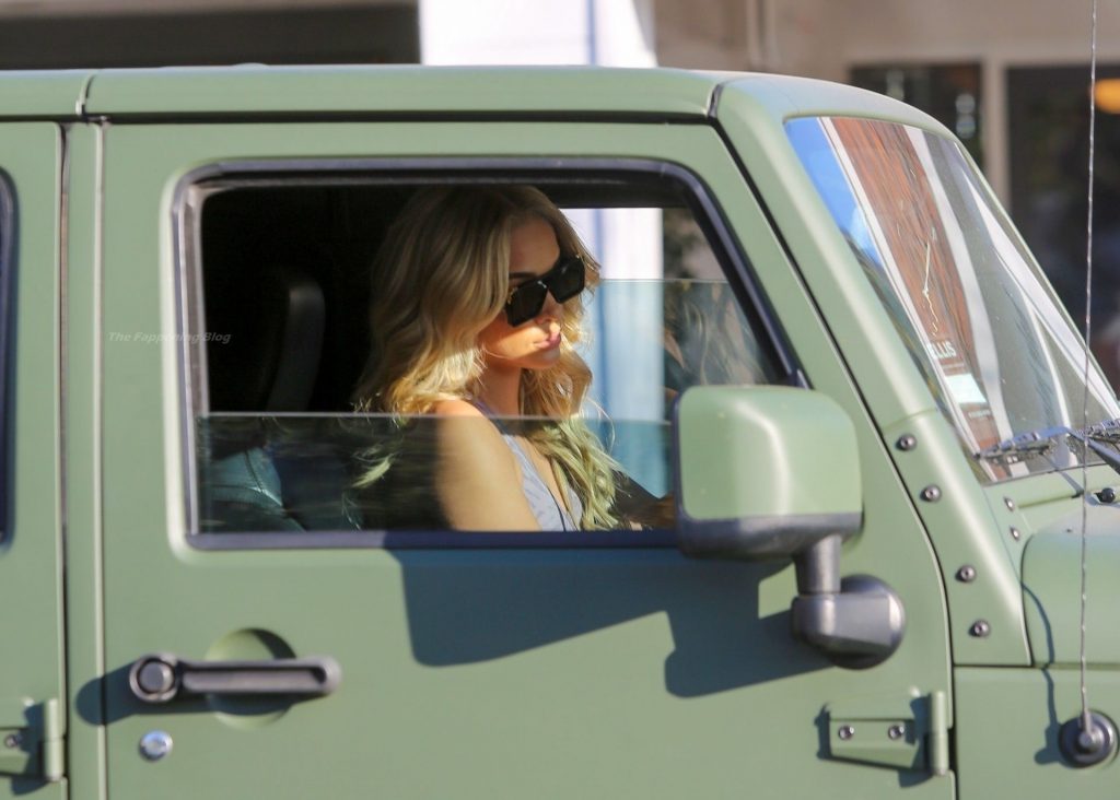 Jasmine Sanders se arregla el cabello en el Salón Zogalis en Bel Air, 23/03/2021. La modelo germano-americana e influencer de moda muestra su abdomen tonificado con un sujetador deportivo y leggings mientras sale del salón en su Jeep verde militar.