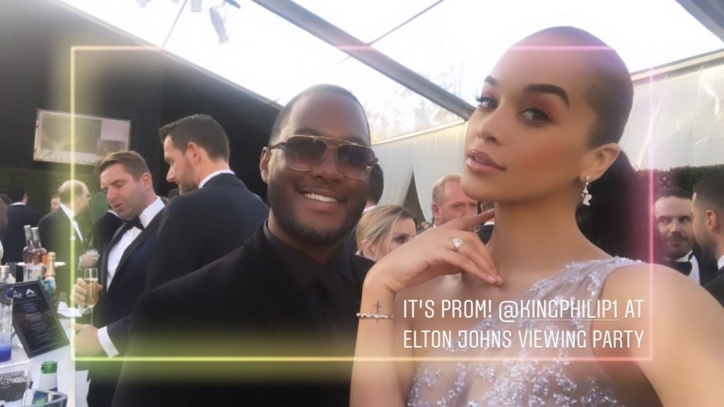 La impresionante modelo Jasmine Sanders luce sus esbeltas piernas con un vestido transparente en la Fiesta de Visualización de los Premios de la Academia de la Fundación Elton John contra el SIDA en West Hollywood, 24/02/2019.