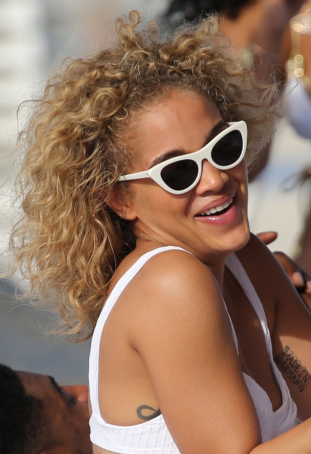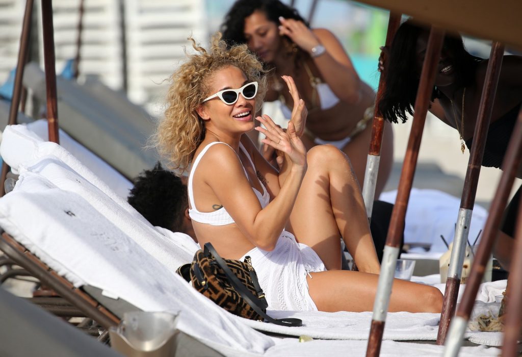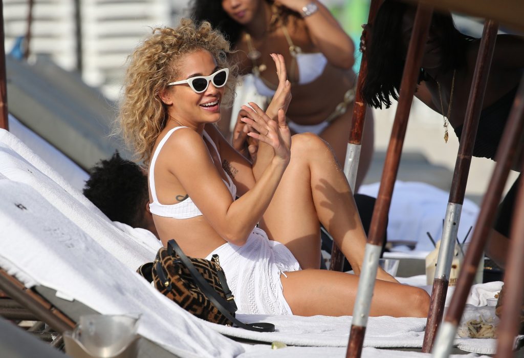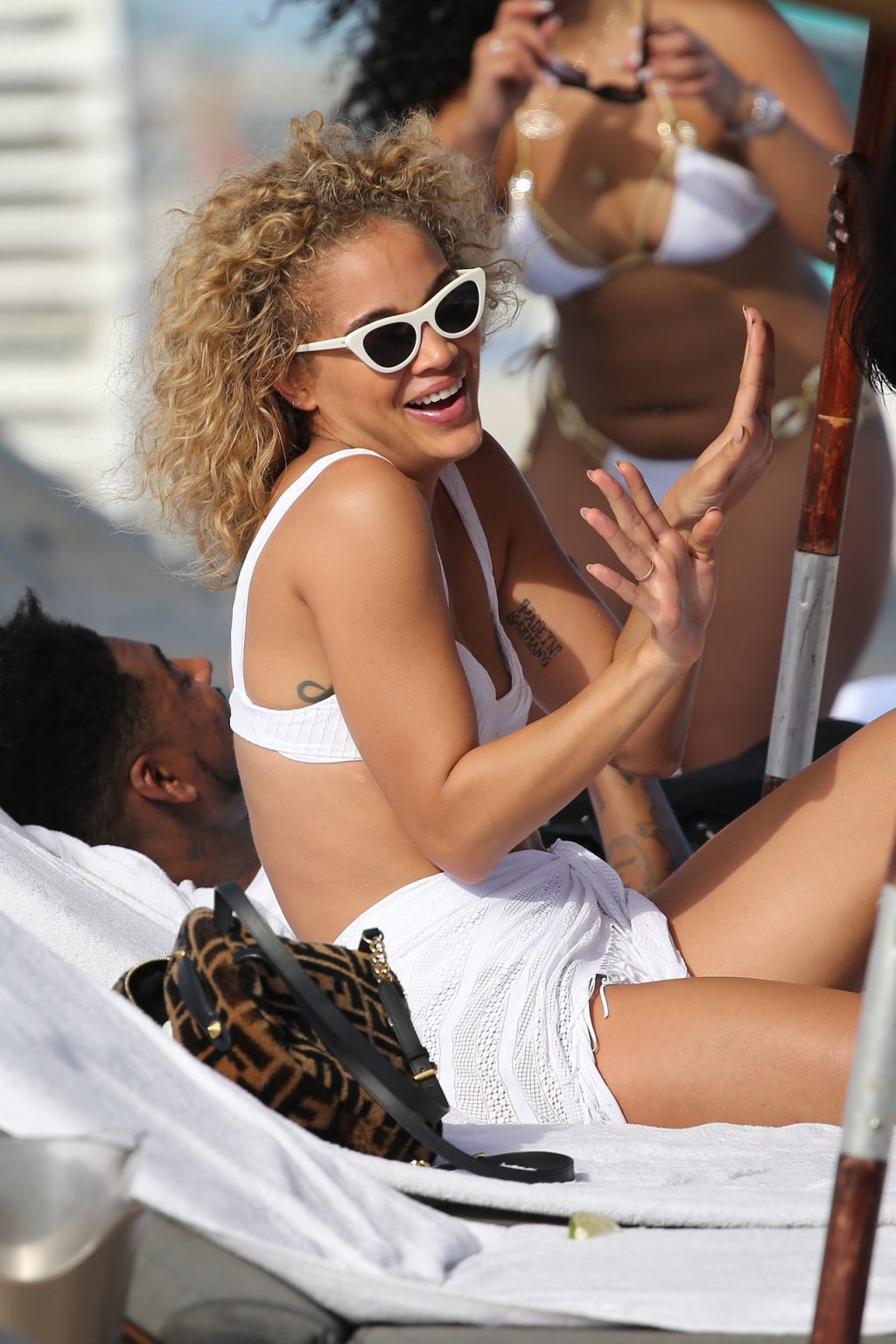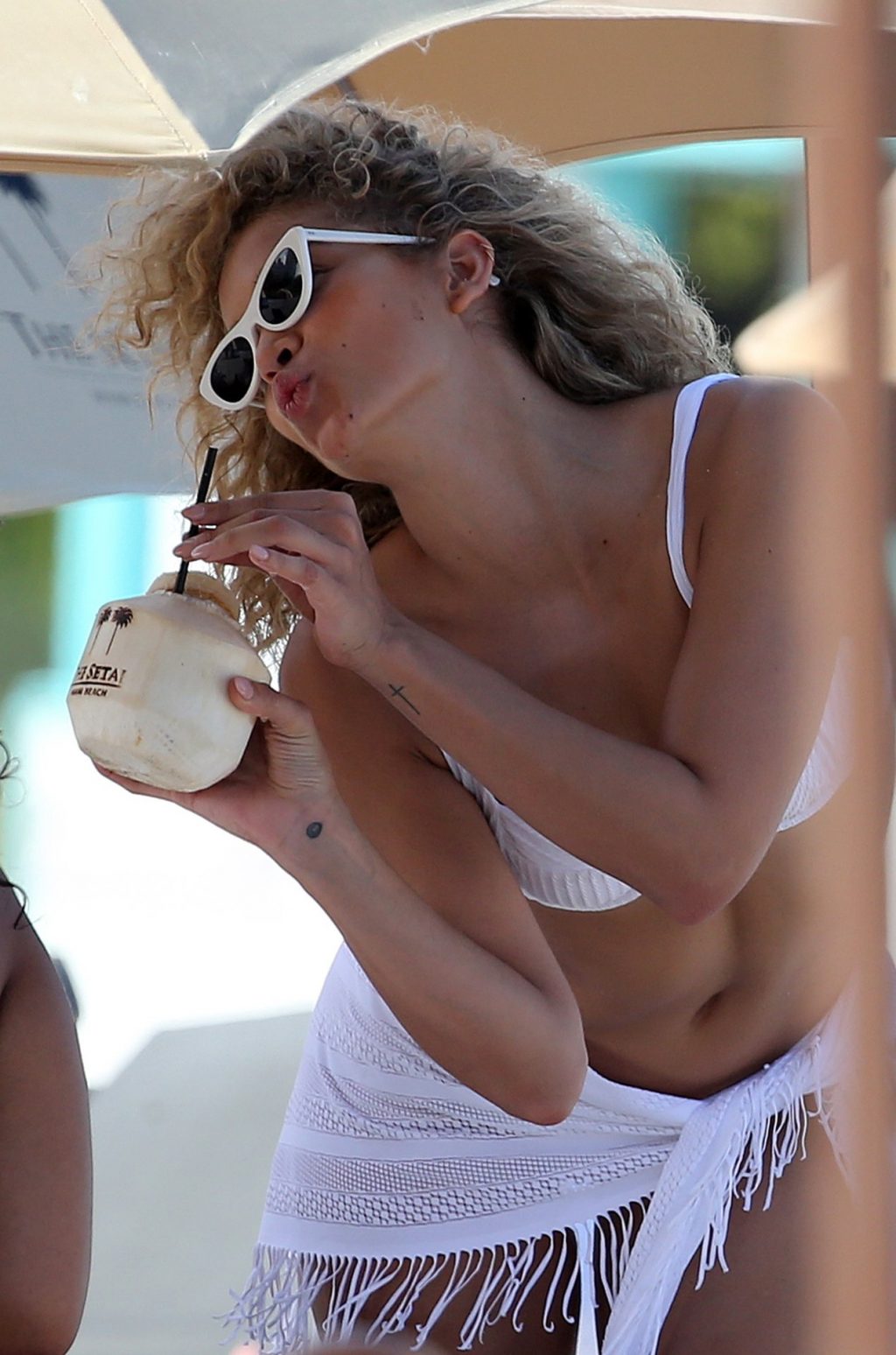 Modelo de Sports Illustrated Swimsuit y actual portada de Maxim Magazine, Jasmine Sanders lleva un bikini blanco en la playa de Miami, 11/12/2019.