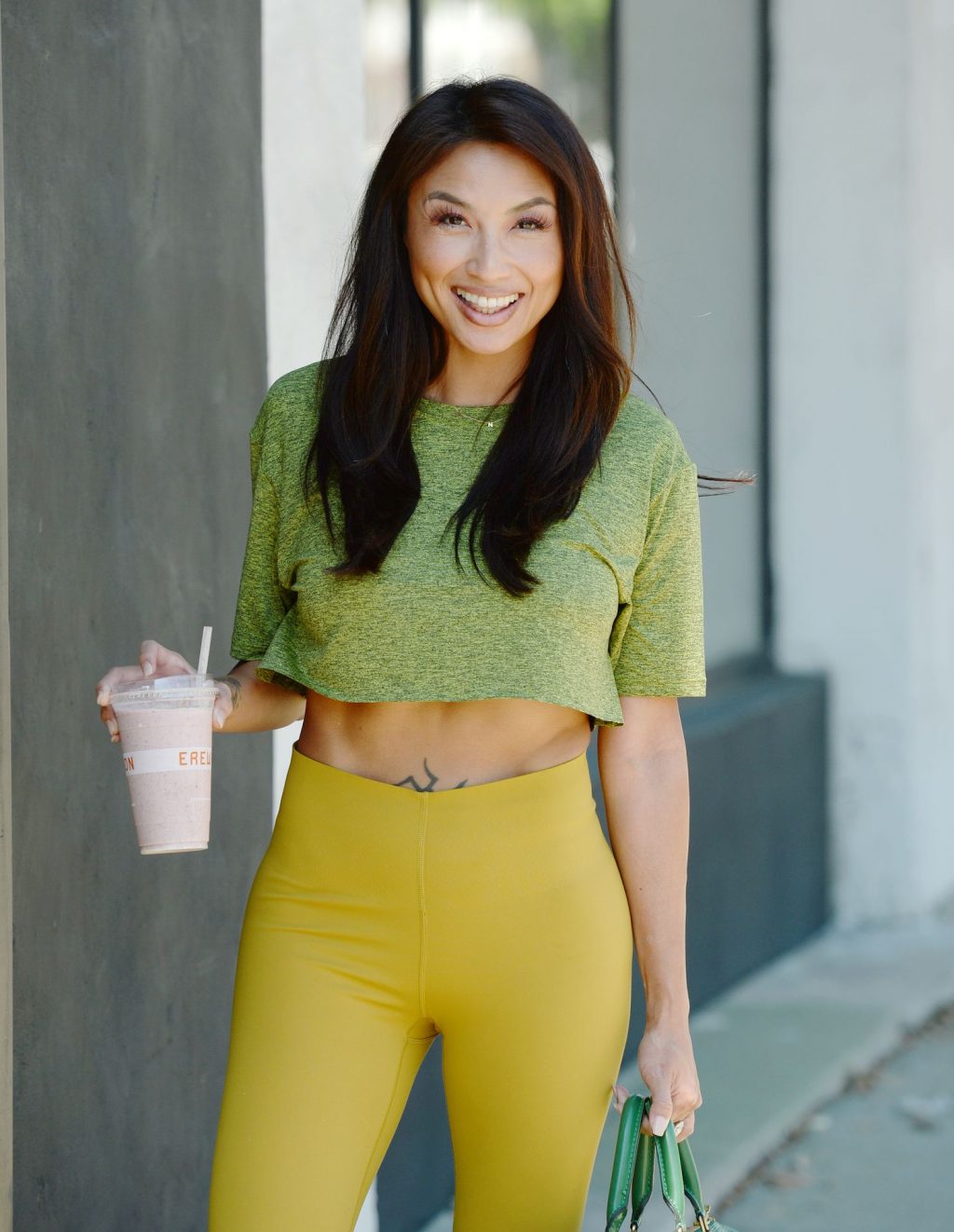 Presentadora de televisión estadounidense Jeannie Mai (41) muestra su bonita sonrisa y abdominales tonificados al llegar al estudio de baile en Los Ángeles, 15/10/2020.