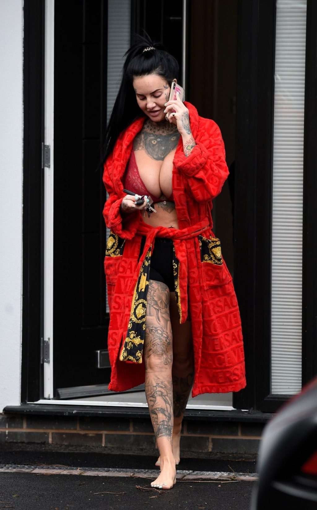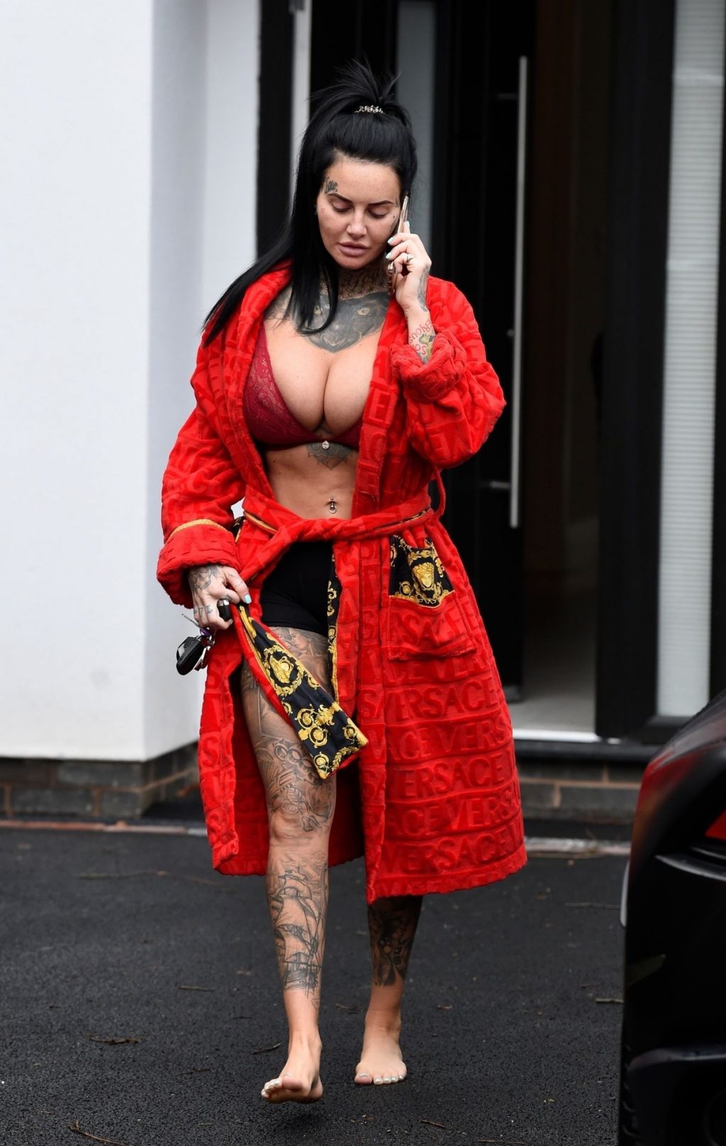 “Celebrity Big Brother” y la estrella de “Ex On The Beach” Jemma Lucy fue vista sacando el cochecito de su bebé de su coche solo con su bata y shorts ajustados antes de volver a entrar – Manchester, 01/05/2020.