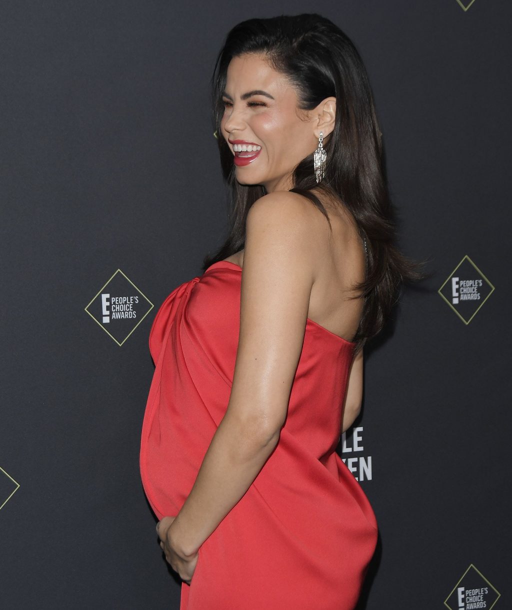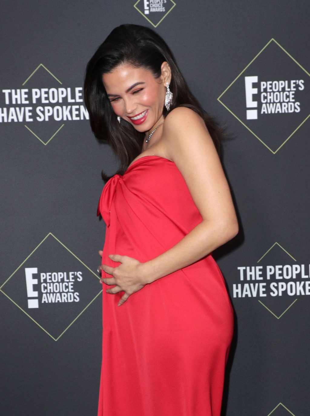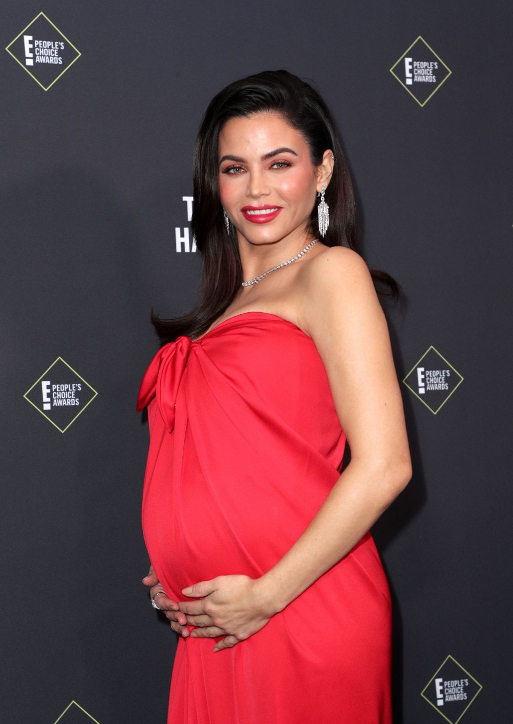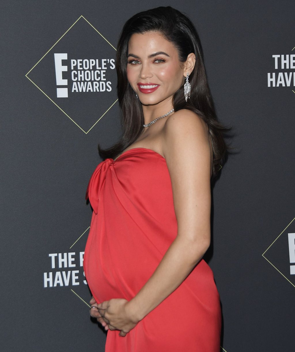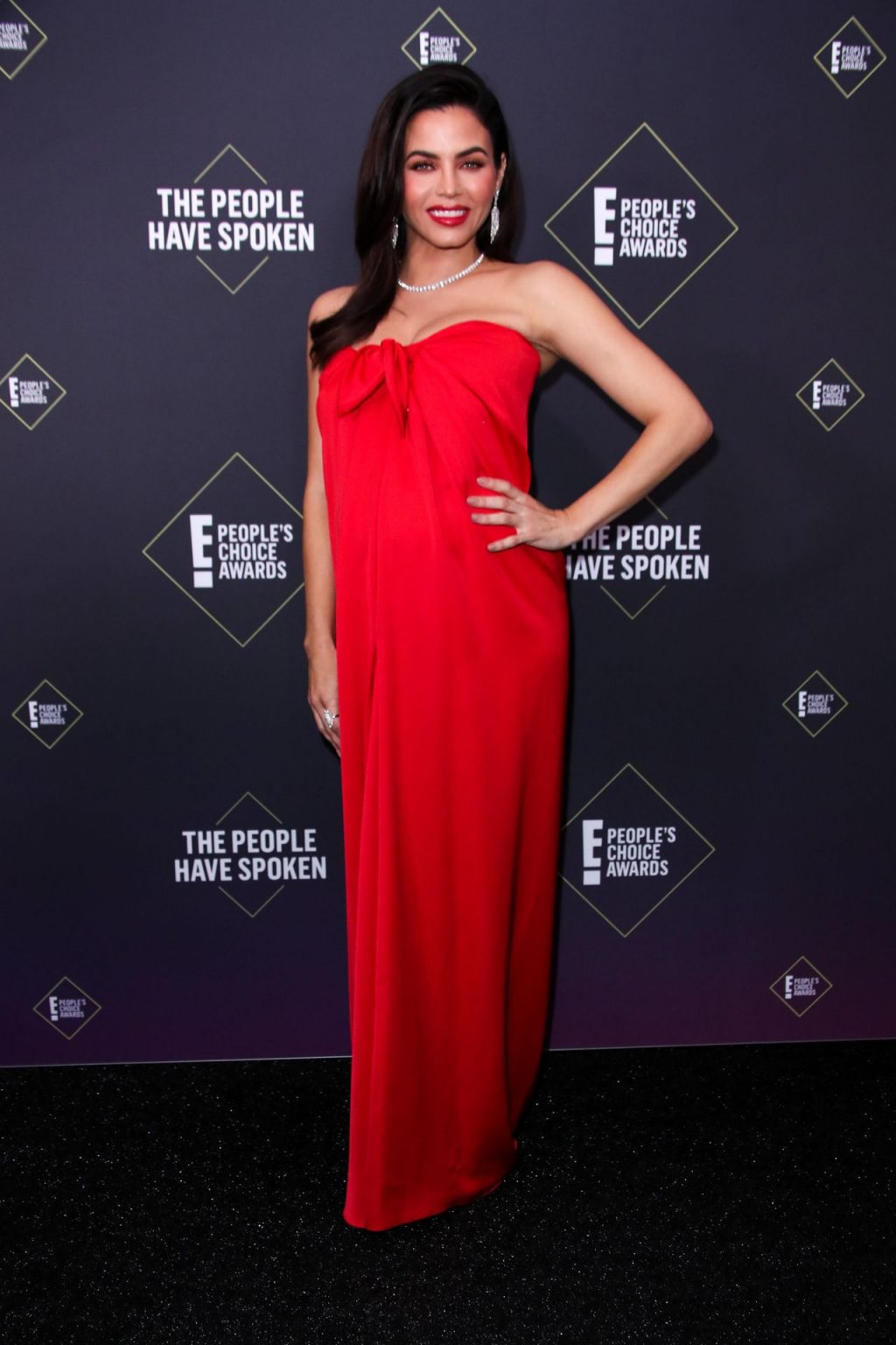 Jenna Dewan embarazada posa con un vestido rojo en la sala de prensa durante los Premios People’s Choice 2019 de E! en Barker Hangar en Santa Mónica, 10/11/2019.