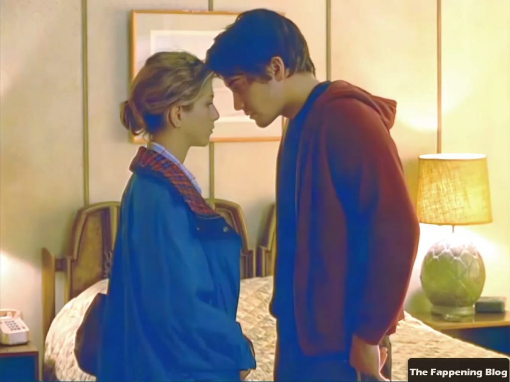 Jennifer Aniston está besando a un chico junto a una cama antes de que la veamos topless de espaldas mientras ella y el chico tienen sexo vigoroso. Vemos sus pechos de lado, ocasionalmente bloqueados por el brazo de él, pero se ven parches cubriendo sus pezones.