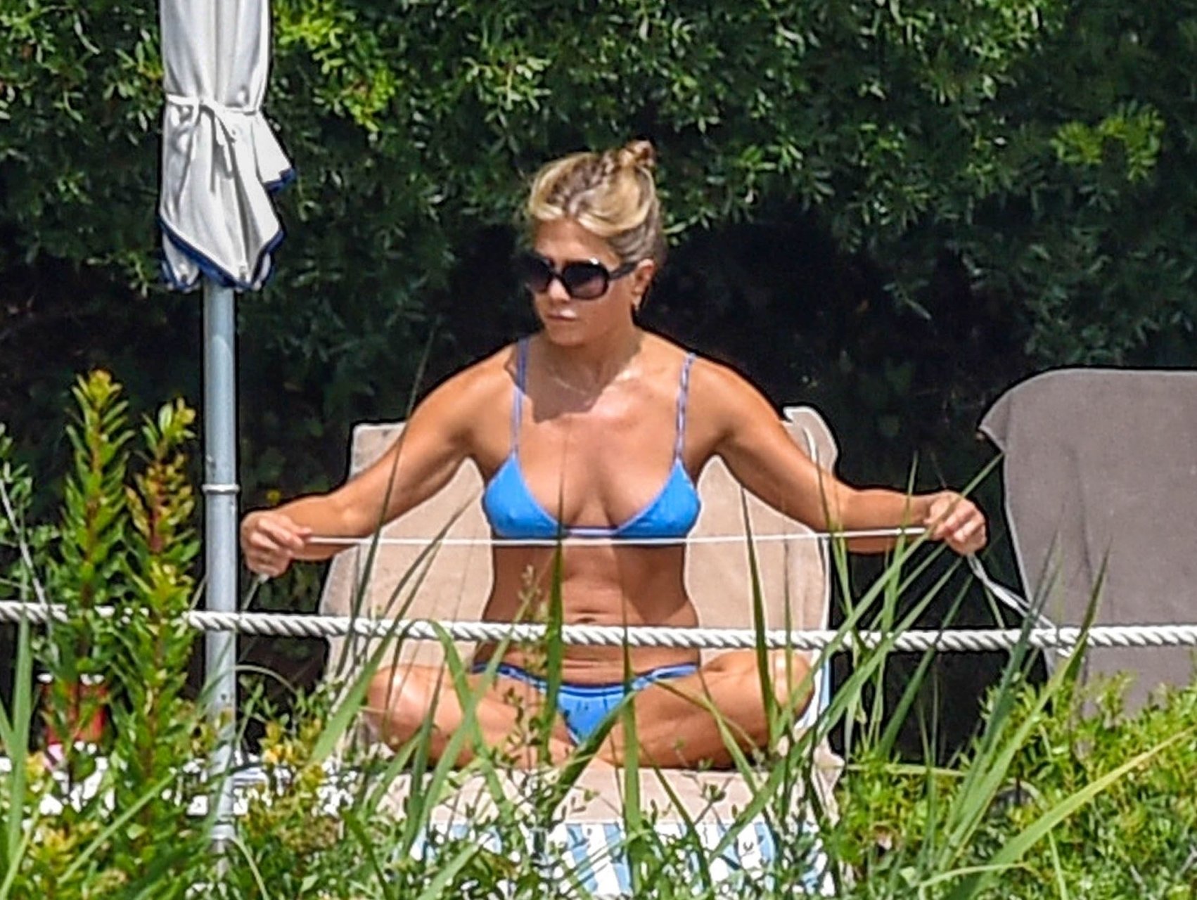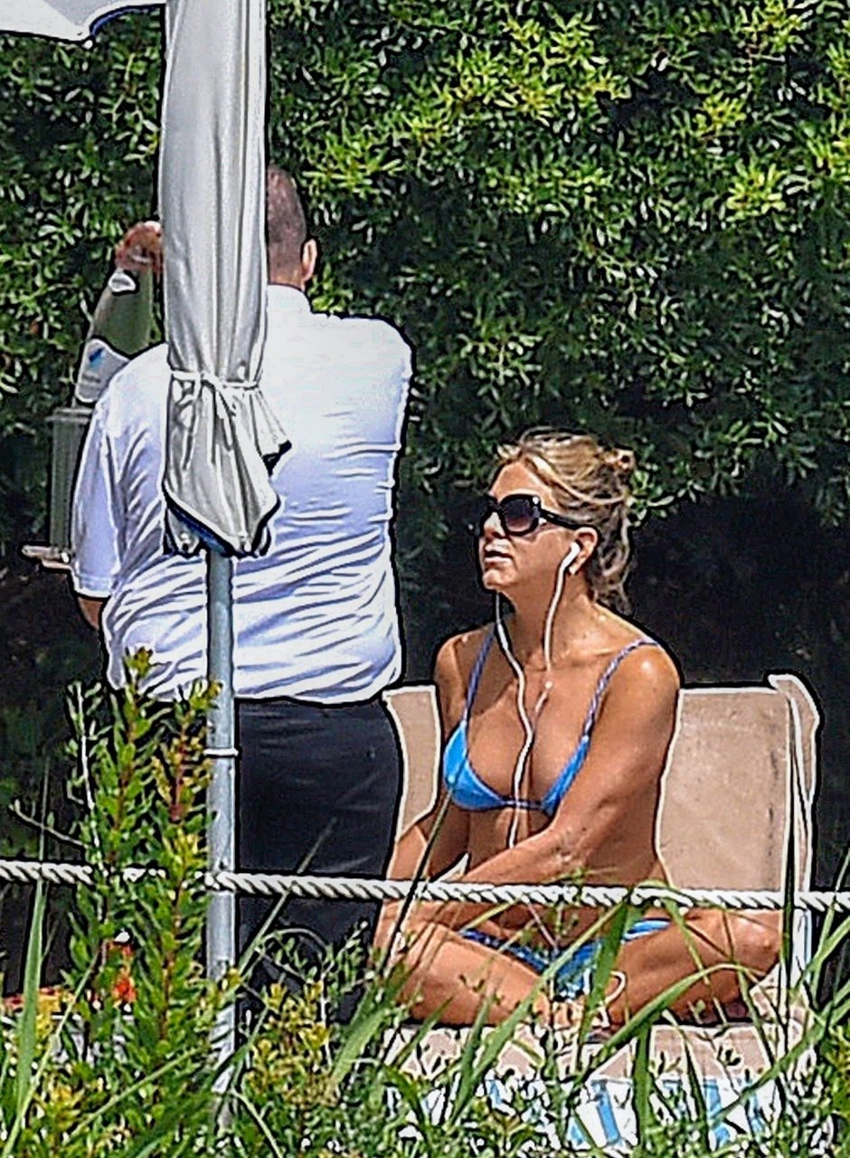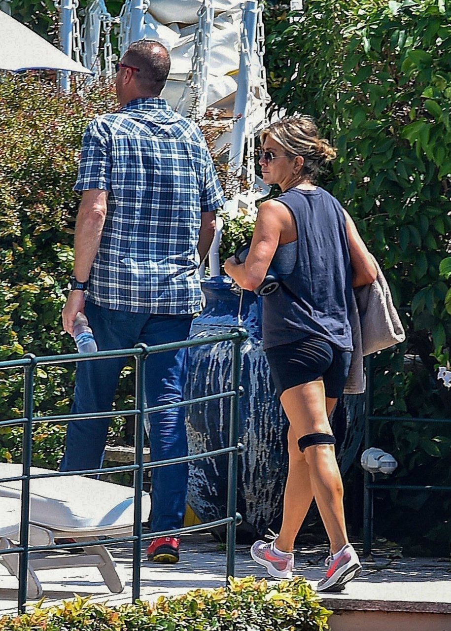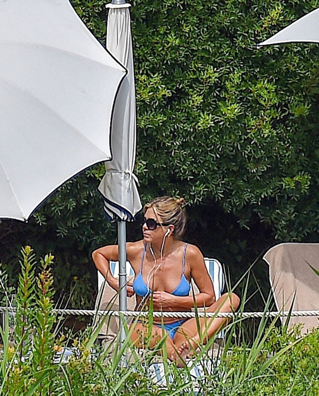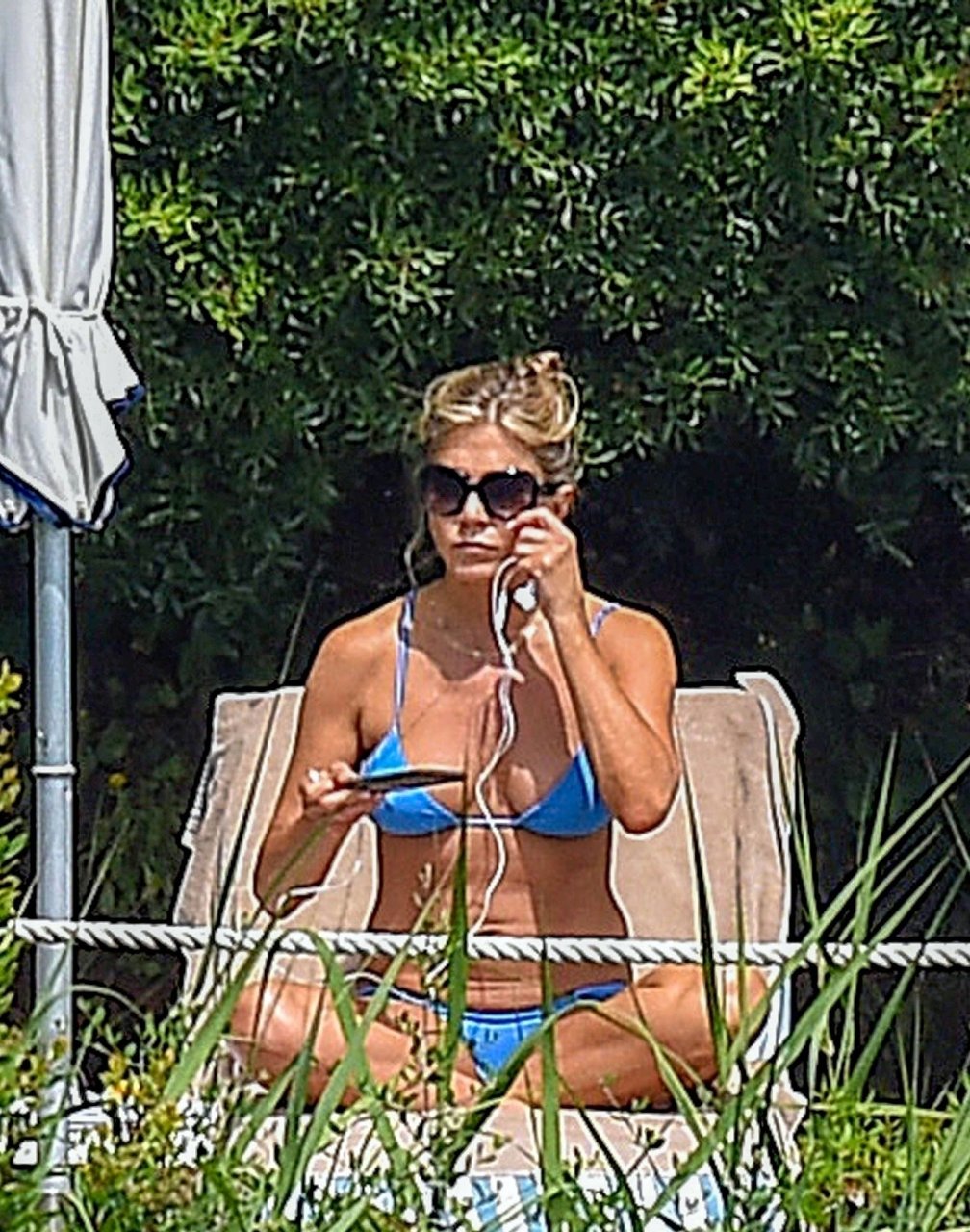 La actriz estadounidense Jennifer Aniston (49) muestra su cuerpo tonificado en bikini mientras es fotografiada relajándose junto a la piscina en Portofino antes de que comiencen las filmaciones de su nueva película “Murder Mystery”, 22/07/2018.