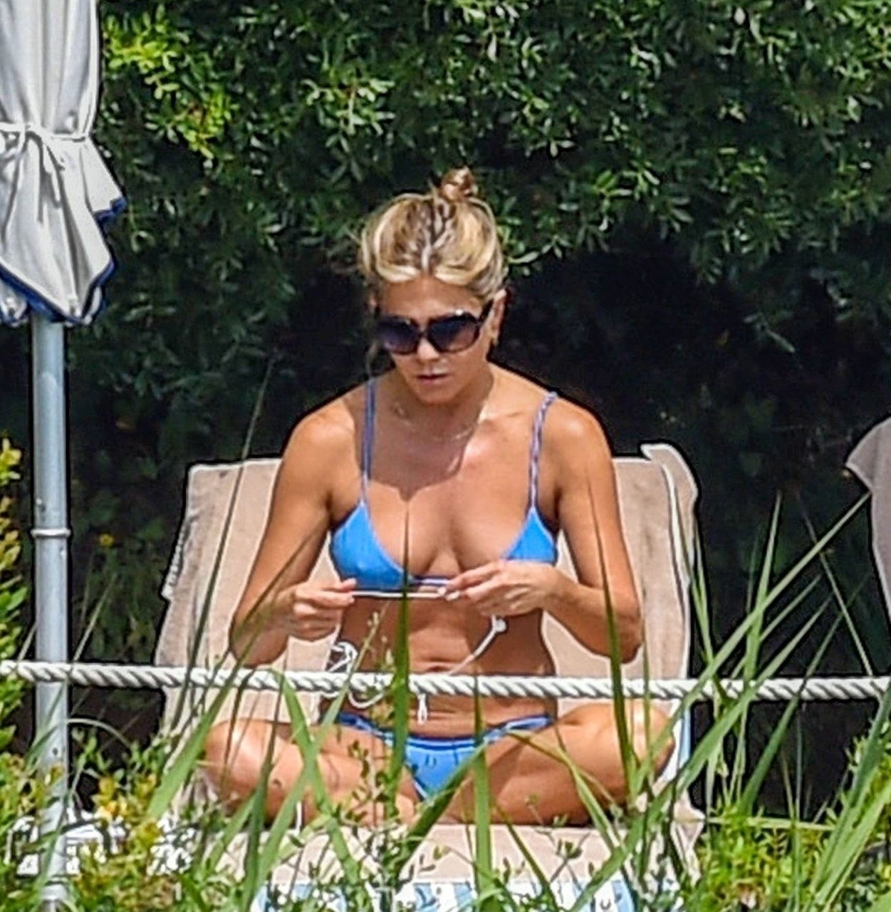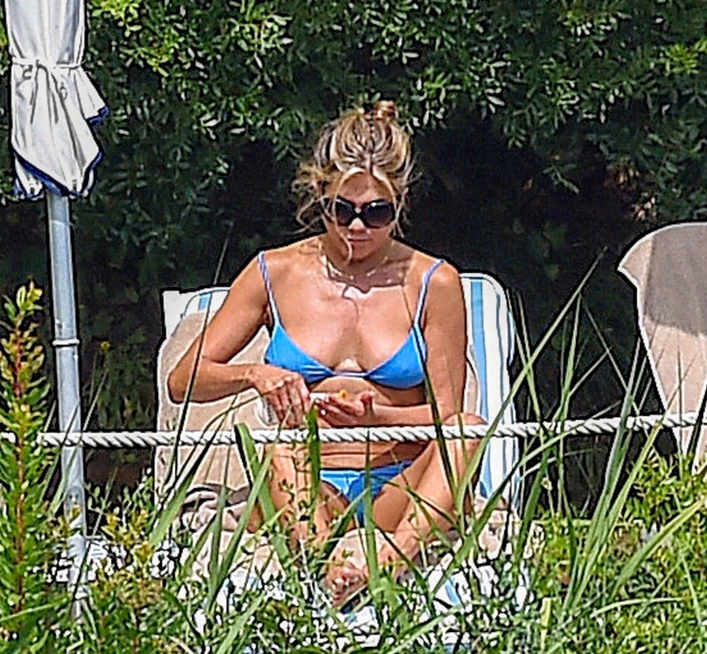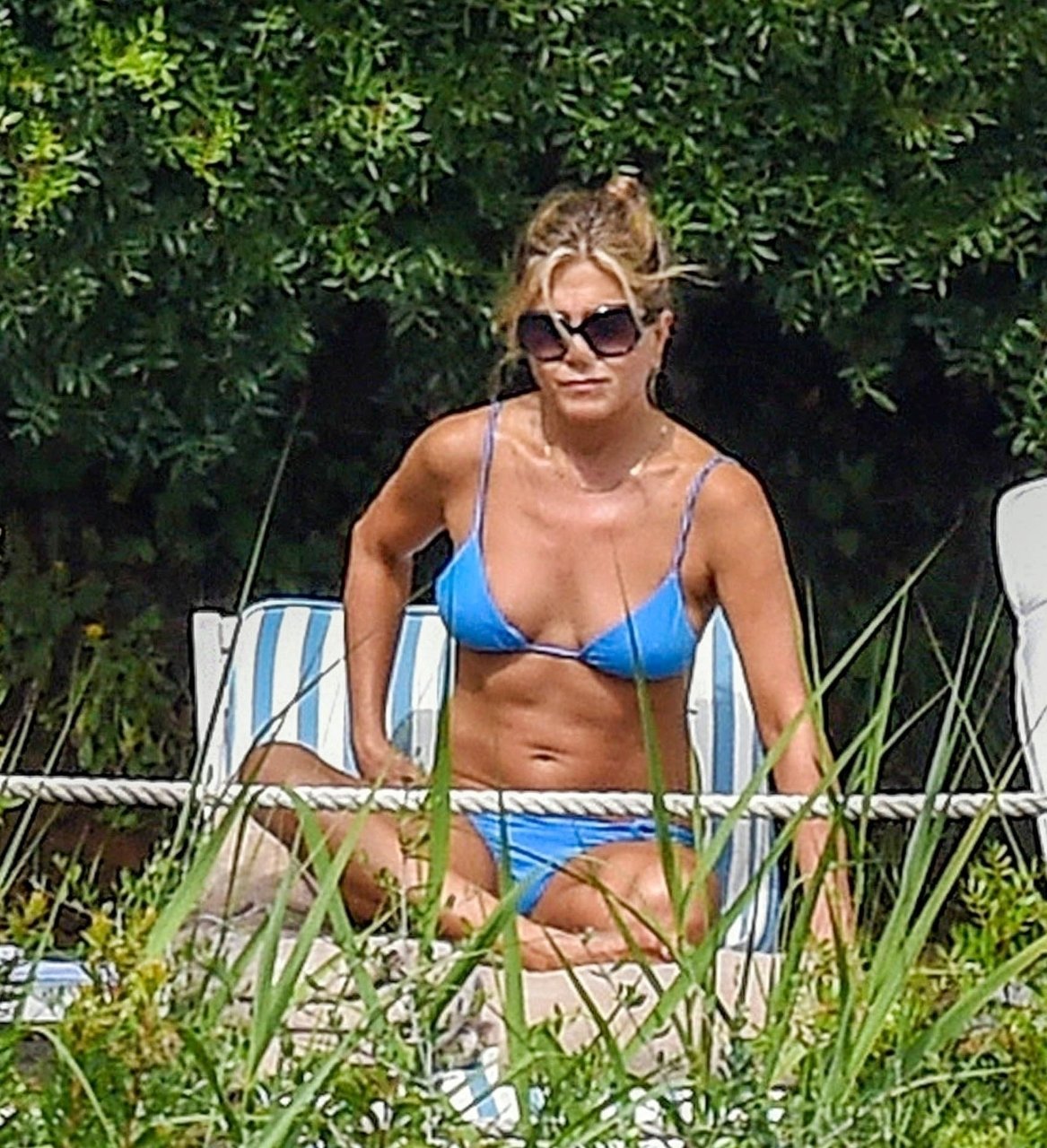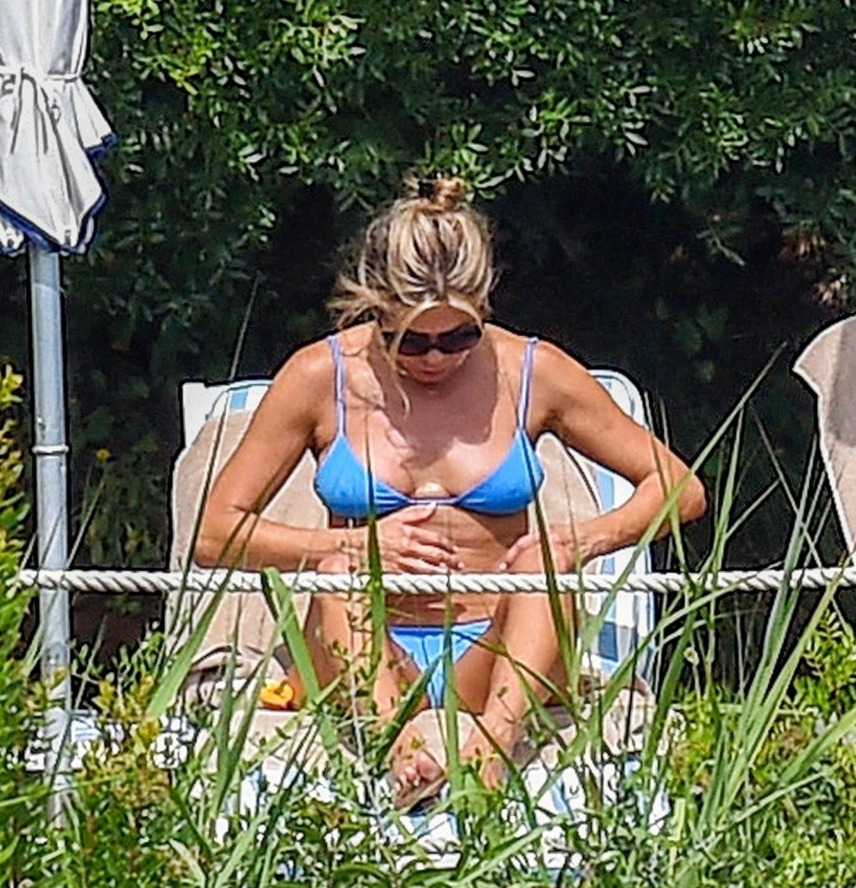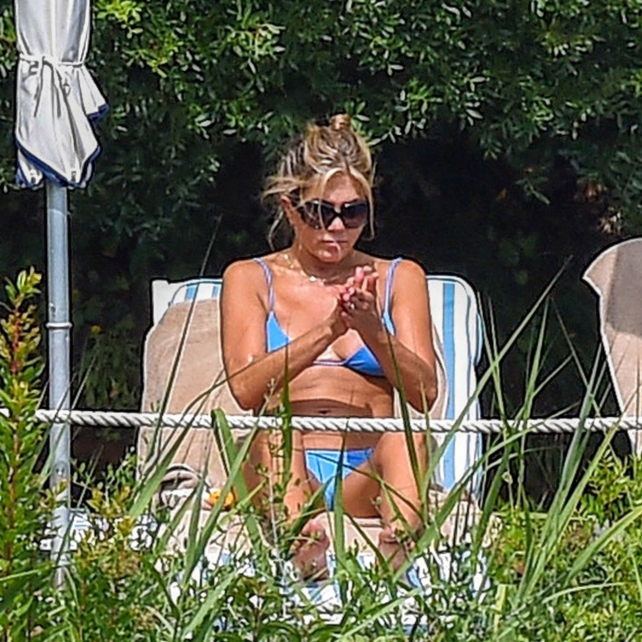 La actriz estadounidense Jennifer Aniston (49) muestra su cuerpo tonificado en bikini mientras es fotografiada relajándose junto a la piscina en Portofino antes de que comiencen las filmaciones de su nueva película “Murder Mystery”, 22/07/2018.
