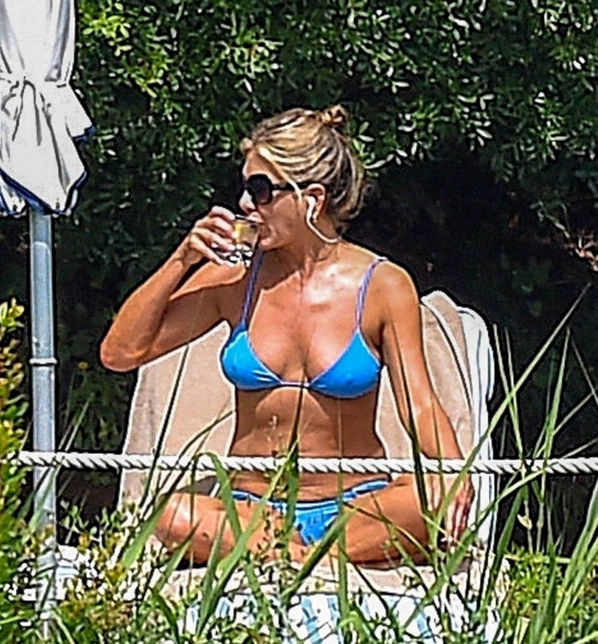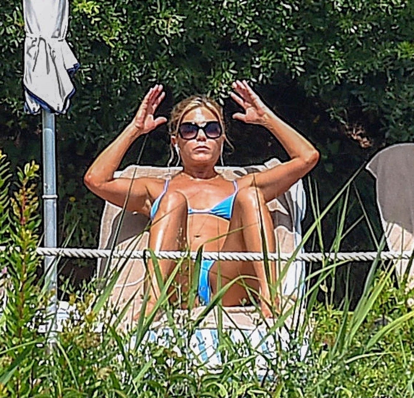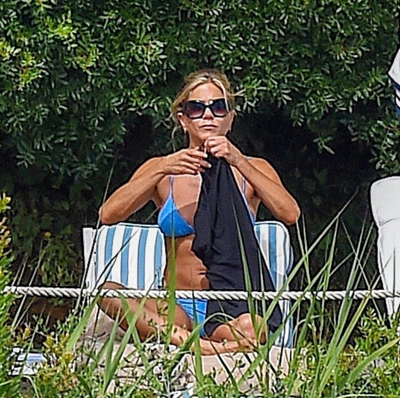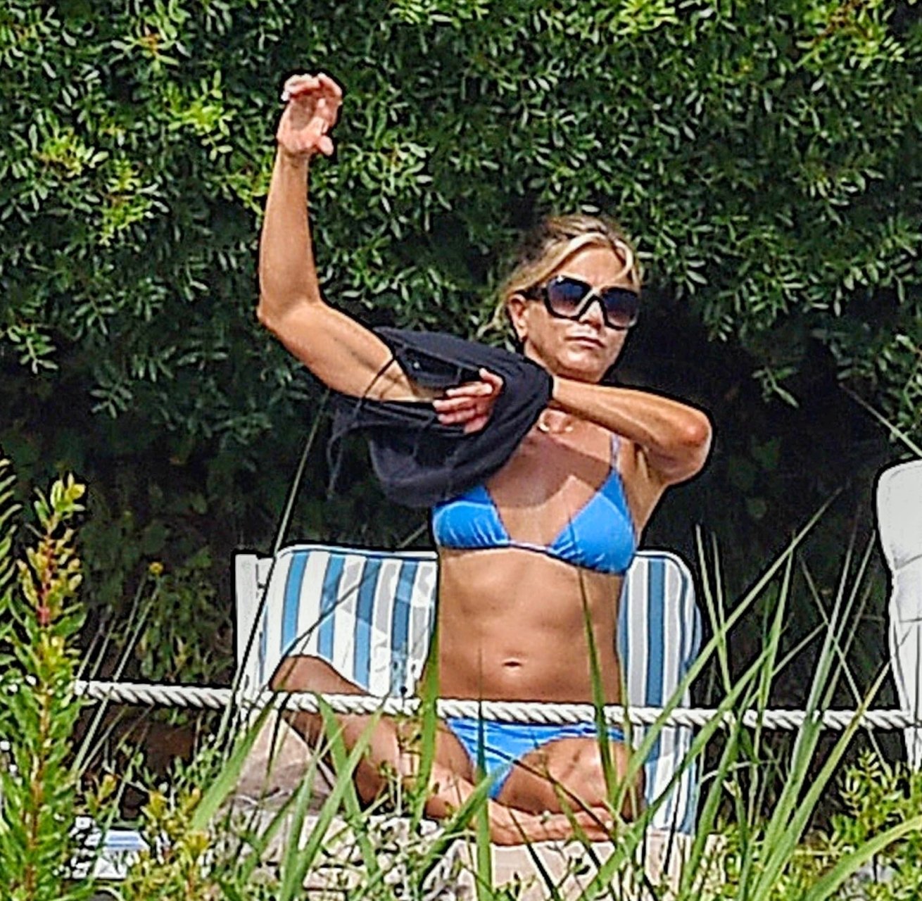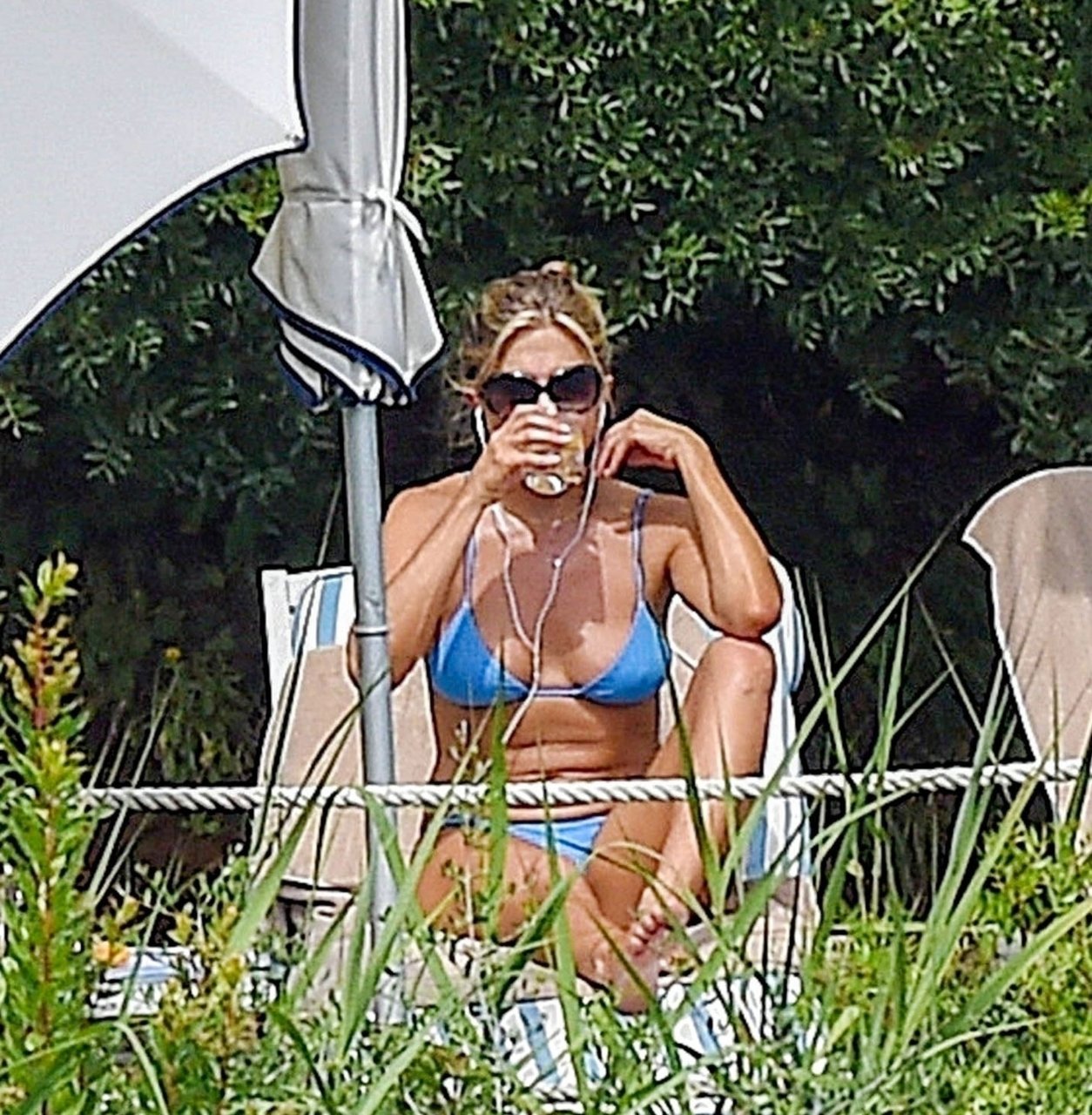 La actriz estadounidense Jennifer Aniston (49) muestra su cuerpo tonificado en bikini mientras es fotografiada relajándose junto a la piscina en Portofino antes de que comiencen las filmaciones de su nueva película “Murder Mystery”, 22/07/2018.