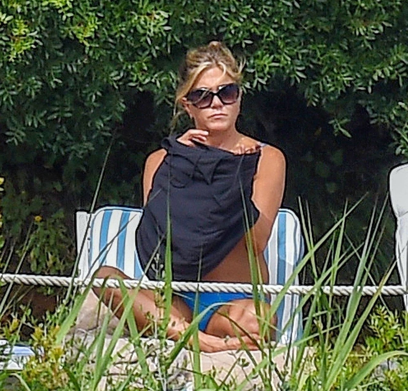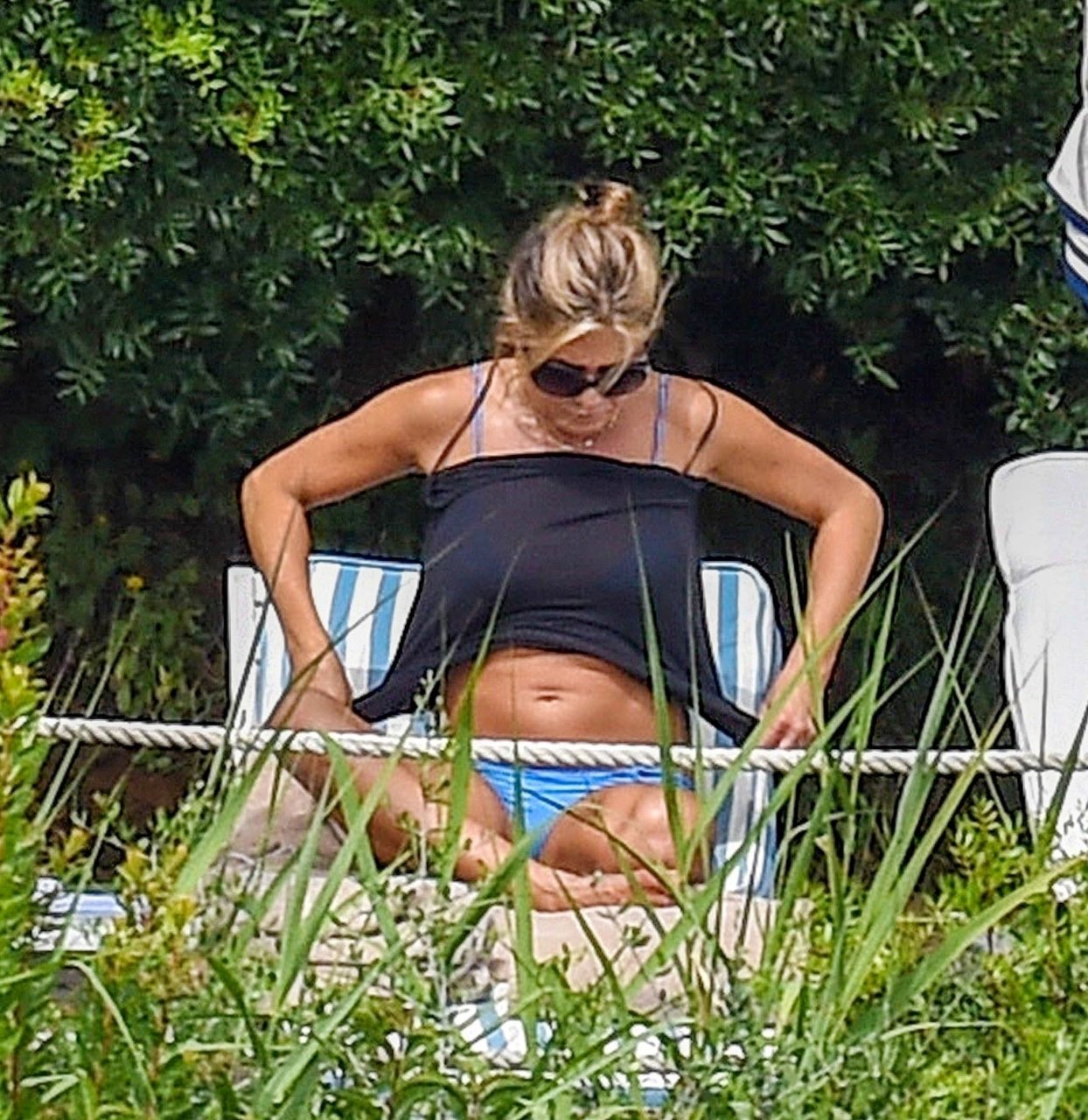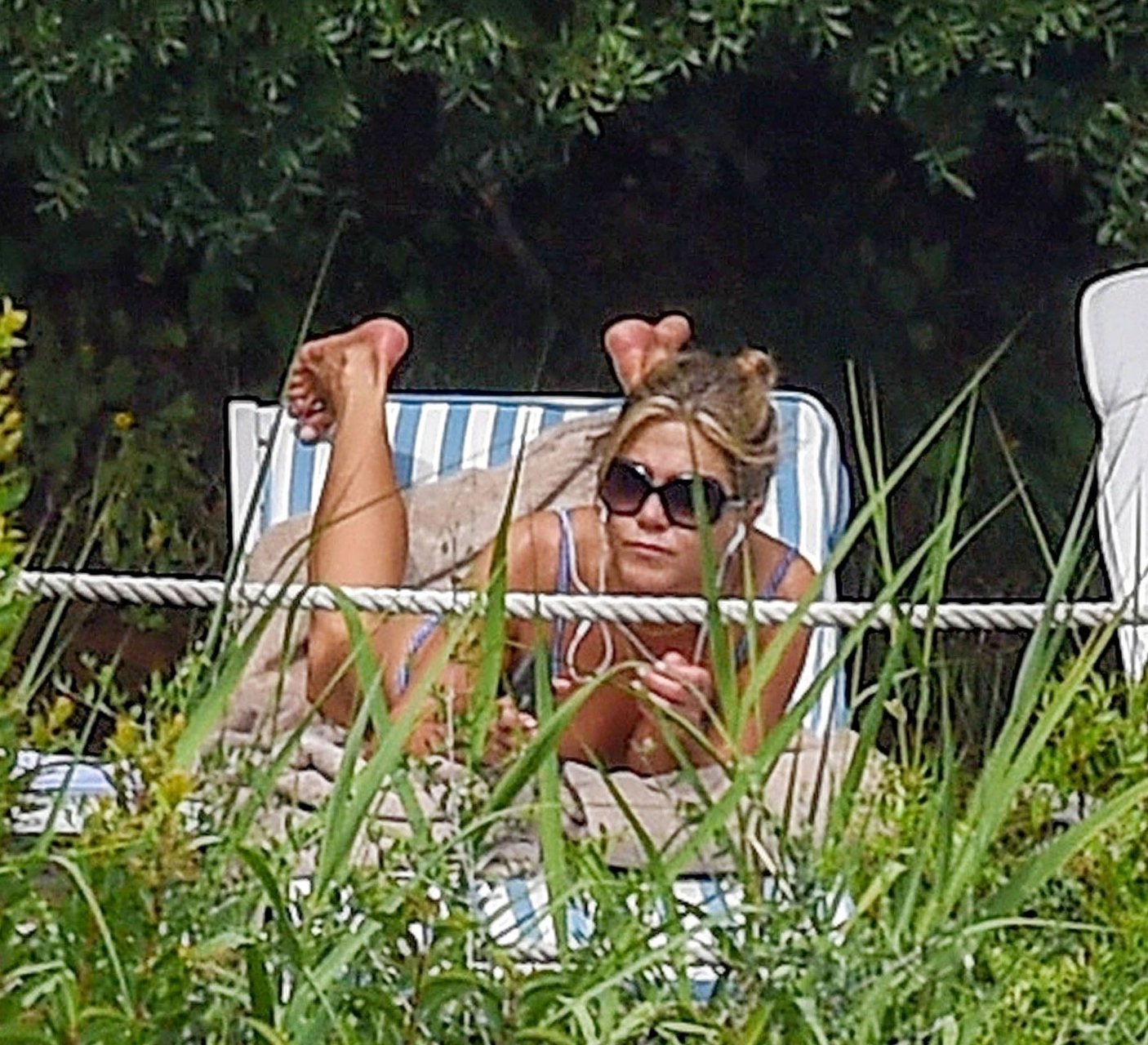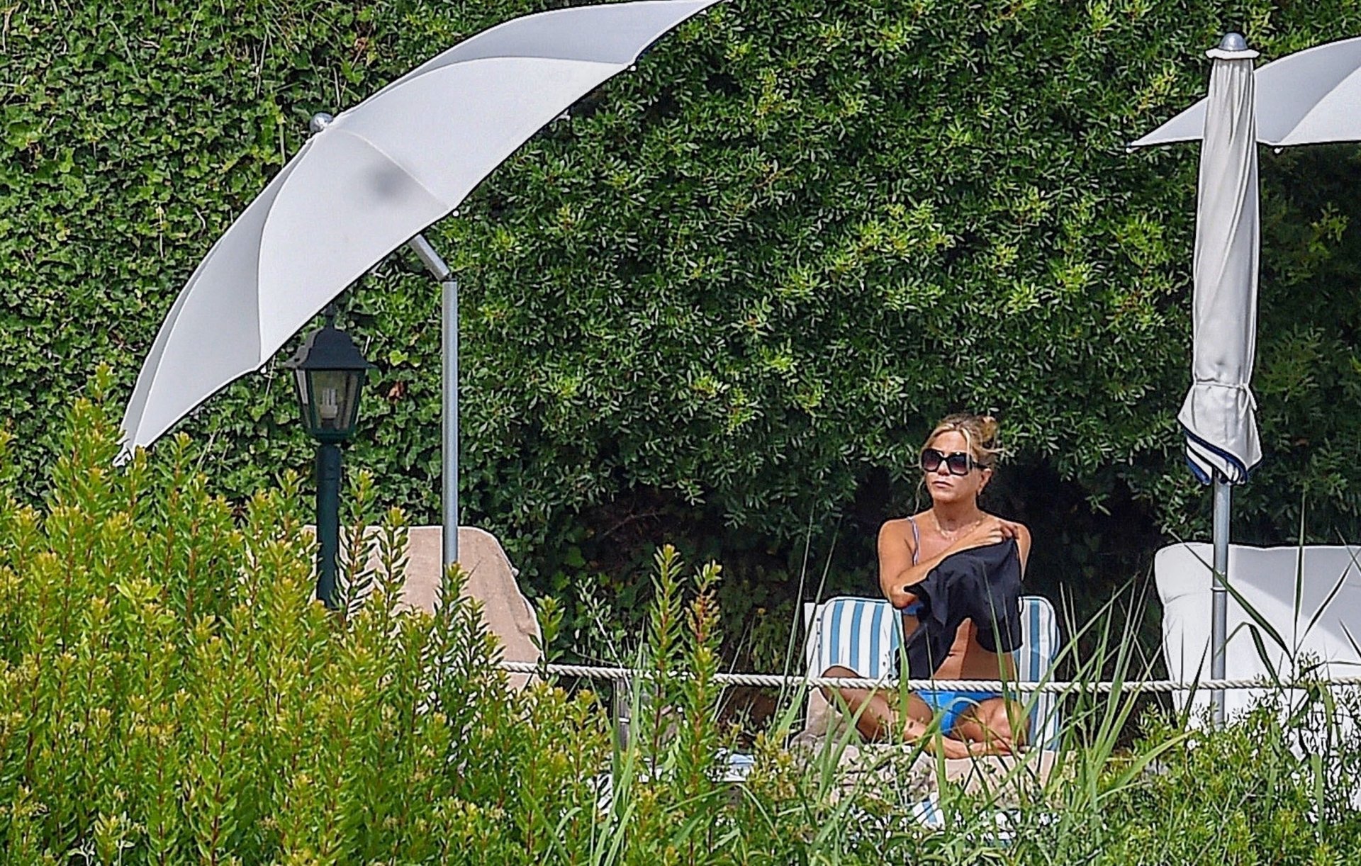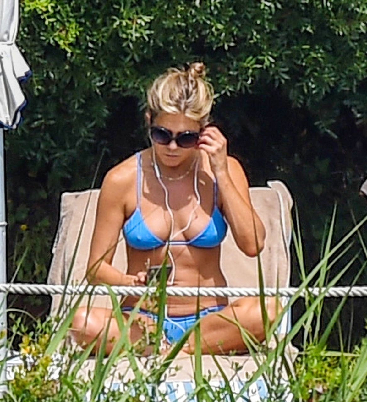 La actriz estadounidense Jennifer Aniston (49) muestra su cuerpo tonificado en bikini mientras es fotografiada relajándose junto a la piscina en Portofino antes de que comiencen las filmaciones de su nueva película “Murder Mystery”, 22/07/2018.