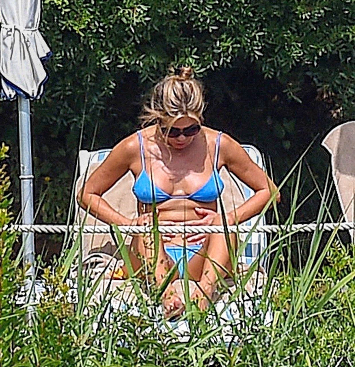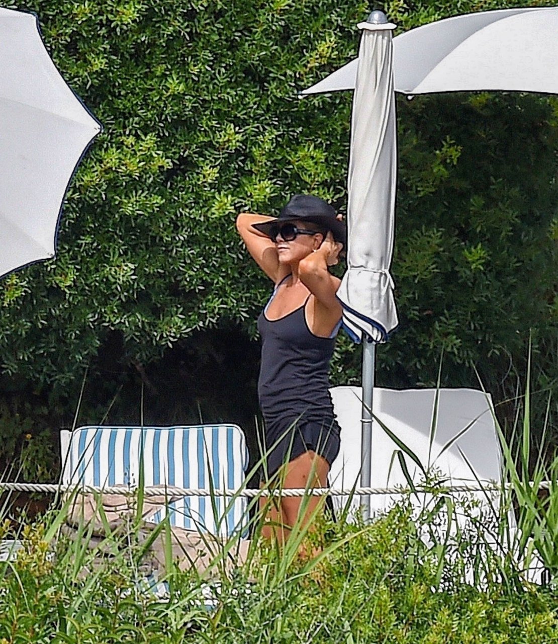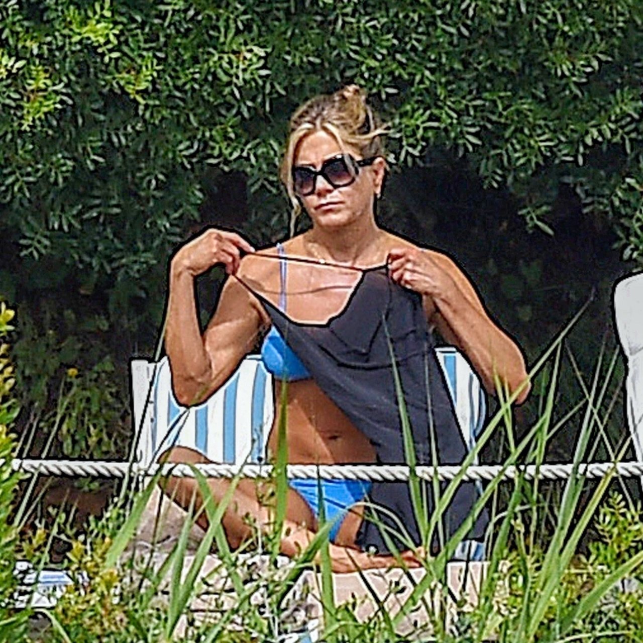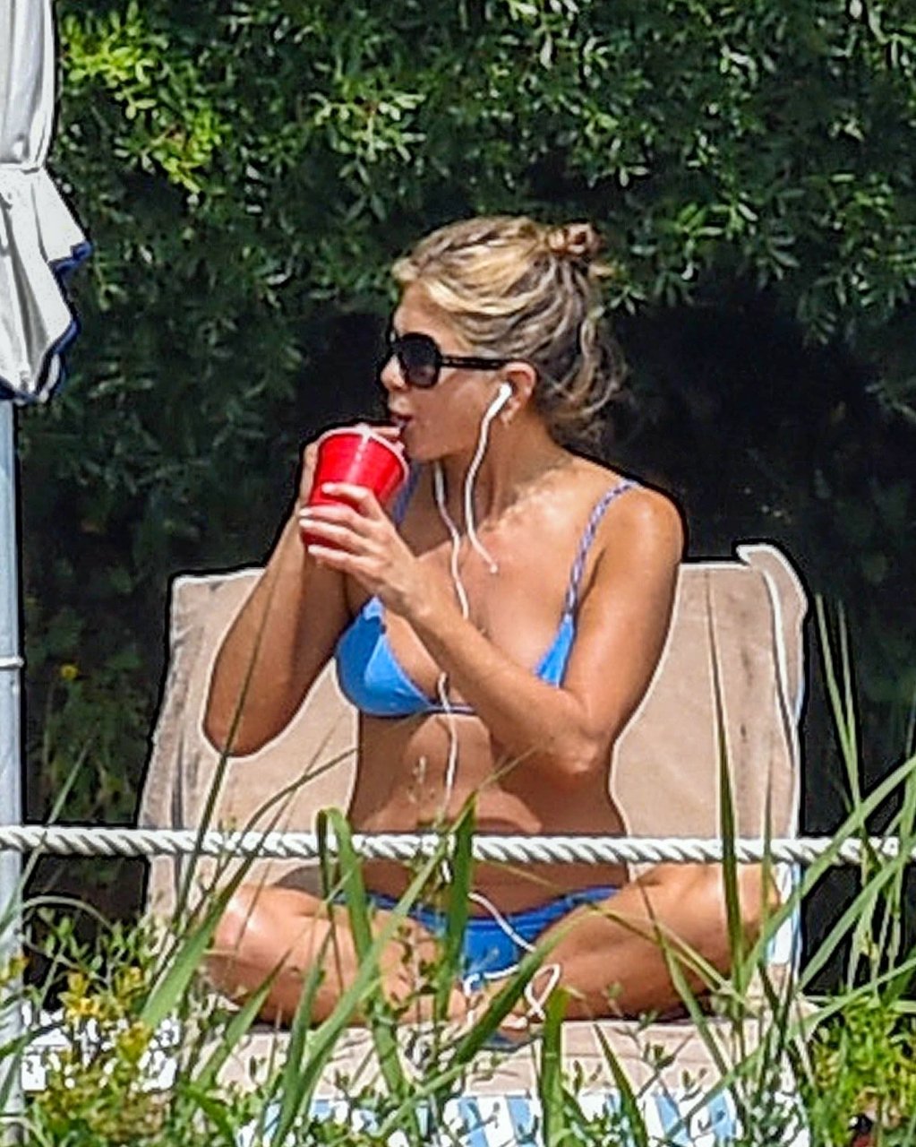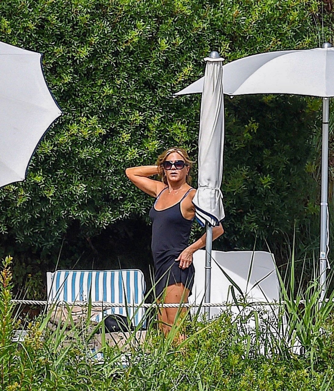 La actriz estadounidense Jennifer Aniston (49) muestra su cuerpo tonificado en bikini mientras es fotografiada relajándose junto a la piscina en Portofino antes de que comiencen las filmaciones de su nueva película “Murder Mystery”, 22/07/2018.