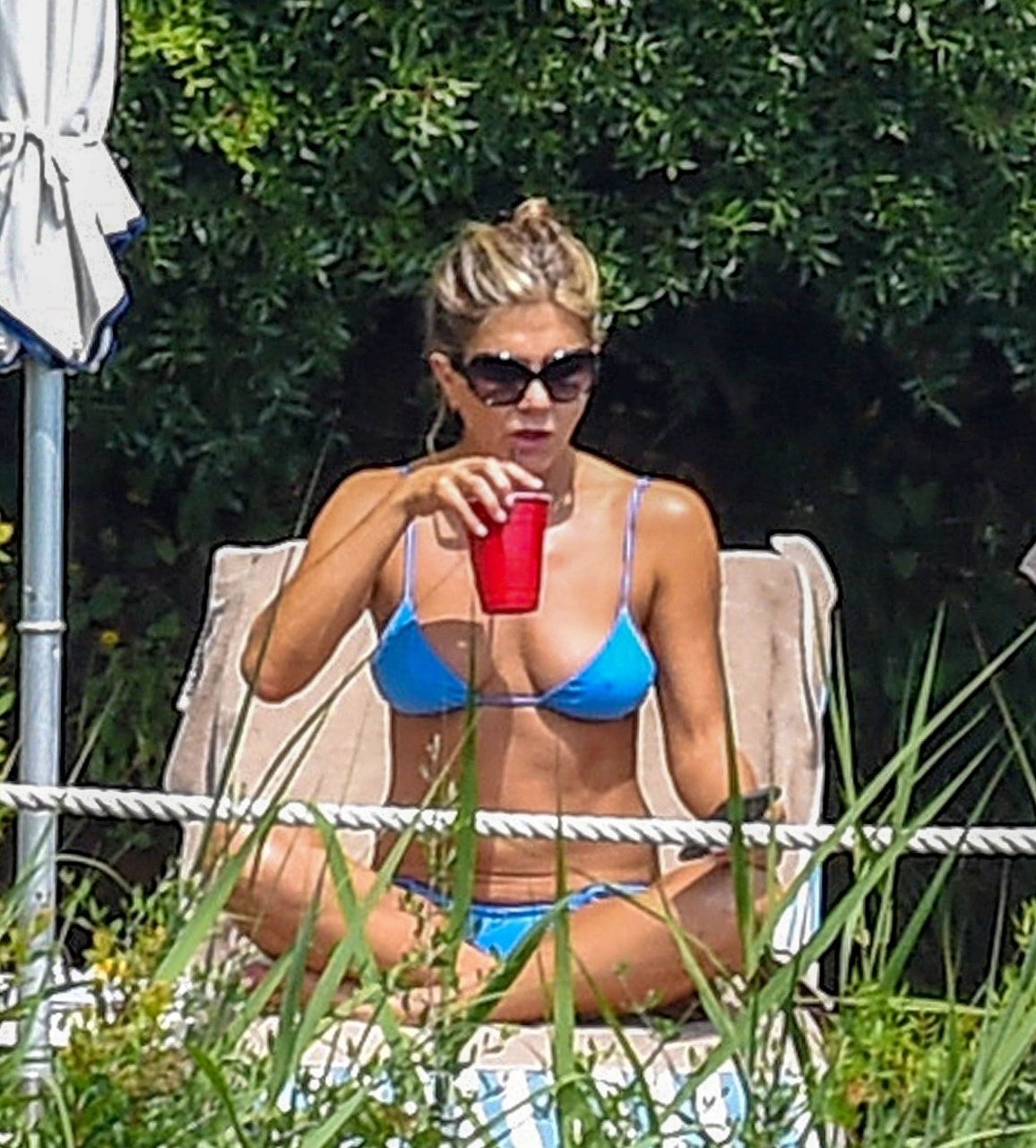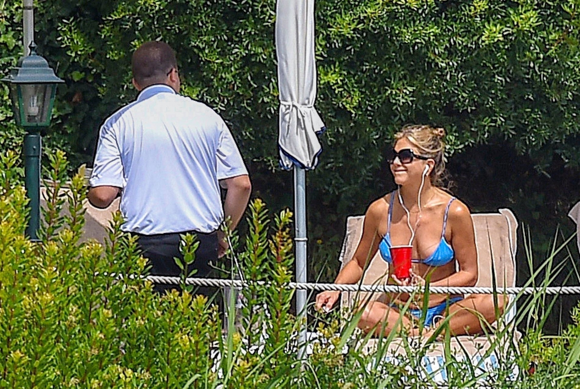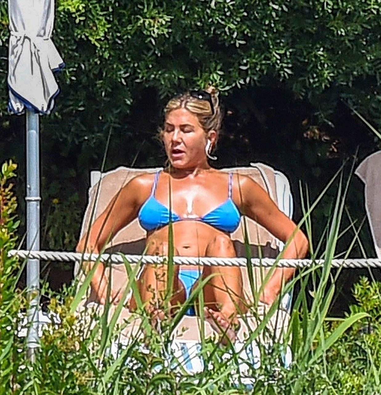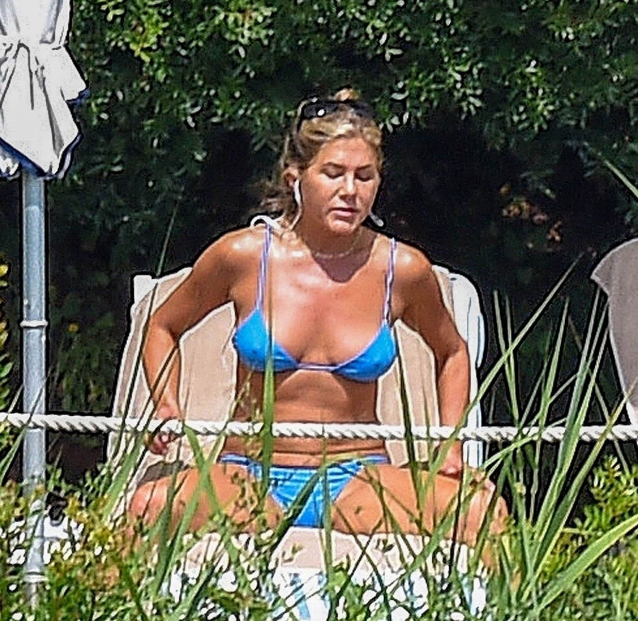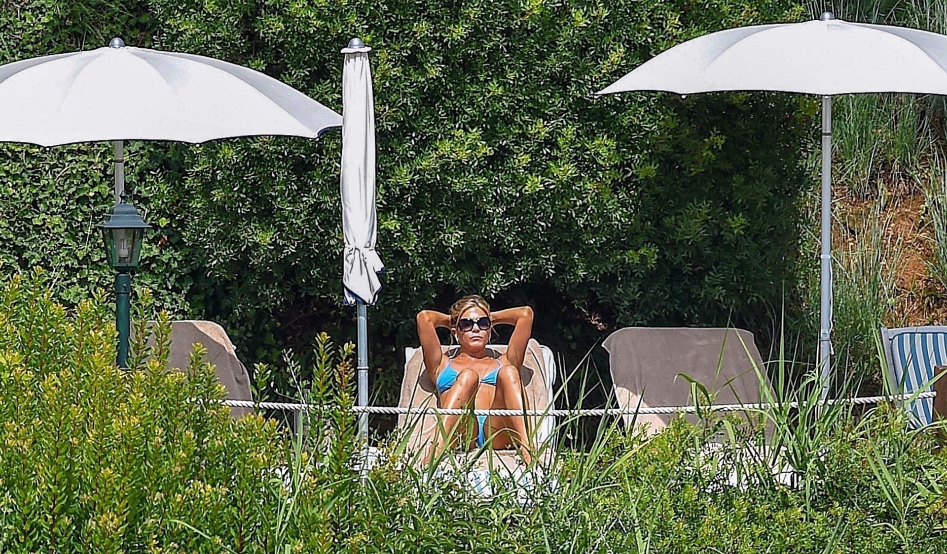 La actriz estadounidense Jennifer Aniston (49) muestra su cuerpo tonificado en bikini mientras es fotografiada relajándose junto a la piscina en Portofino antes de que comiencen las filmaciones de su nueva película “Murder Mystery”, 22/07/2018.