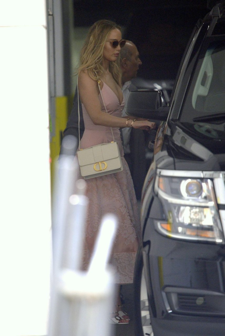 La actriz Jennifer Lawrence muestra su escote con un vestido rosa de tirantes finos, un bolso de hombro Dior y zapatos de tacón abierto en la ciudad de Nueva York, 01/06/2019.