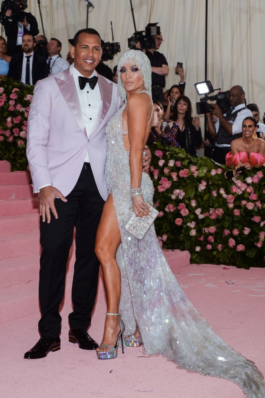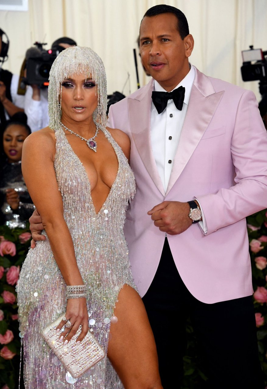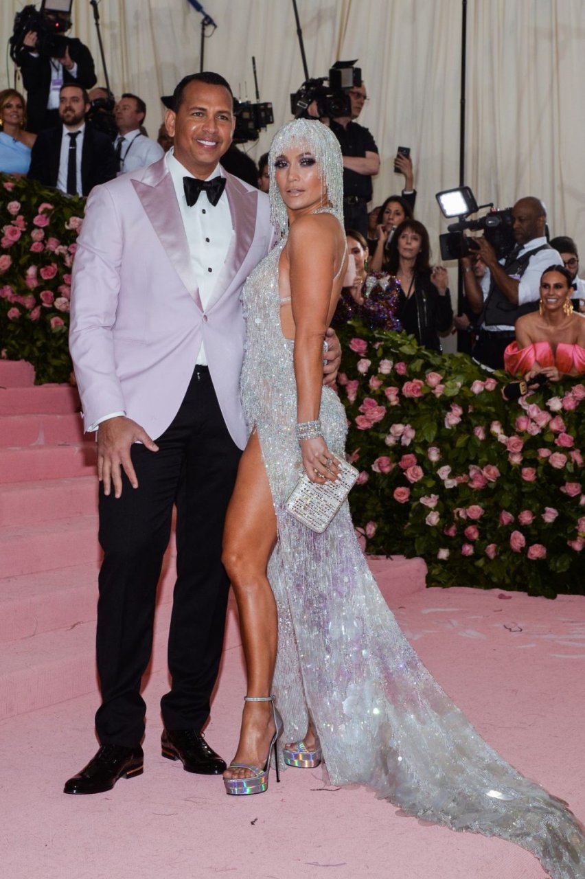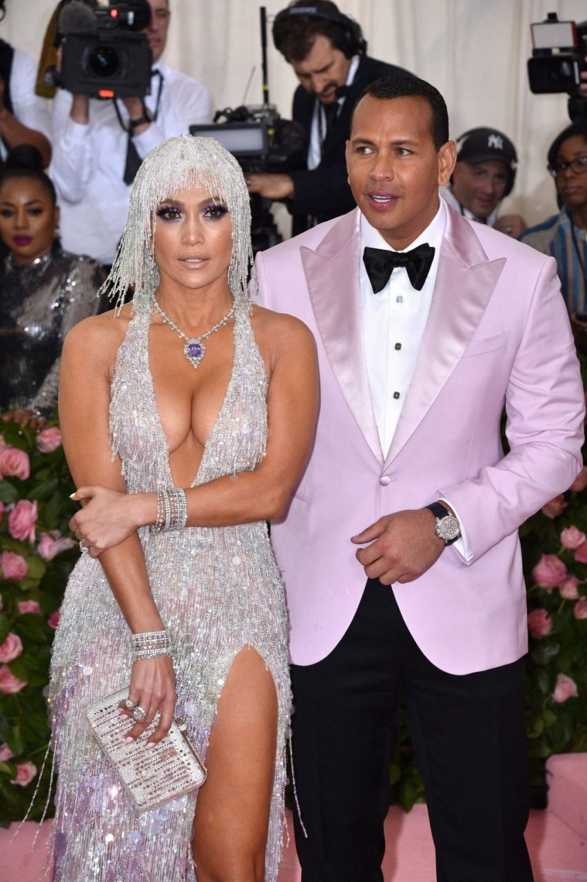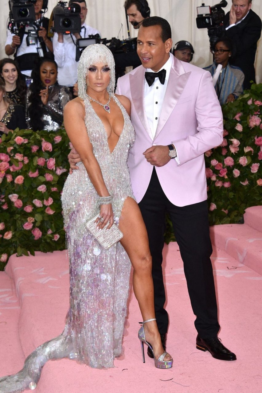 Jennifer Lopez (49) y Alex Rodriguez (43) aparecieron en la alfombra del Met Gala en Nueva York, 05/06/2019. Para el evento, la cantante eligió un vestido de Versace y un collar de Harry Winston. También tiene un anillo de compromiso con un enorme diamante.