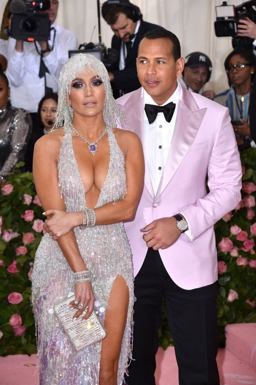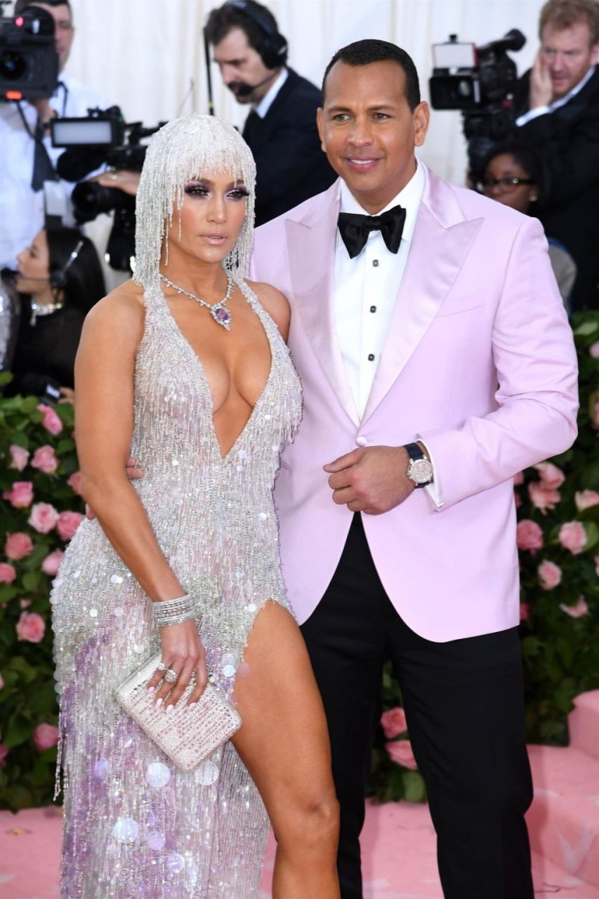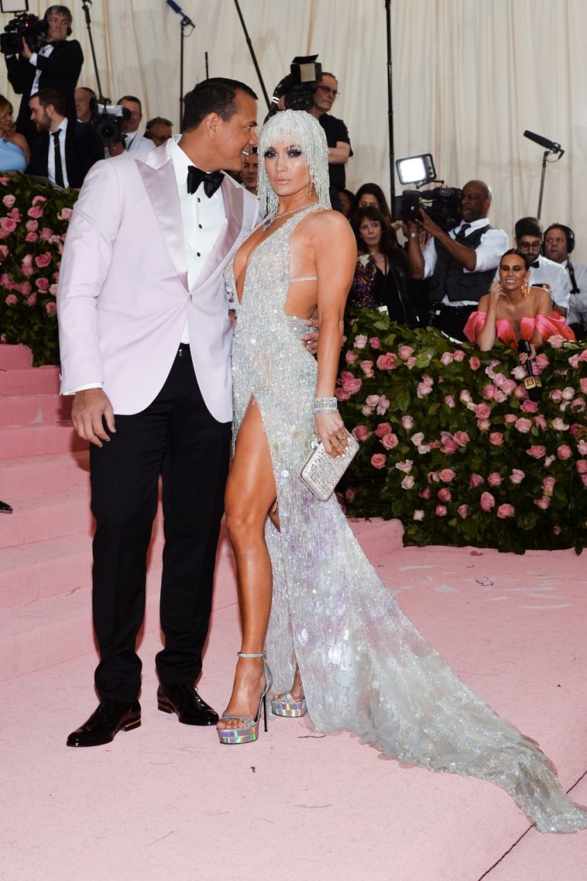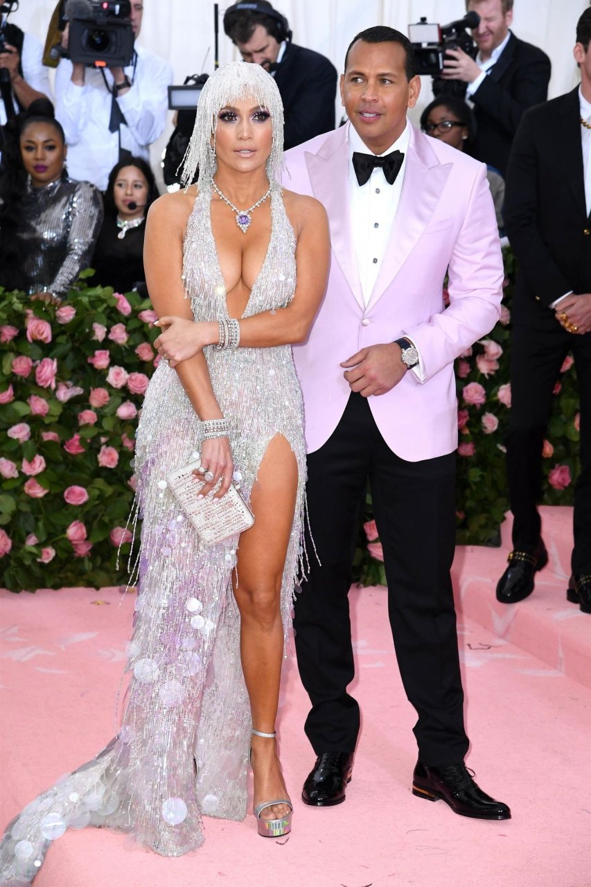 Jennifer Lopez (49) y Alex Rodriguez (43) aparecieron en la alfombra del Met Gala en Nueva York, 05/06/2019. Para el evento, la cantante eligió un vestido de Versace y un collar de Harry Winston. También tiene un anillo de compromiso con un enorme diamante.