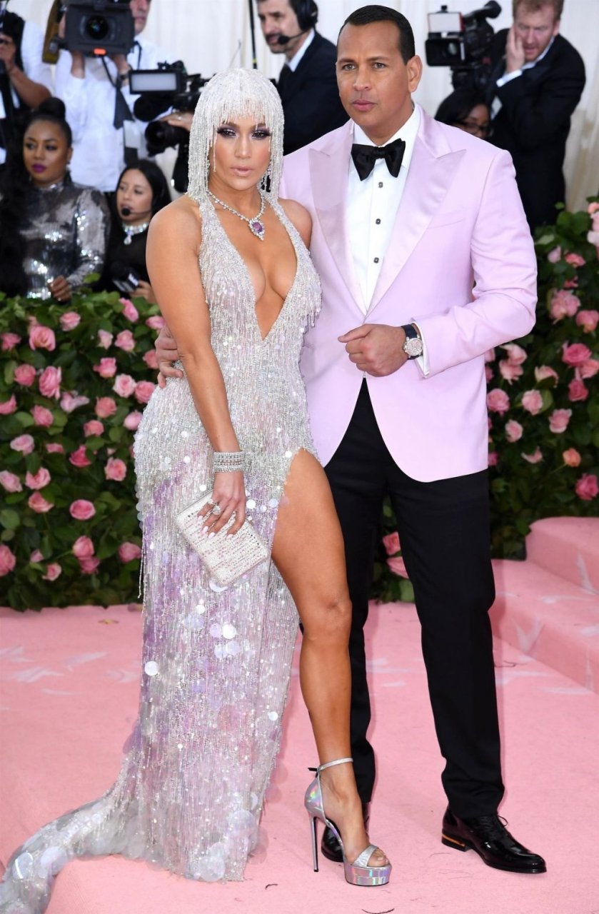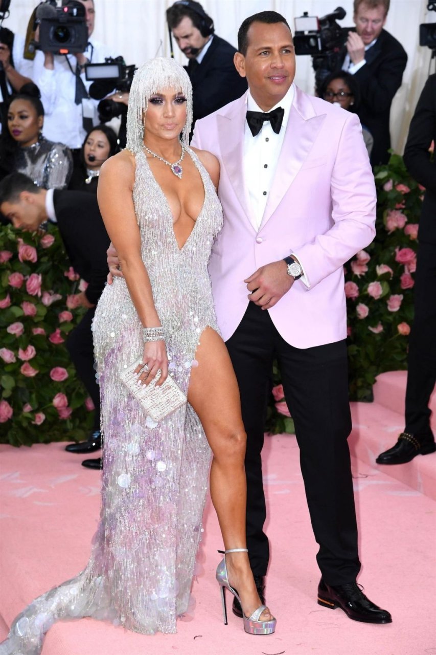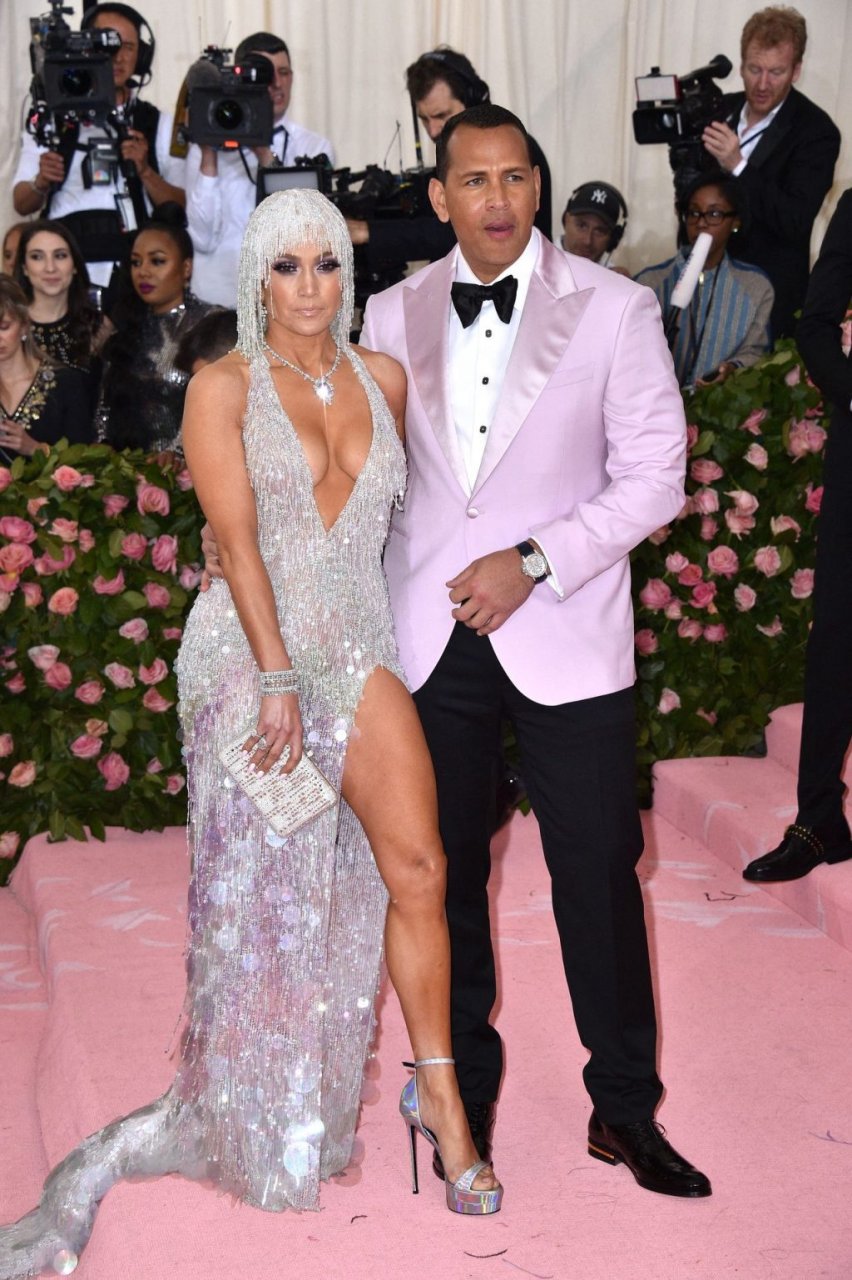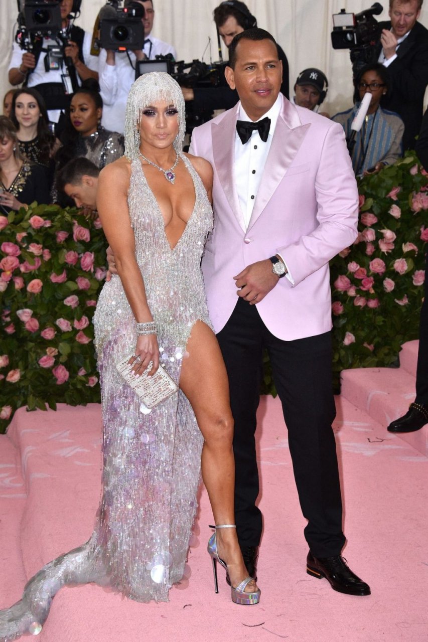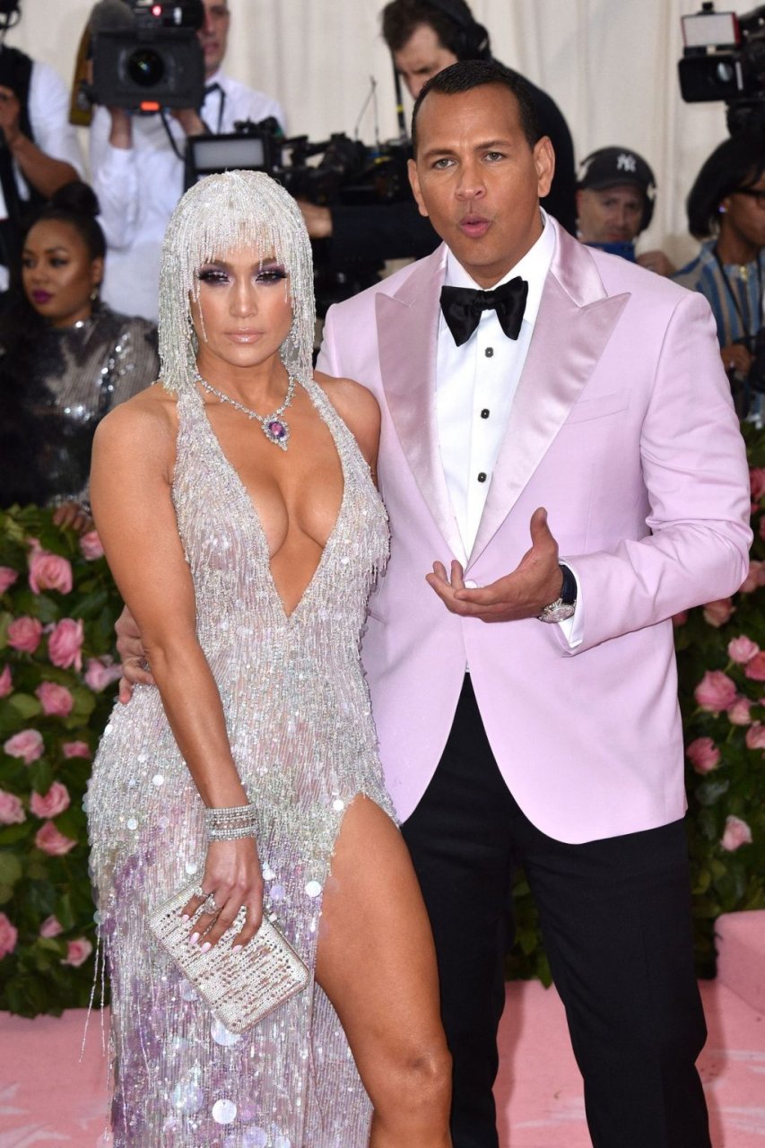 Jennifer Lopez (49) y Alex Rodriguez (43) aparecieron en la alfombra del Met Gala en Nueva York, 05/06/2019. Para el evento, la cantante eligió un vestido de Versace y un collar de Harry Winston. También tiene un anillo de compromiso con un enorme diamante.