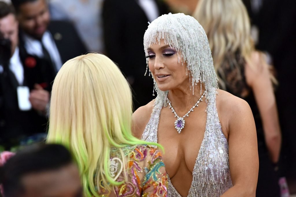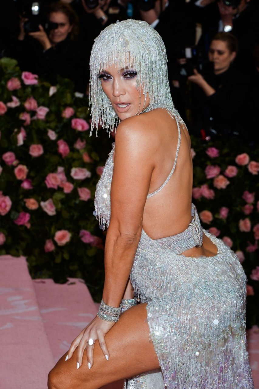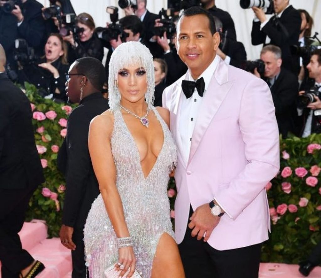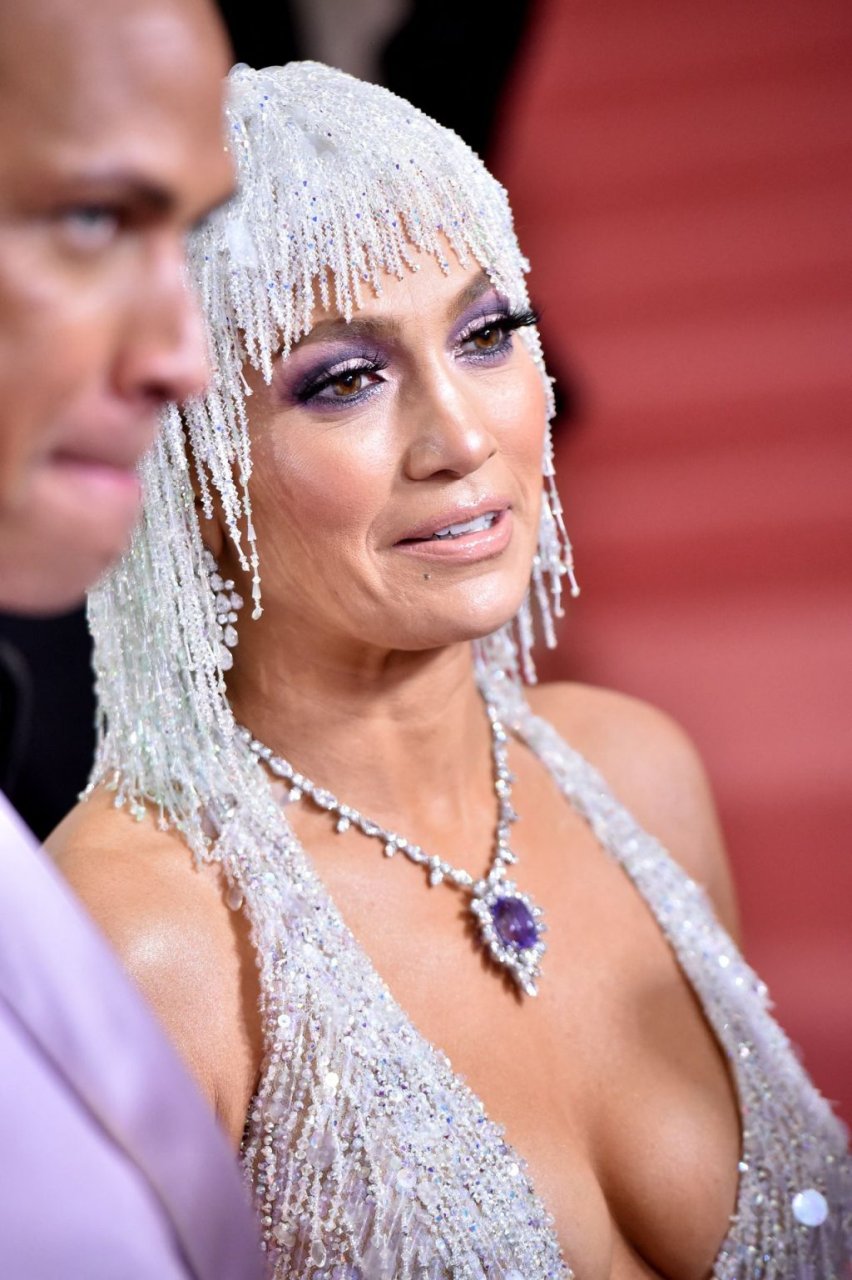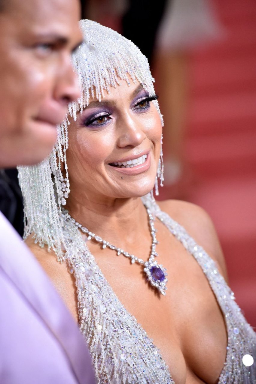 Jennifer Lopez (49) y Alex Rodriguez (43) aparecieron en la alfombra del Met Gala en Nueva York, 05/06/2019. Para el evento, la cantante eligió un vestido de Versace y un collar de Harry Winston. También tiene un anillo de compromiso con un enorme diamante.
