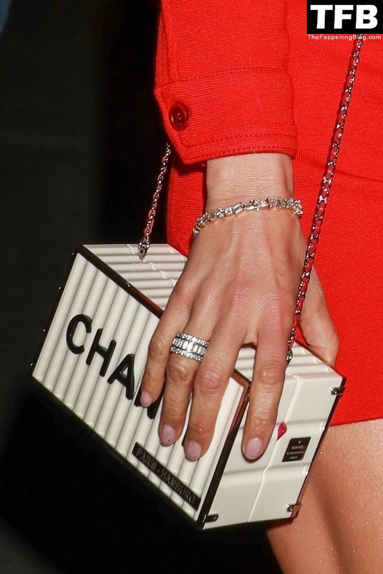 Además de su vestido rojo, también lleva sus siete libras de maquillaje facial.