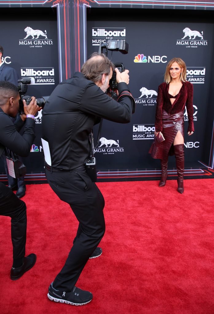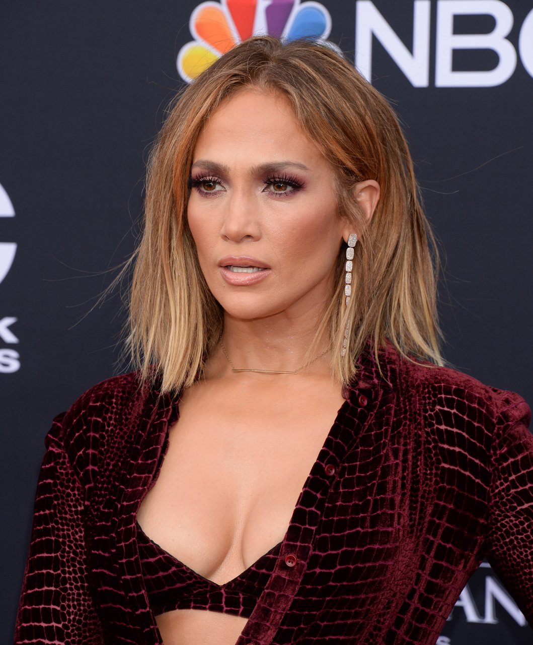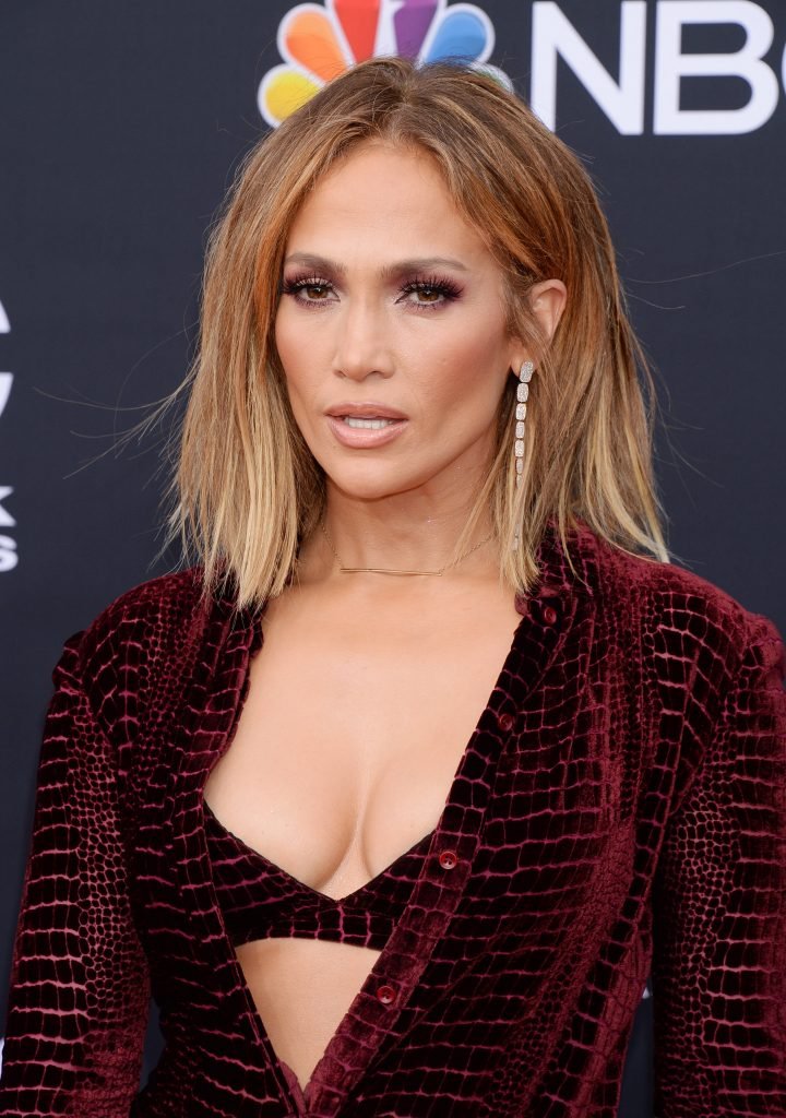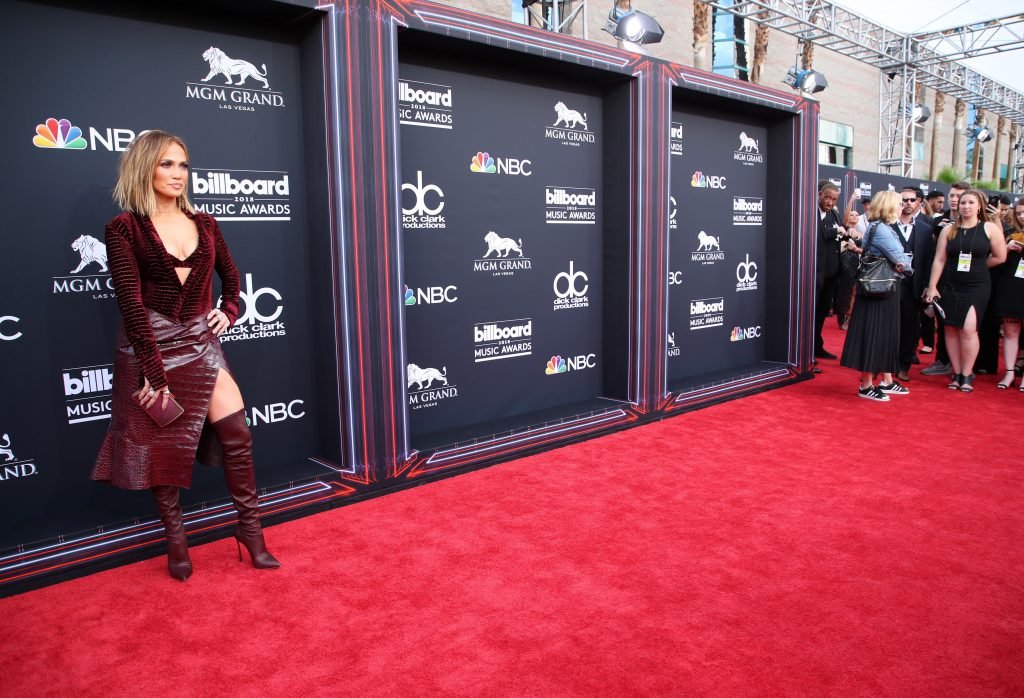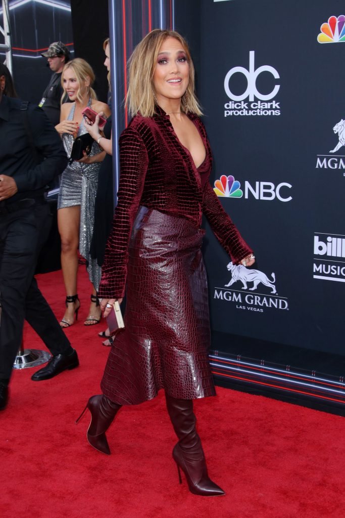 Una Jennifer Lopez envejecida mostró su escote en los Billboard Music Awards en Las Vegas, 20/05/2018. Jennifer Lopez (48), por cierto, llegó sola a la alfombra roja. Para el evento, la cantante eligió un vestido de Roberto Cavalli con inserciones de cuero y botas altas.