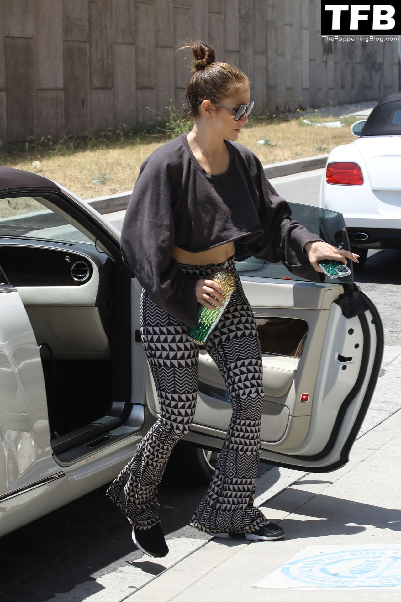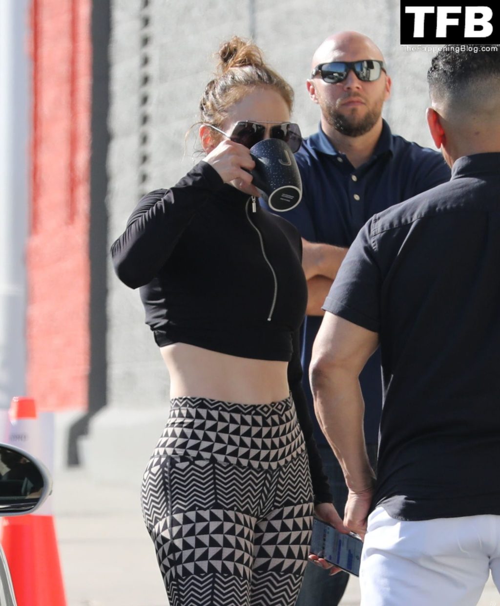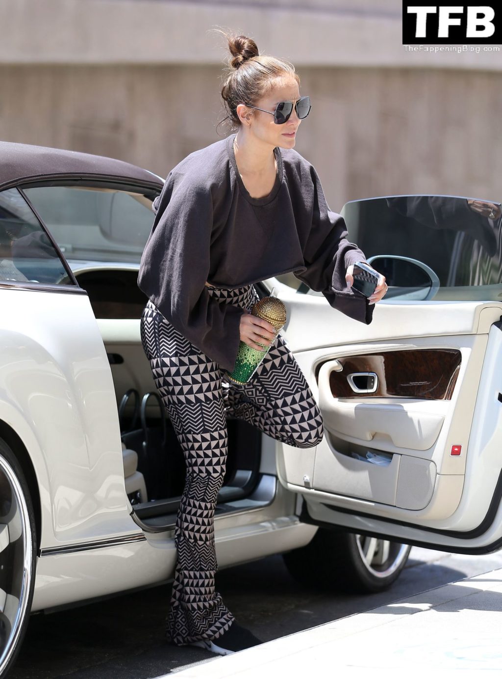 Jennifer Lopez llega al estudio de baile en Los Ángeles con leggings retro y una sudadera corta, 16/07/2022.