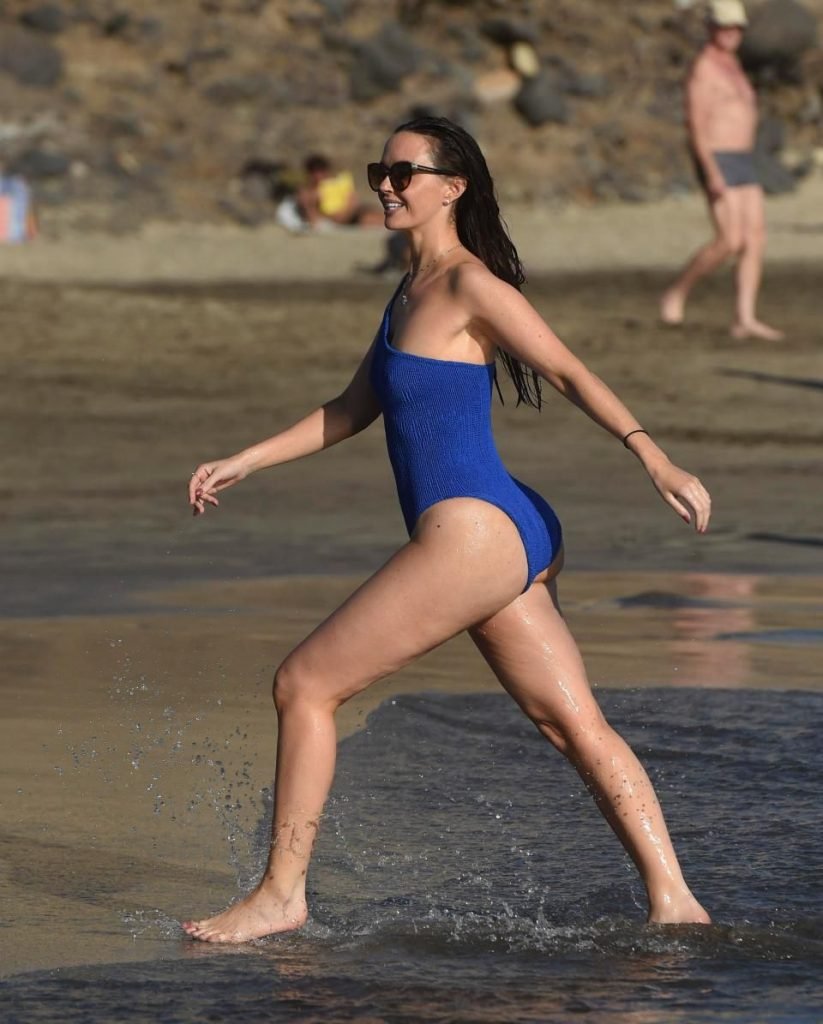 Jennifer Metcalfe lleva un traje de baño azul en la playa en Tenerife, 20/01/2018. Jennifer Metcalfe es una actriz inglesa (Hollyoaks / como Mercedes). Edad – 35 años.
