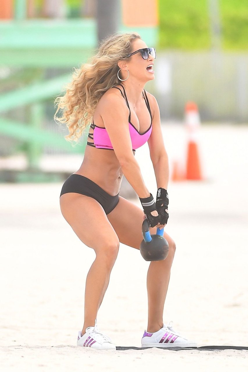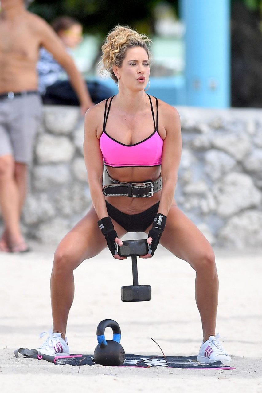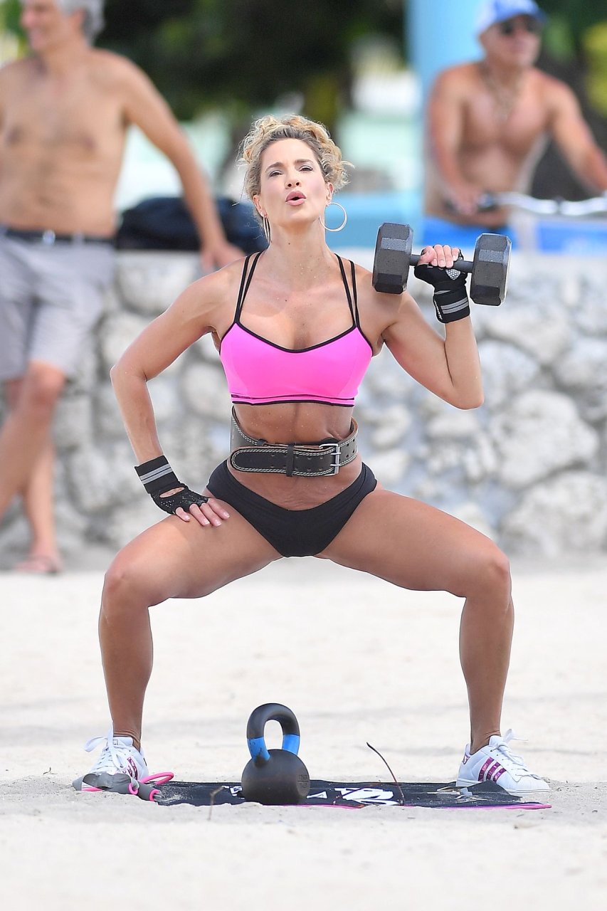 La estrella del fitness Jennifer Nicole Lee demuestra que la edad no es más que un número. La alta y atlética rubia ofreció a los espectadores de la playa un espectáculo con sus movimientos musculares, vistiendo pantalones cortos tipo boy shorts y un top de ejercicio tipo bra. Es autora y ha aparecido en 92 portadas de revistas.