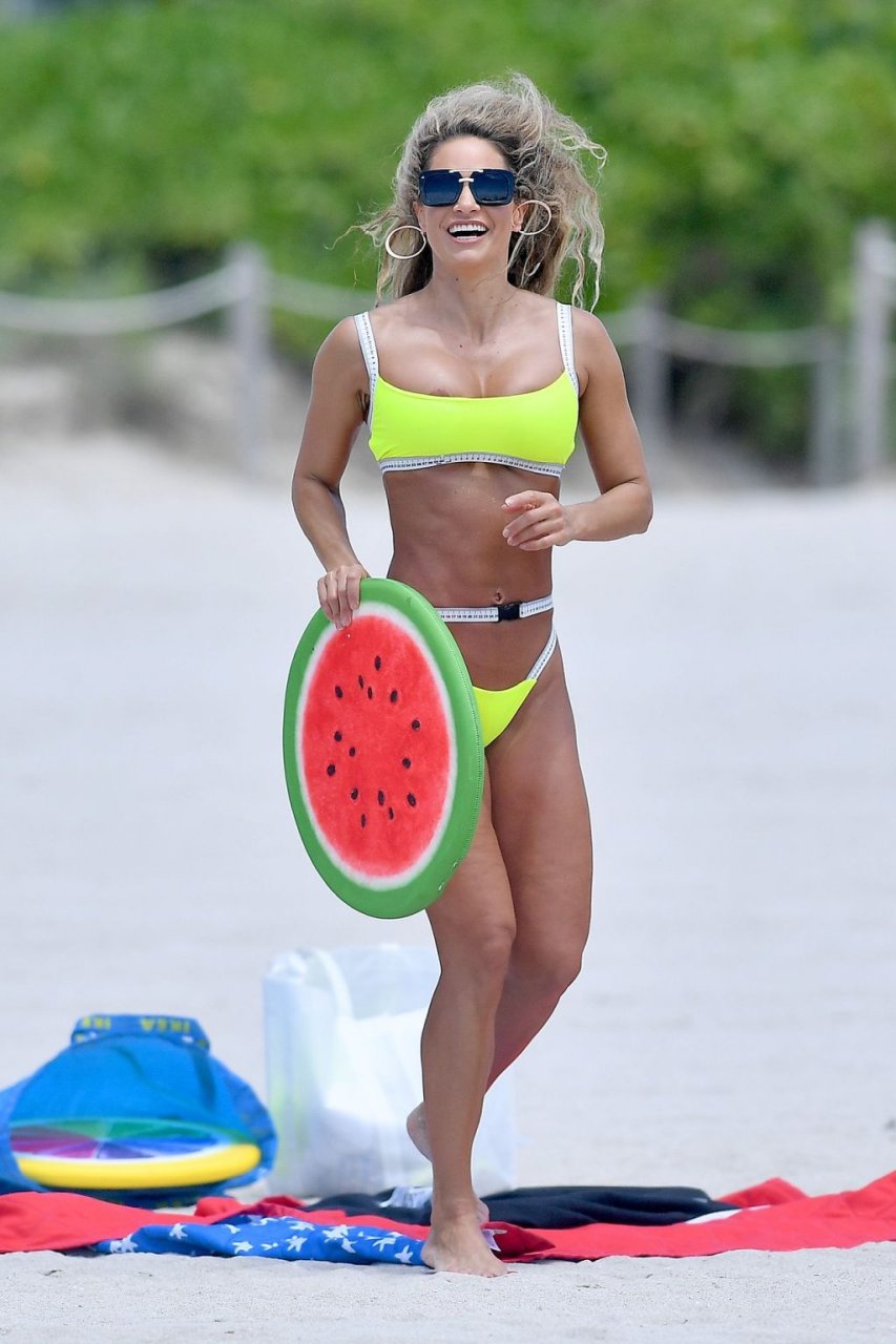 Jennifer Nicole Lee vista haciendo ejercicio en la playa con un tanga amarillo neón en Miami Beach, Florida, 17/07/2019. La actriz y modelo fitness Jennifer Nicole Lee ilumina South Beach con un tanga amarillo neón eléctrico con un acento de cinta métrica.