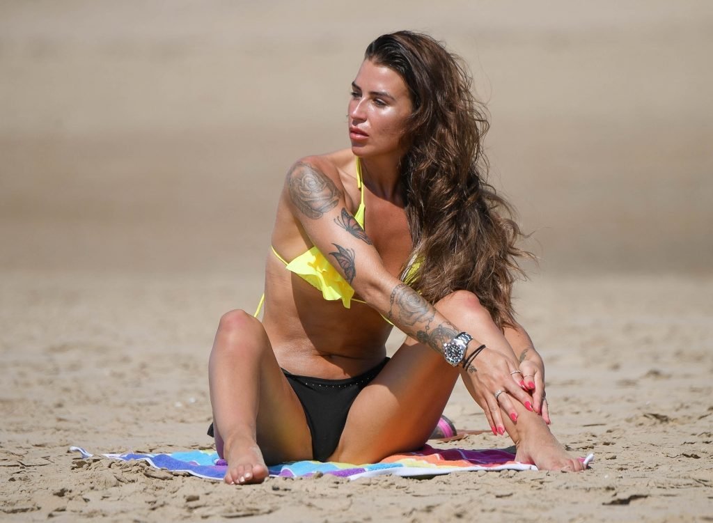 Ex On The Beach la estrella Jenny Thompson fue vista en la playa posando implícitamente topless, 07/08/2018. La morena mostró su cuerpo bronceado y tatuado luciendo un bikini negro y amarillo.