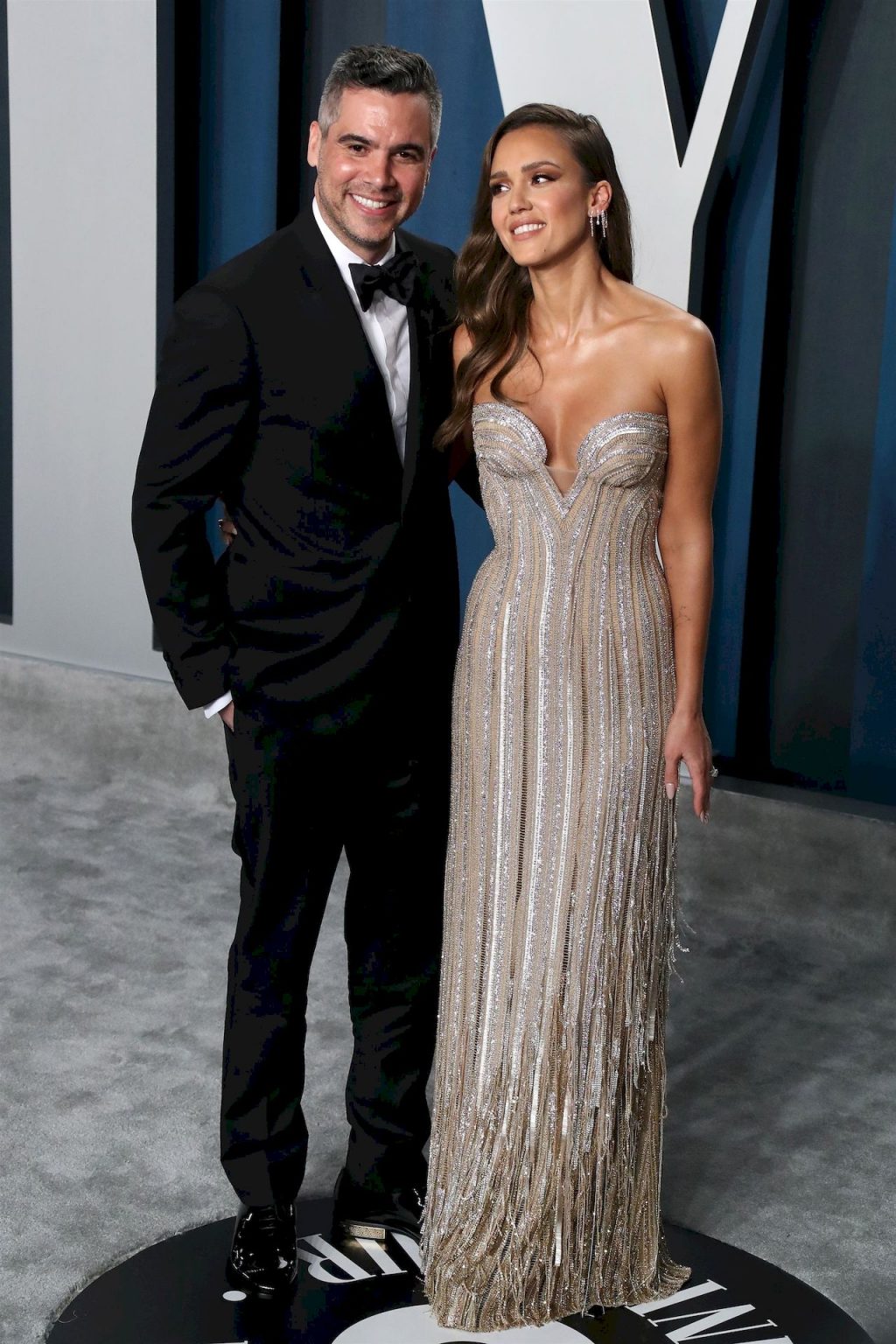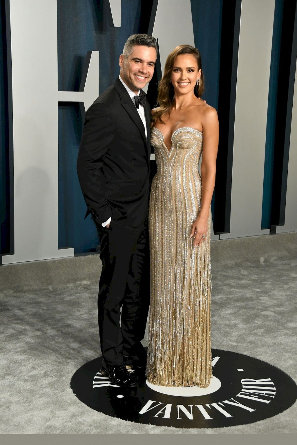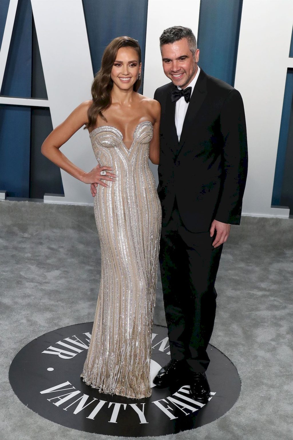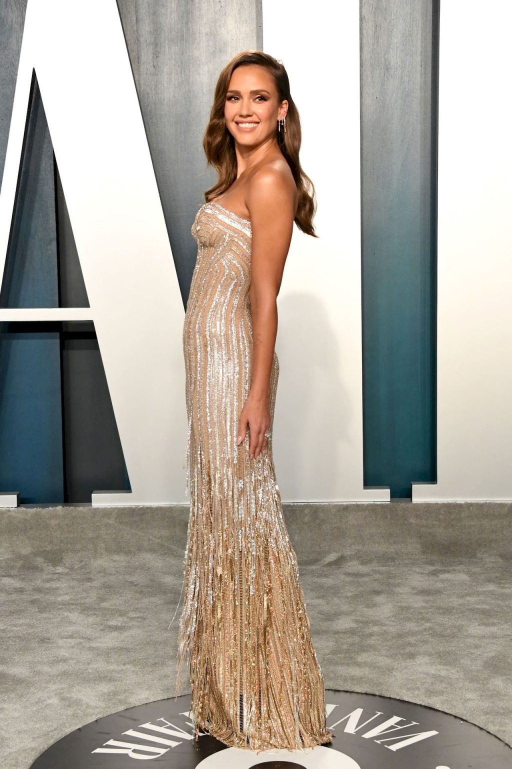 La superestrella Jessica Alba asiste a la fiesta de los Oscar Vanity Fair 2020 celebrada en el Wallis Annenberg Center for the Performing Arts, 09/02/2020. La celebridad estadounidense apareció con un vestido de Versace con un escote inusual. El conjunto enfatizaba la figura perfecta de la actriz y su piel bronceada.