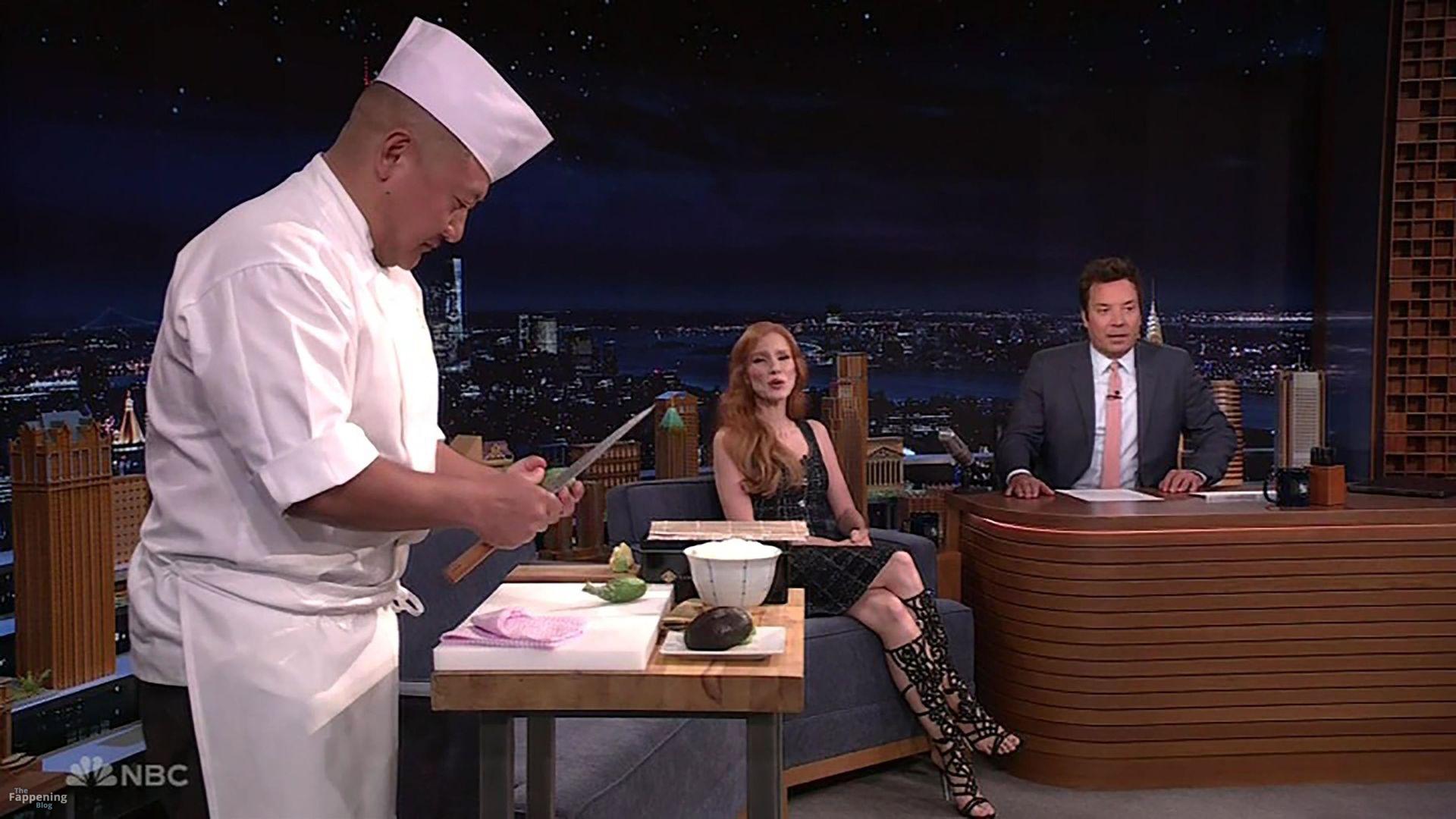 Jessica Chastain bromea sobre el pepino del jardín trasero de Jimmy Fallon en The Tonight Show. La actriz acudió al programa de entrevistas nocturno estadounidense para promocionar su nueva serie The Savant cuando el presentador Fallon sacó su verdura de forma extraña para presumirla, antes de que un chef experto la cortara en un rollo de sushi.