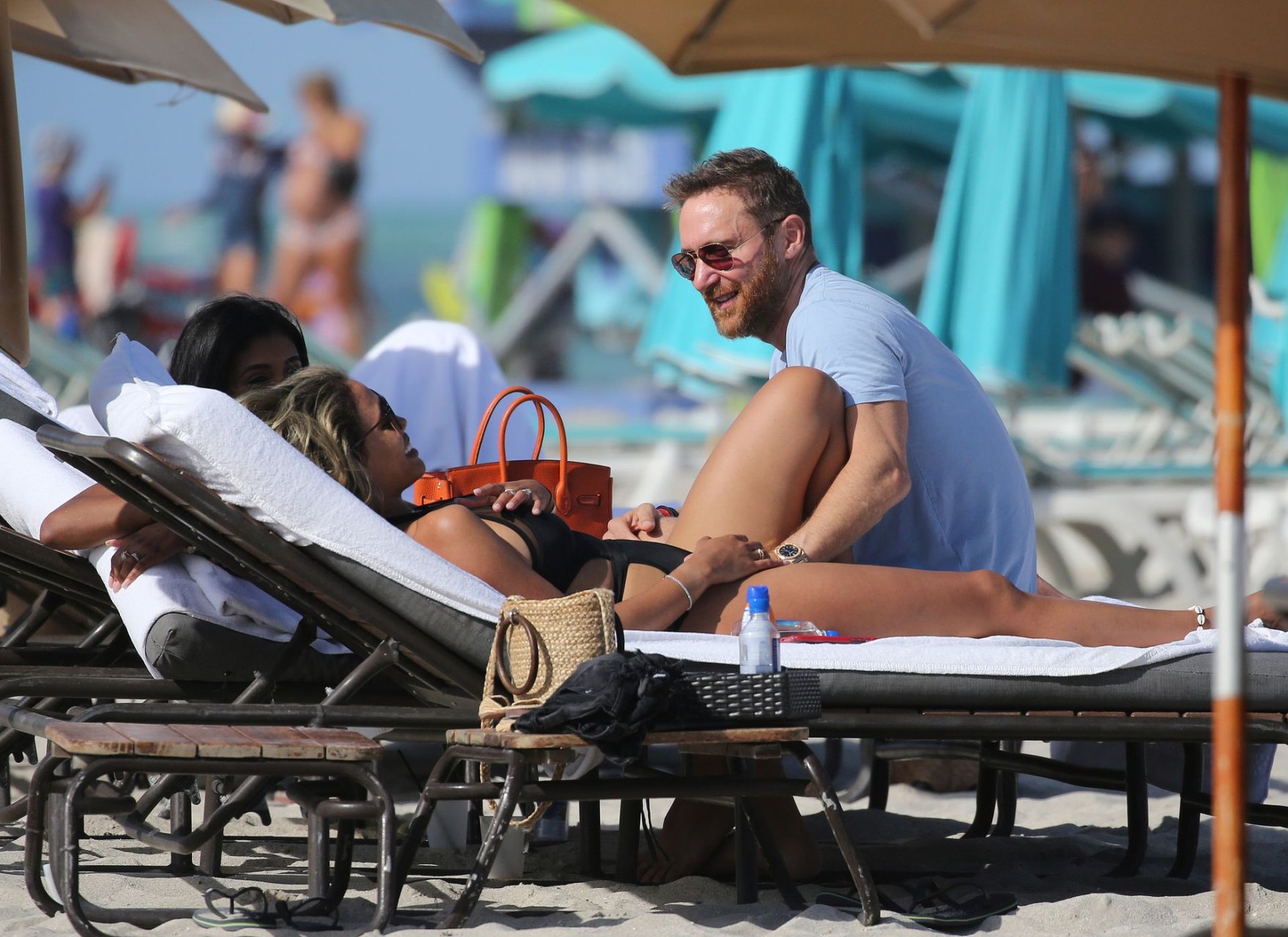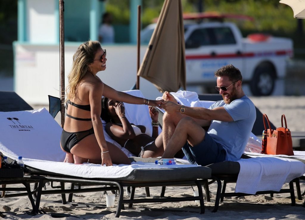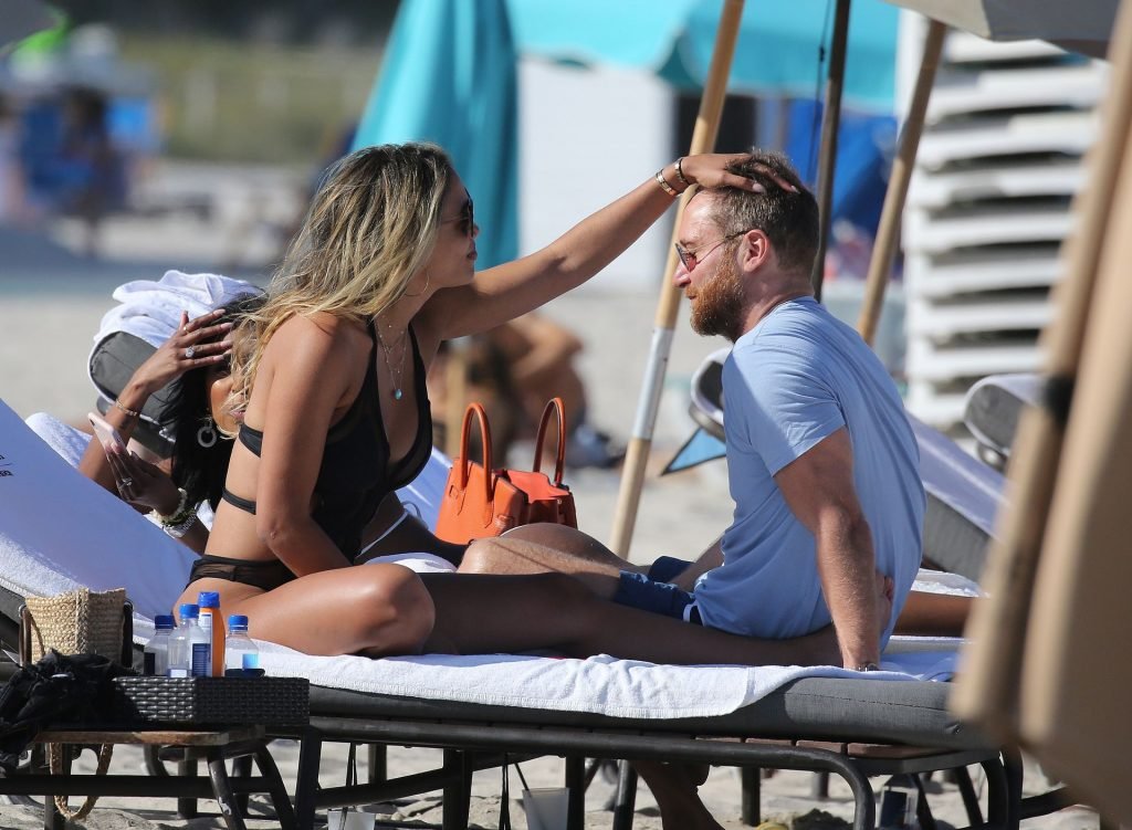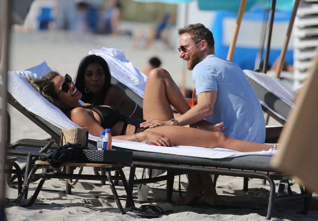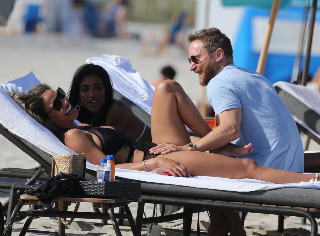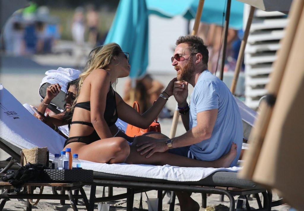 El DJ mundialmente famoso David Guetta no puede quitarle las manos a su novia Jessica Ledon en la playa de Miami, 30/03/2019.