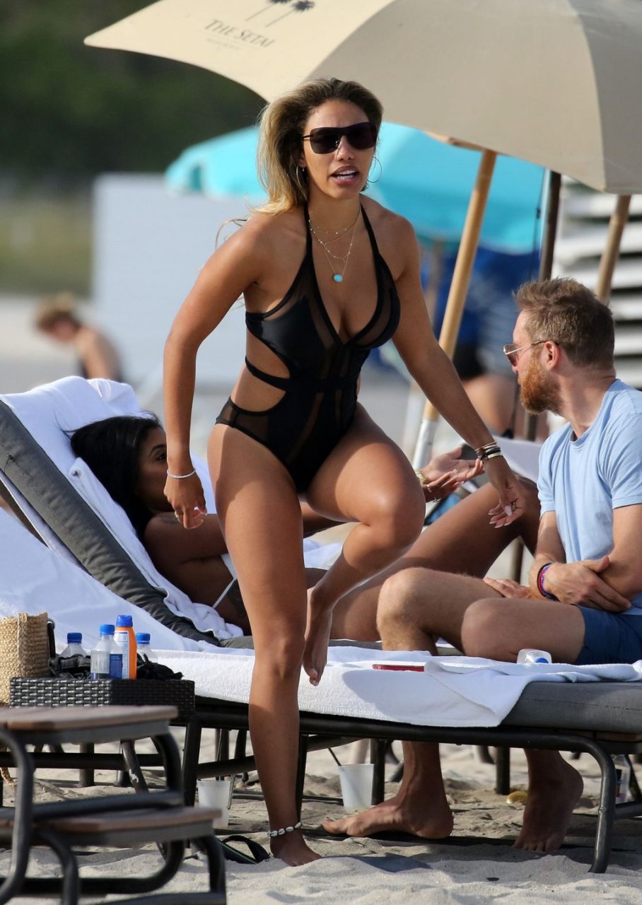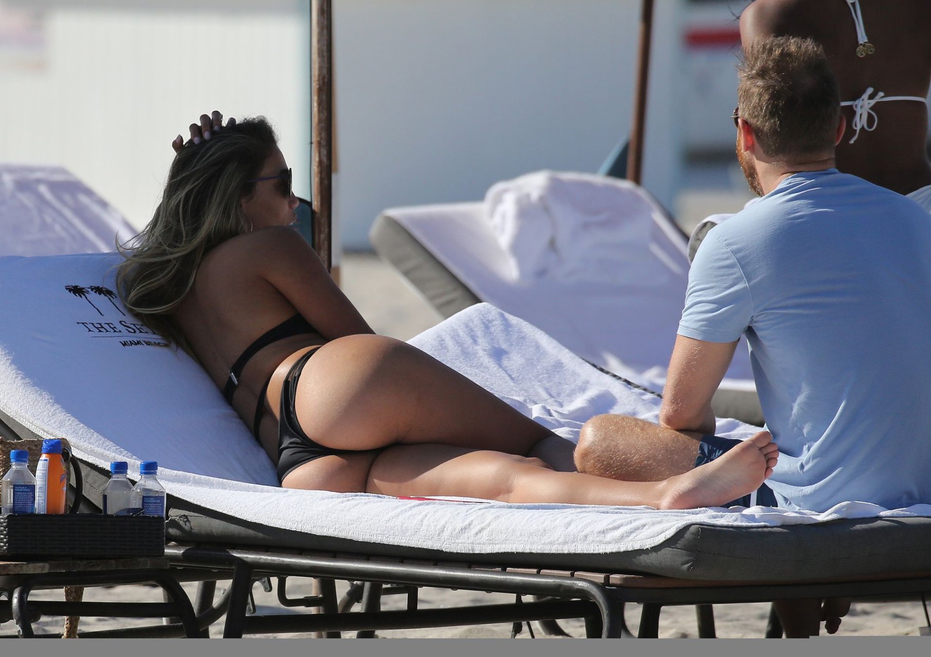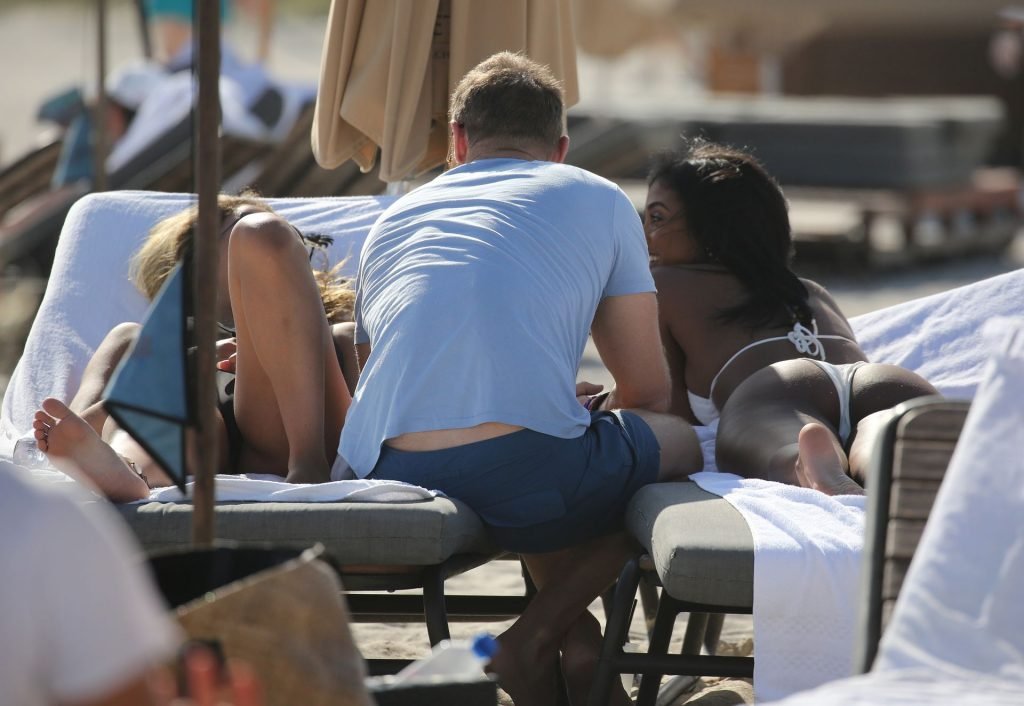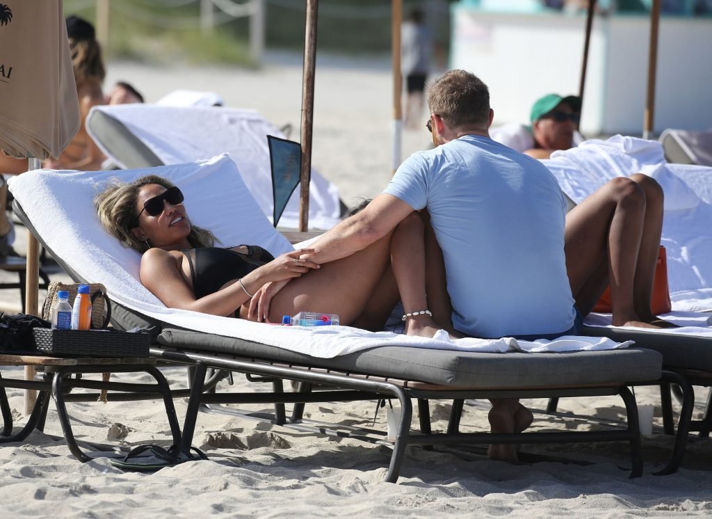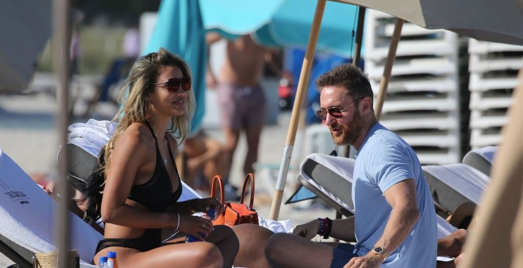 El DJ mundialmente famoso David Guetta no puede quitarle las manos a su novia Jessica Ledon en la playa de Miami, 30/03/2019.