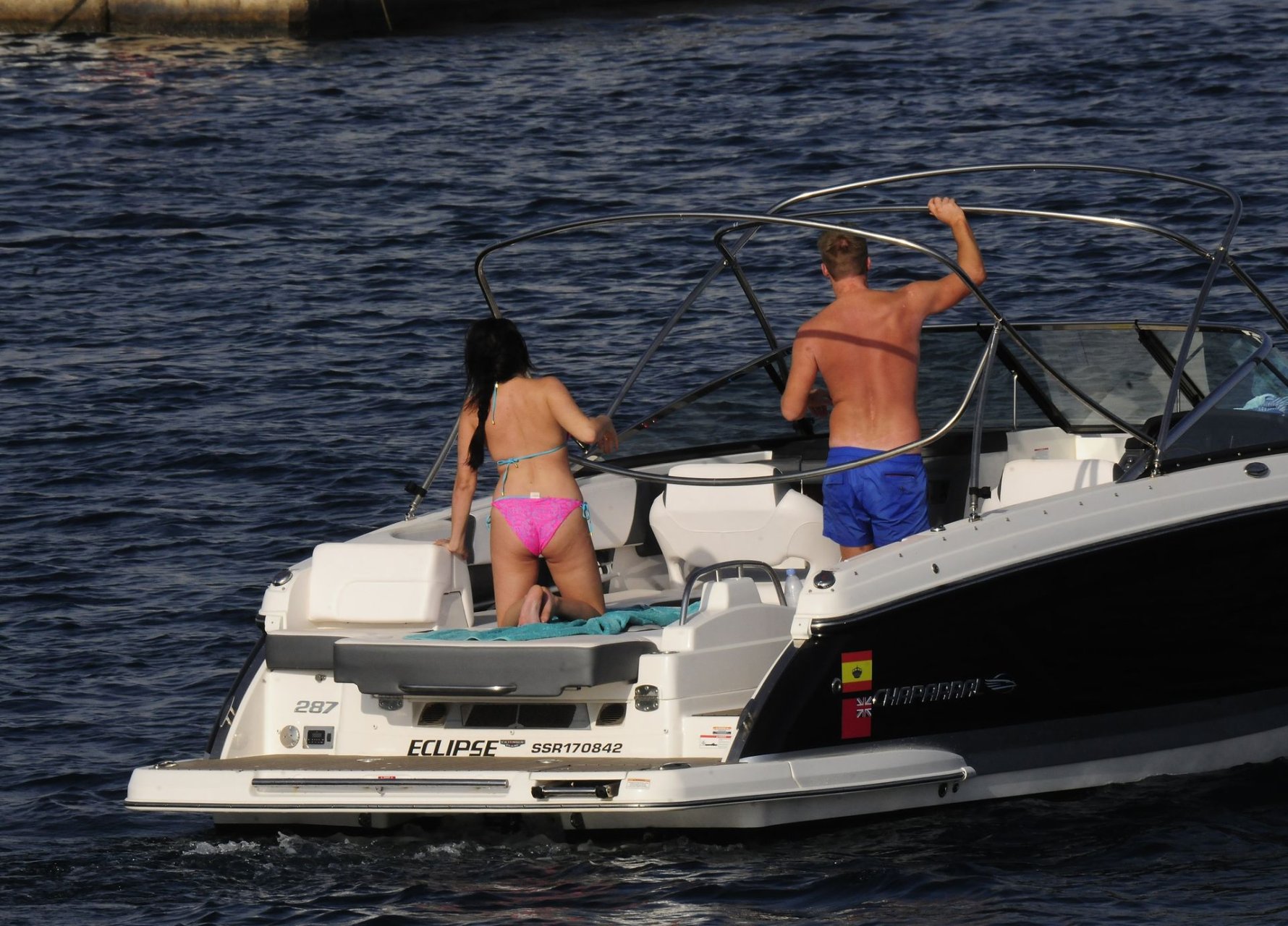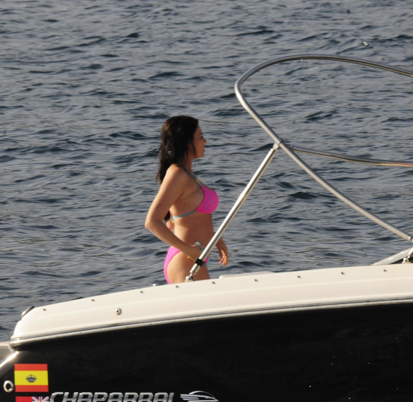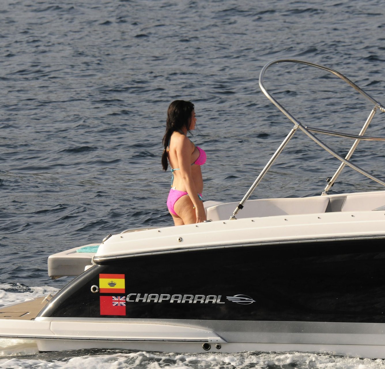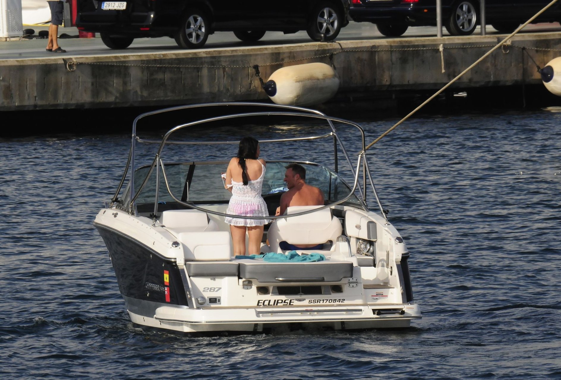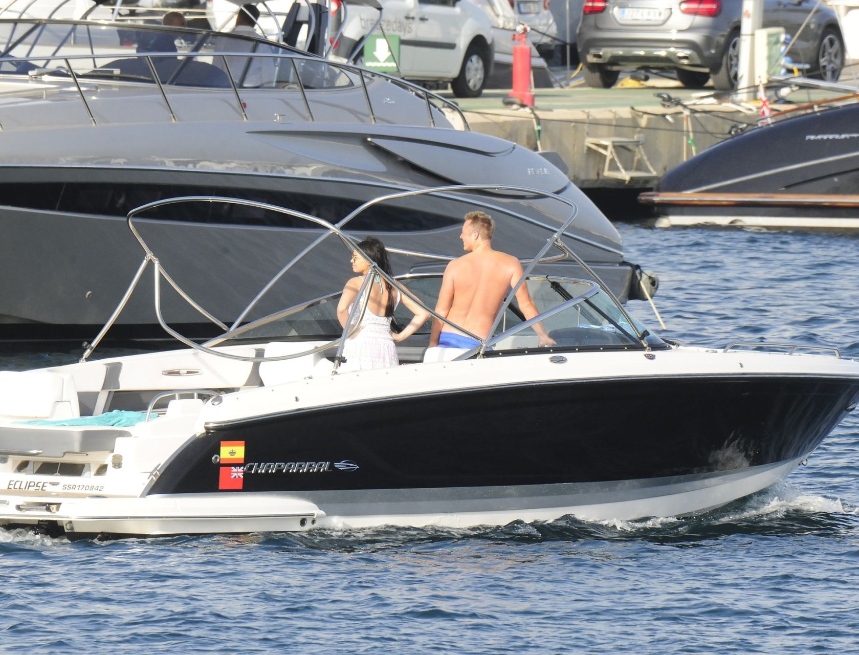 La estrella de TOWIE, Jessica Wright, sale en un yate con su novio William Lee-Kemp mientras están de vacaciones en Mallorca, España, 17/09/2019. Jess fue vista en un bikini rosa en el barco con su pareja.