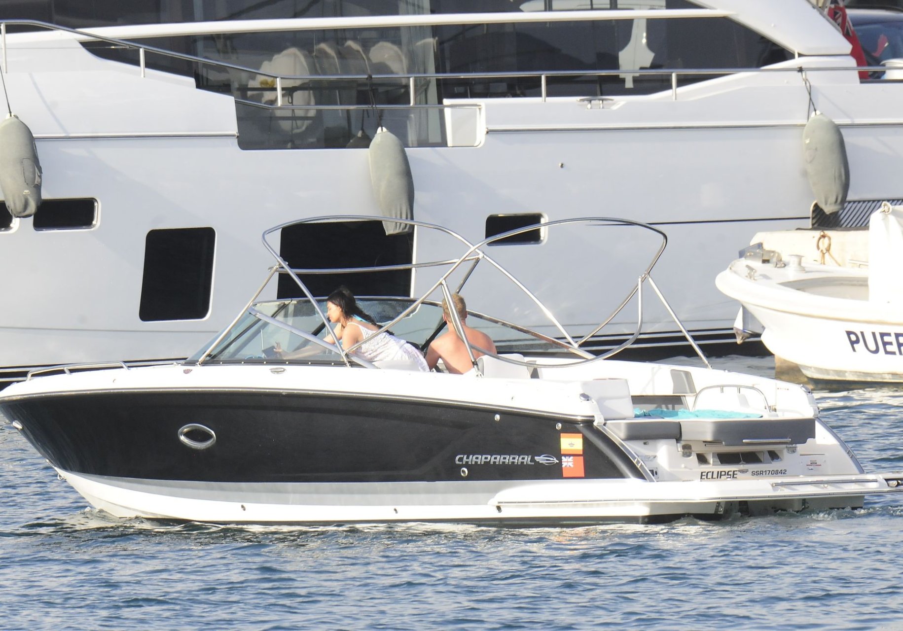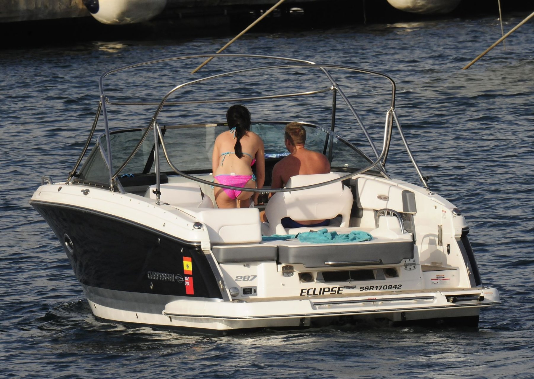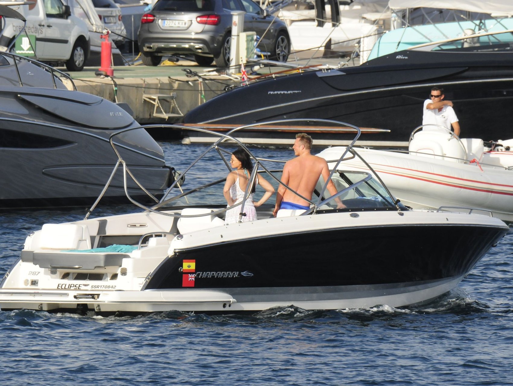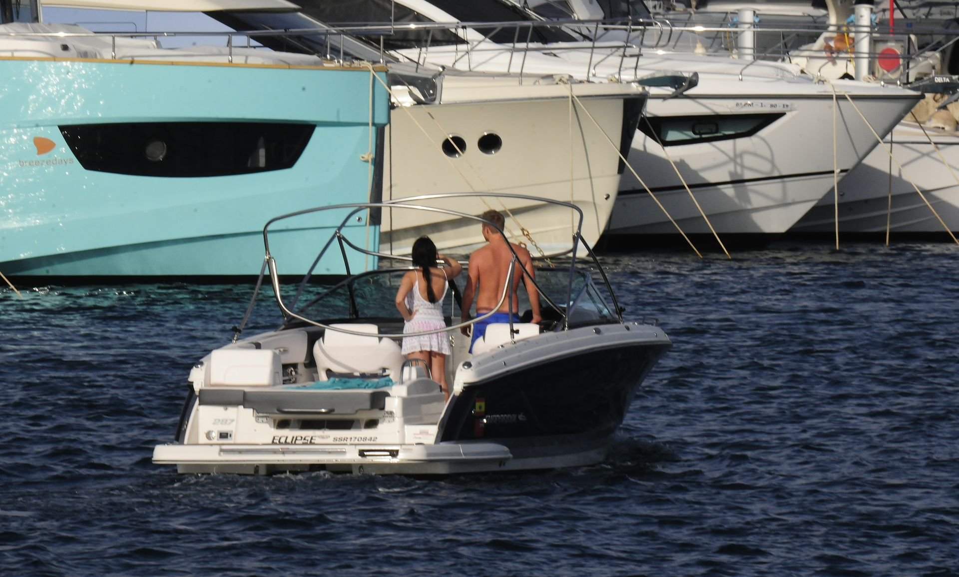 La estrella de TOWIE, Jessica Wright, sale en un yate con su novio William Lee-Kemp mientras están de vacaciones en Mallorca, España, 17/09/2019. Jess fue vista en un bikini rosa en el barco con su pareja.