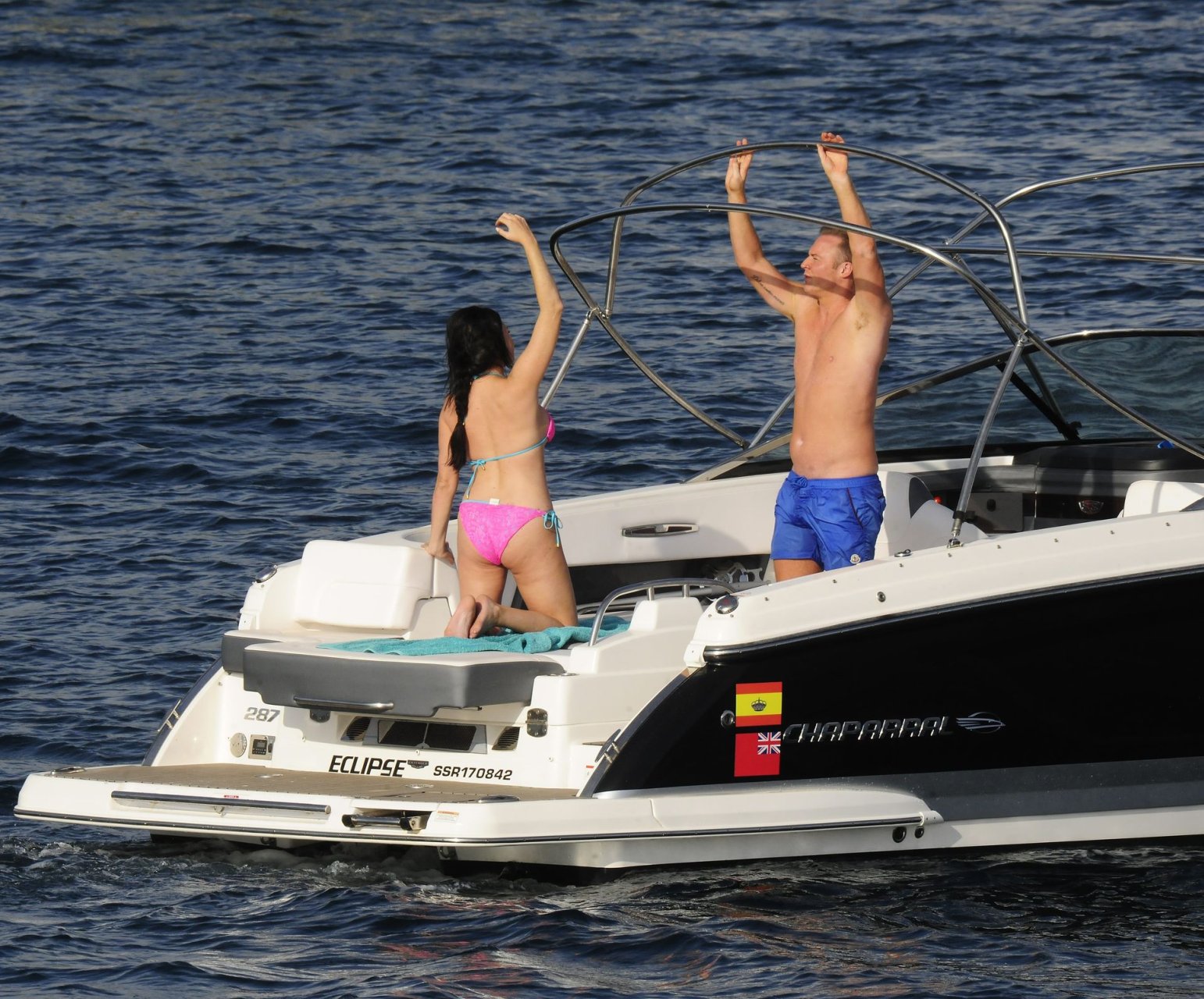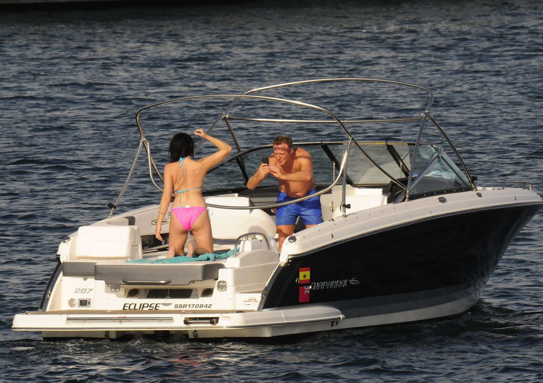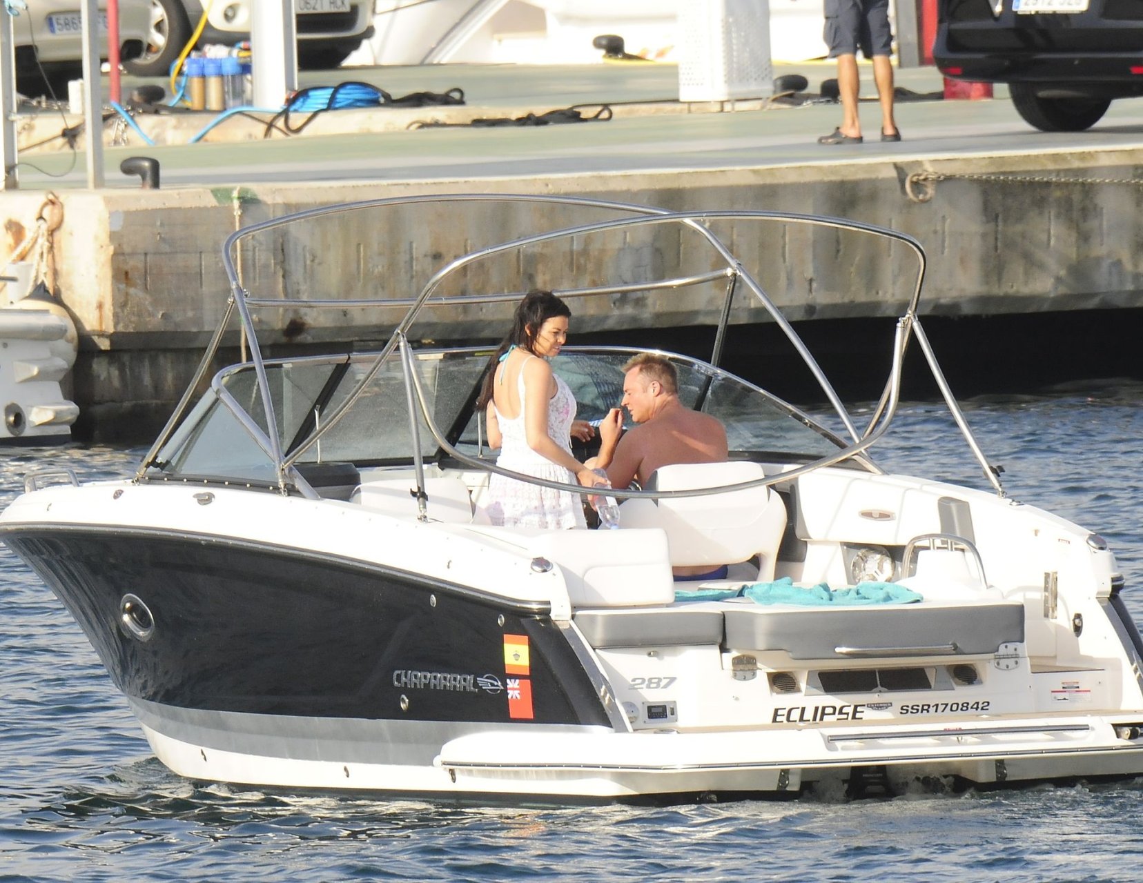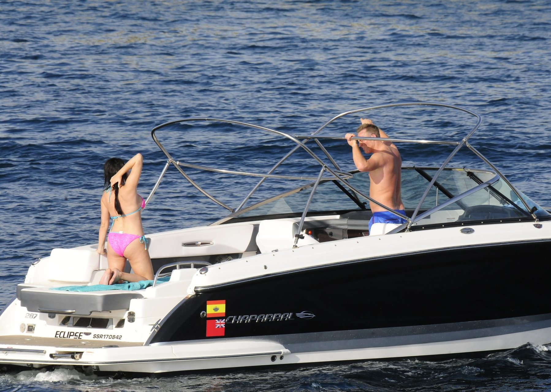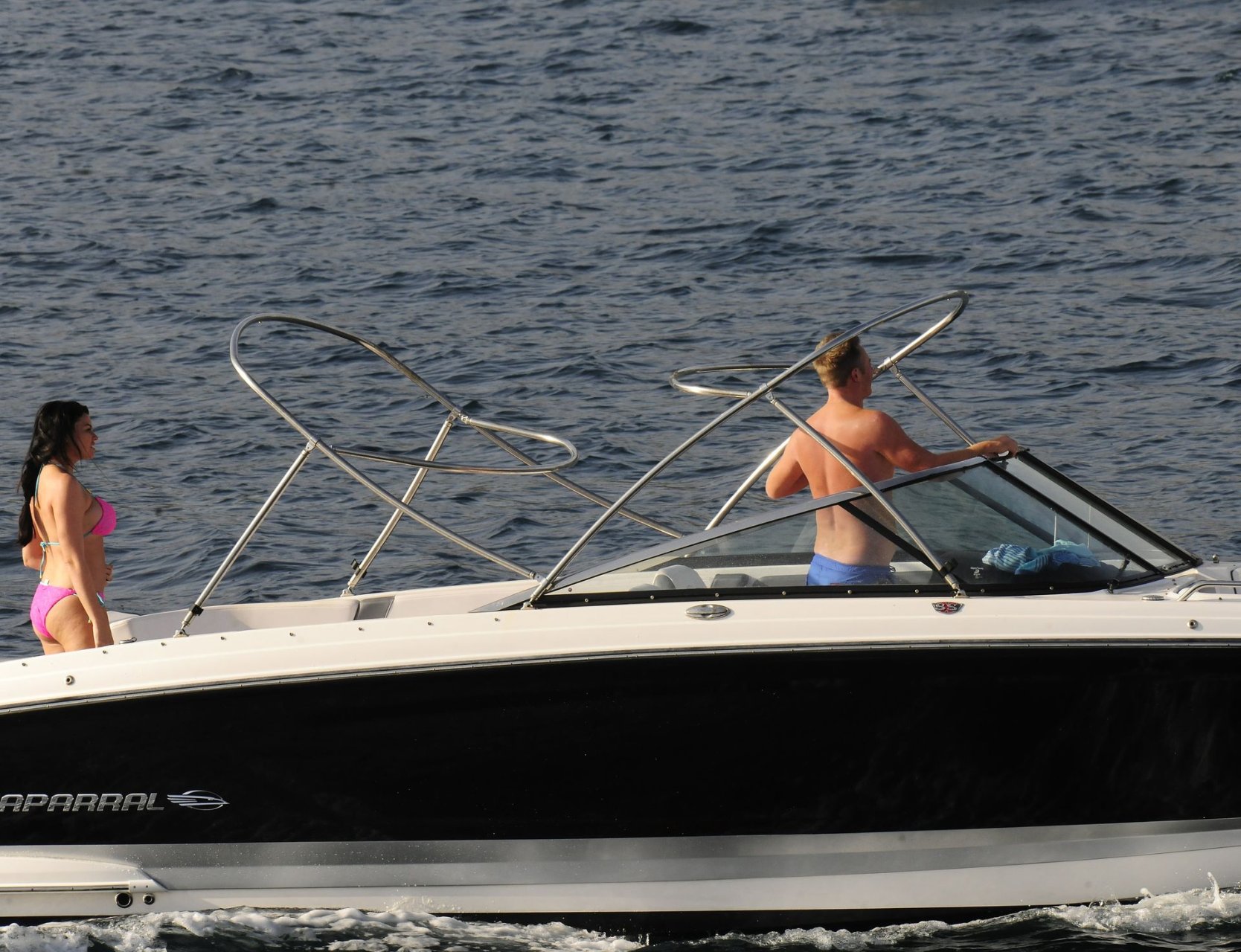 La estrella de TOWIE, Jessica Wright, sale en un yate con su novio William Lee-Kemp mientras están de vacaciones en Mallorca, España, 17/09/2019. Jess fue vista en un bikini rosa en el barco con su pareja.