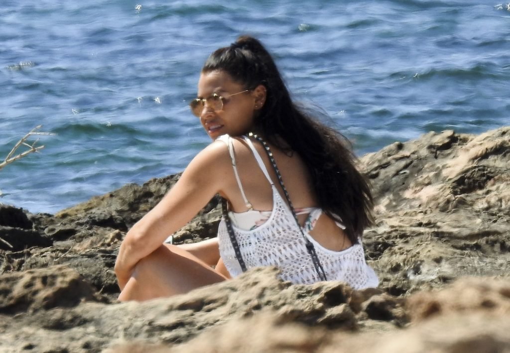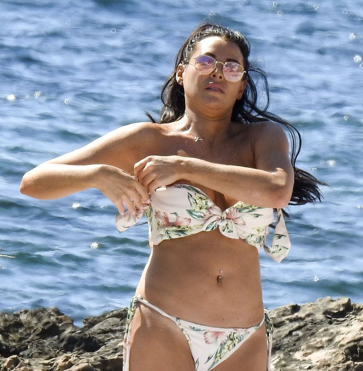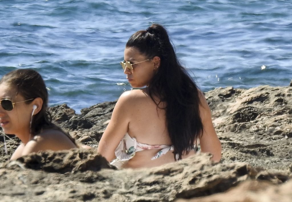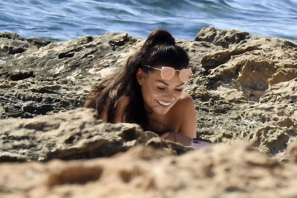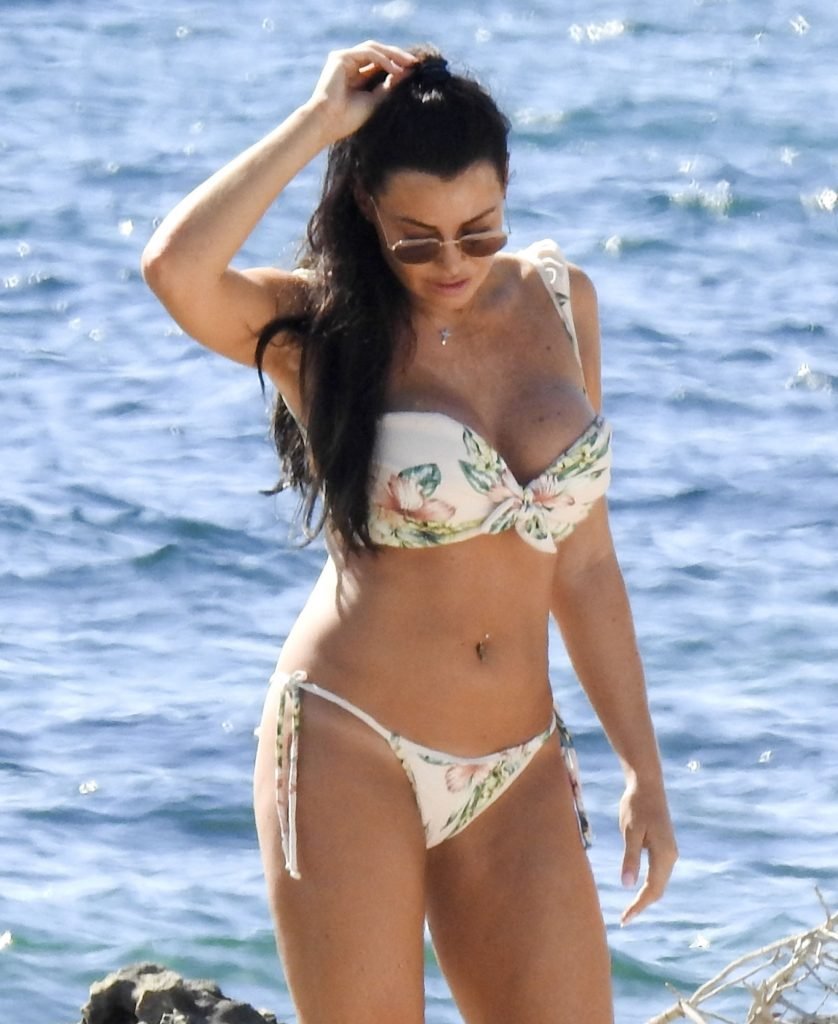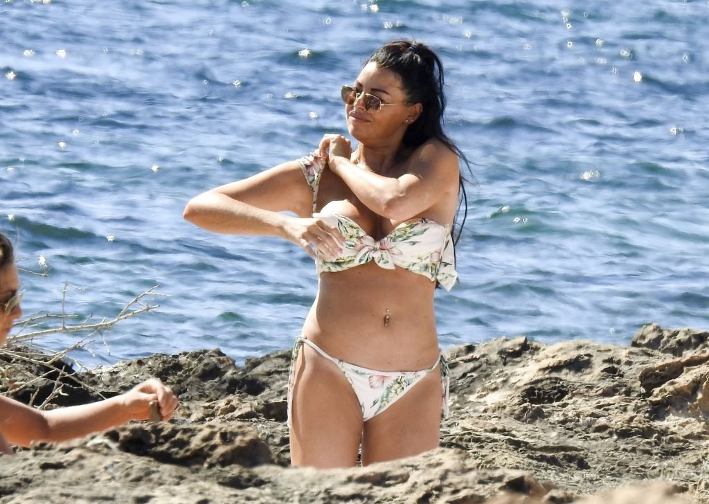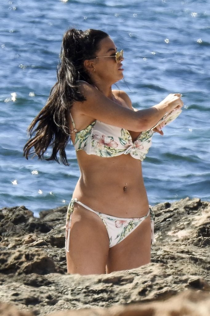 Jessica Wright muestra su figura bronceada de cuerpo de playa y lució sensacional con un bikini floreado pasando un día en la playa de vacaciones en Ibiza, 07/02/2018. La sexy estrella de TOWIE, que recientemente se separó de su novio de Strictly Come Dancing Giovanni Pernice, estuvo acompañada por una amiga mientras ambas se relajaban en las playas rocosas encontrando algo un poco divertido en sus teléfonos.