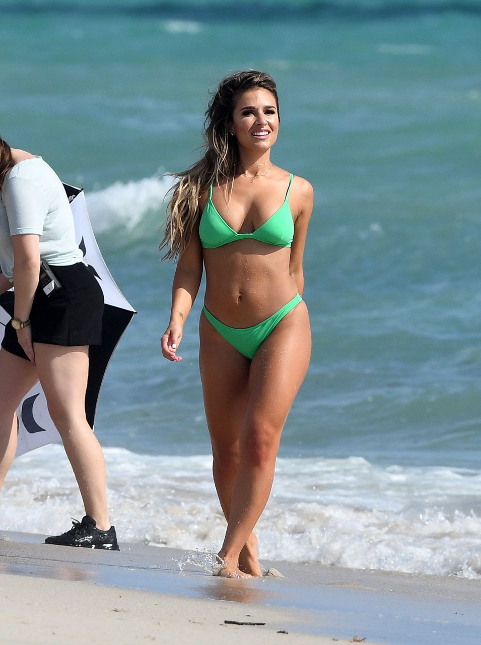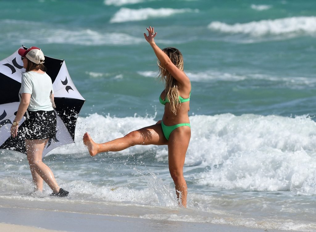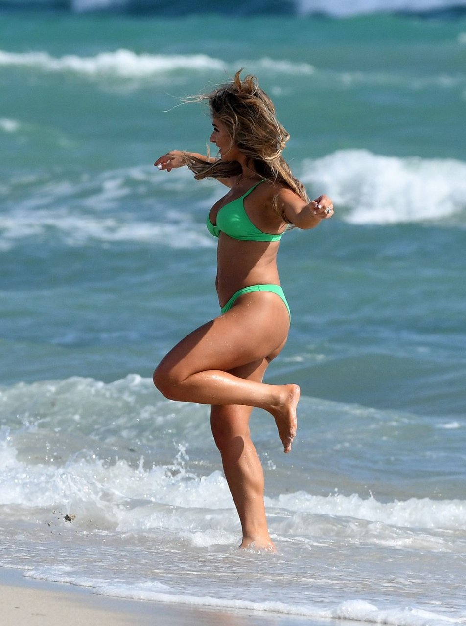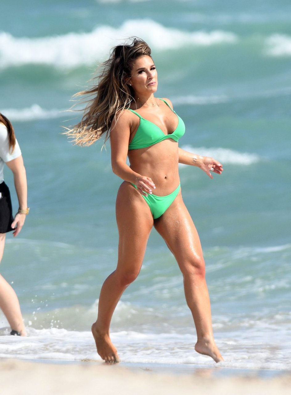 La estrella de country y estrella de reality TV Jessie James Decker (30) lleva un bikini verde brillante mientras graba un comercial en Miami Beach, 22/10/2018.