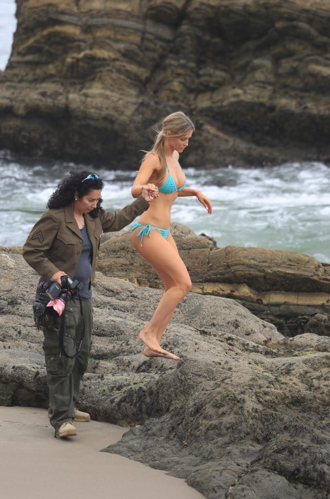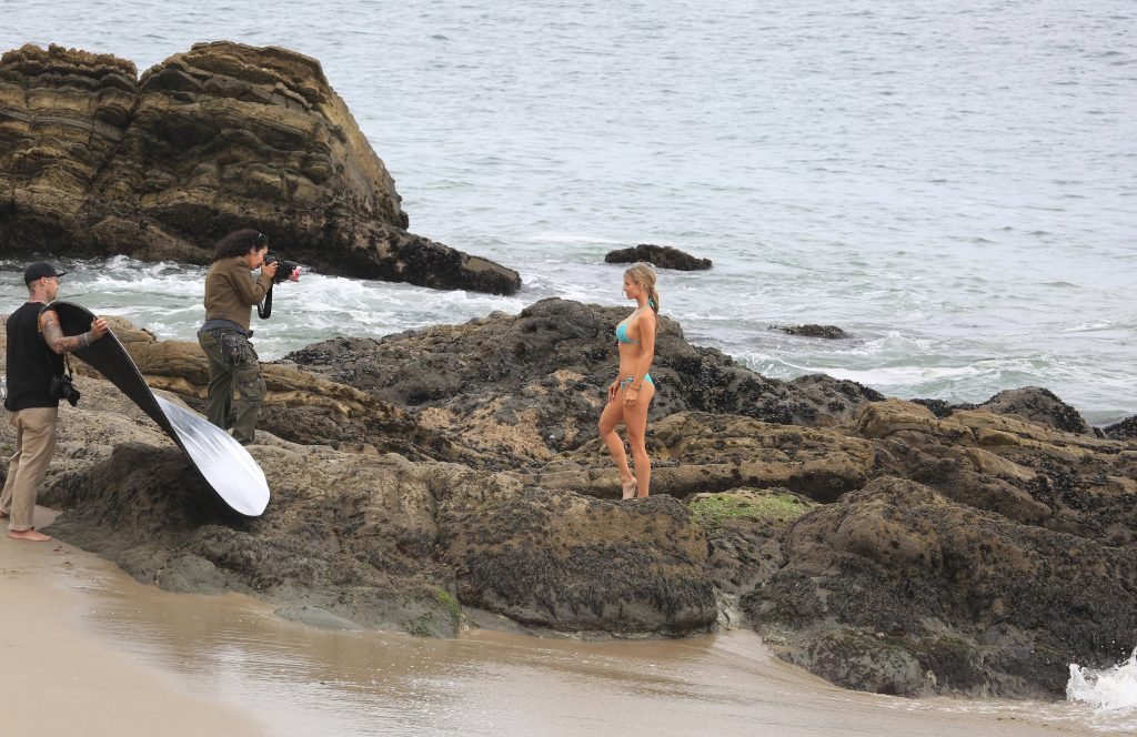 Model y actriz Joanna Krupa (39) deja su llamativo anillo de compromiso en casa pero muestra su cuerpo en bikini durante una sesión de fotos en el Día de la Madre en Malibu con Faye Sadou y Malachi Banales, 13/05/2018.