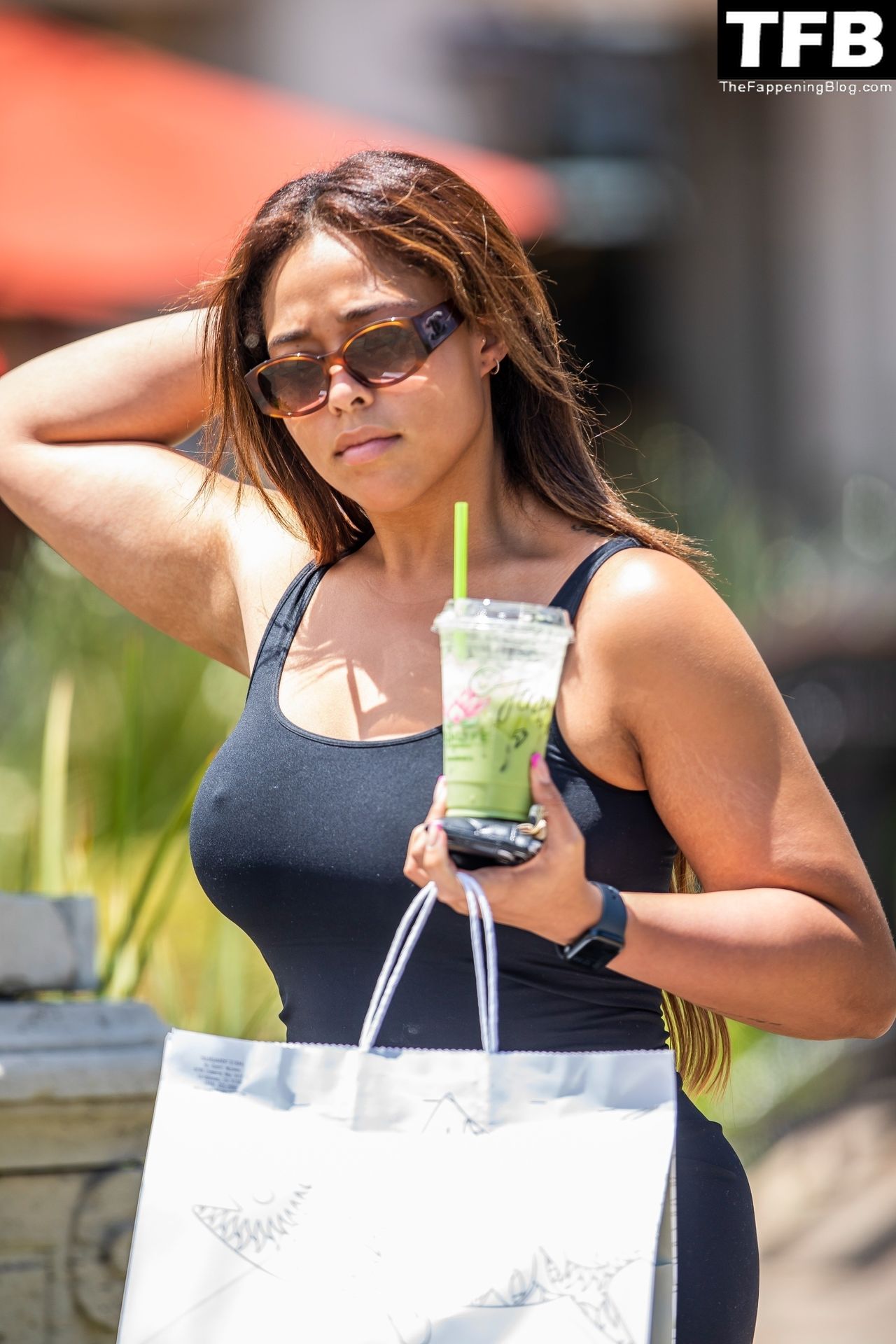 Jordyn Woods fue vista recogiendo sushi de Sugarfish y un batido Mystic en Sunlife Organics en Calabasas, 01/08/2022. Llevaba un vestido negro ceñido durante la salida en solitario.