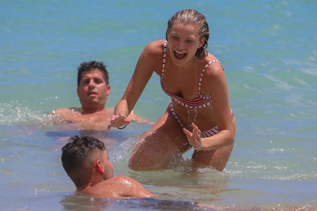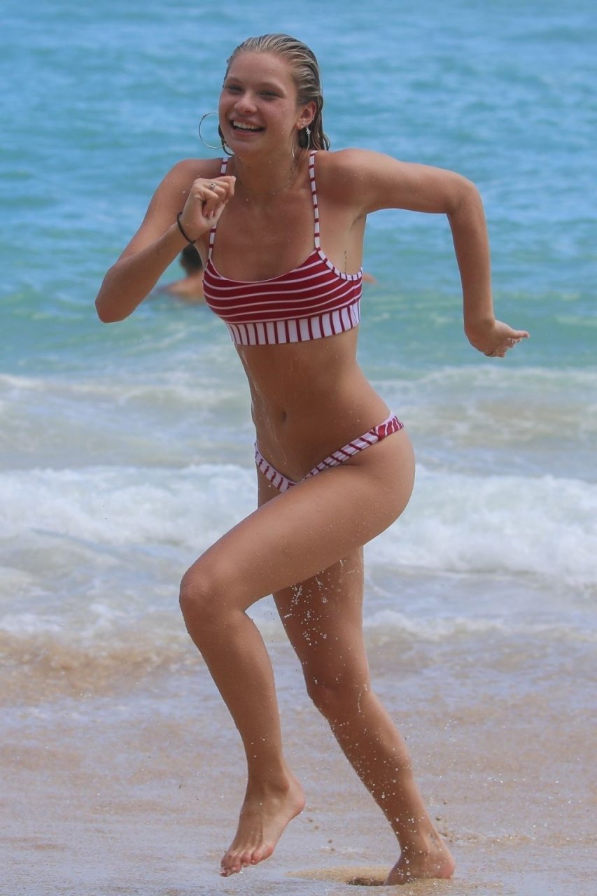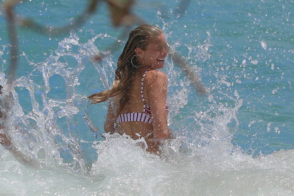 Modela Josie Canseco quema la arena hawaiana con un diminuto bikini a rayas, 02/08/2019. ¡La modelo casi sufre un fallo de vestuario mientras juega en las olas rompientes! Sin duda, demuestra por qué fue elegida como un ángel de Victoria’s Secret.