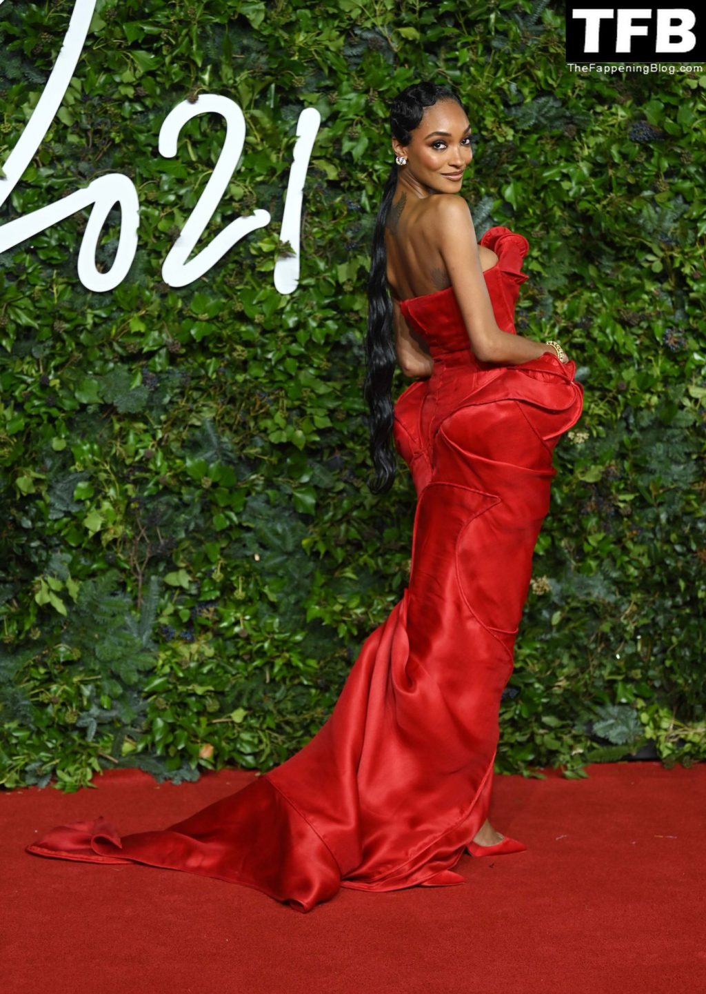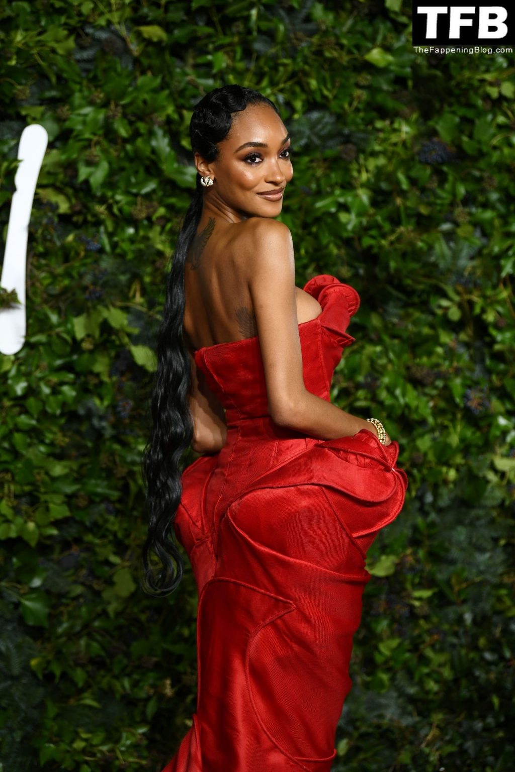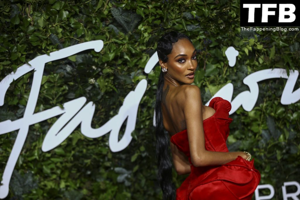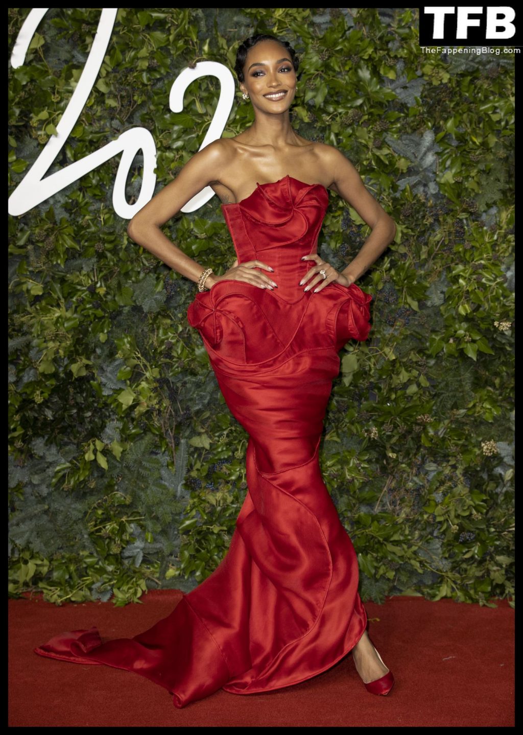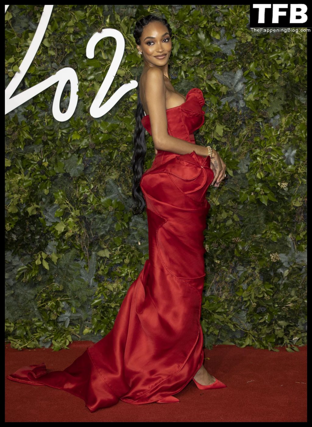 Model Jourdan Dunn muestra sus pechos, vistiendo un vestido rojo mientras asiste a Los Premios de la Moda 2021 en el Royal Albert Hall en Londres, 29/11/2021.