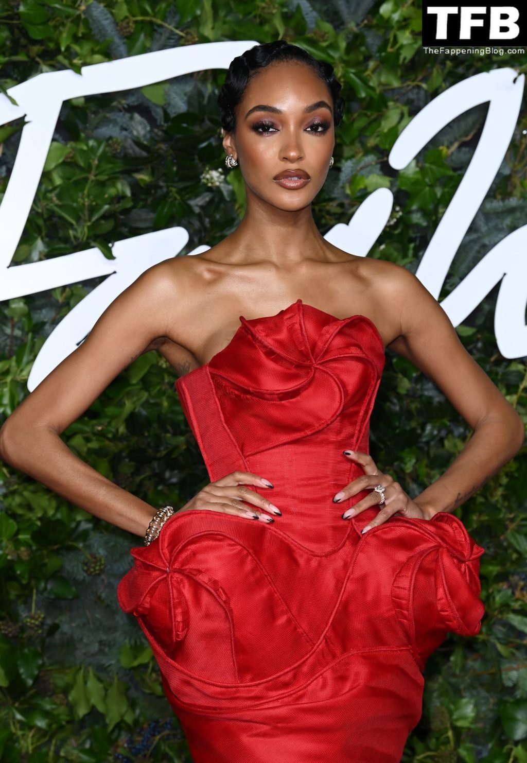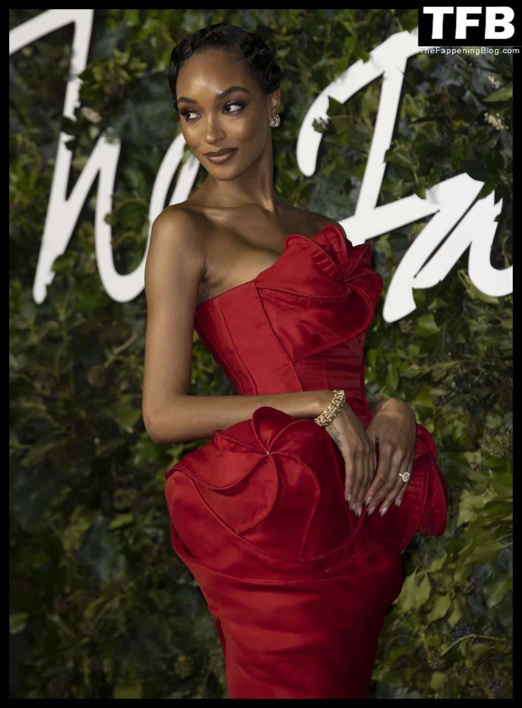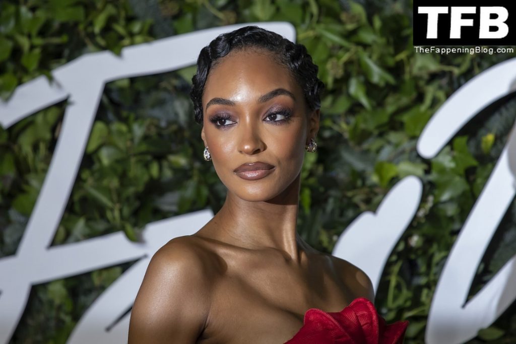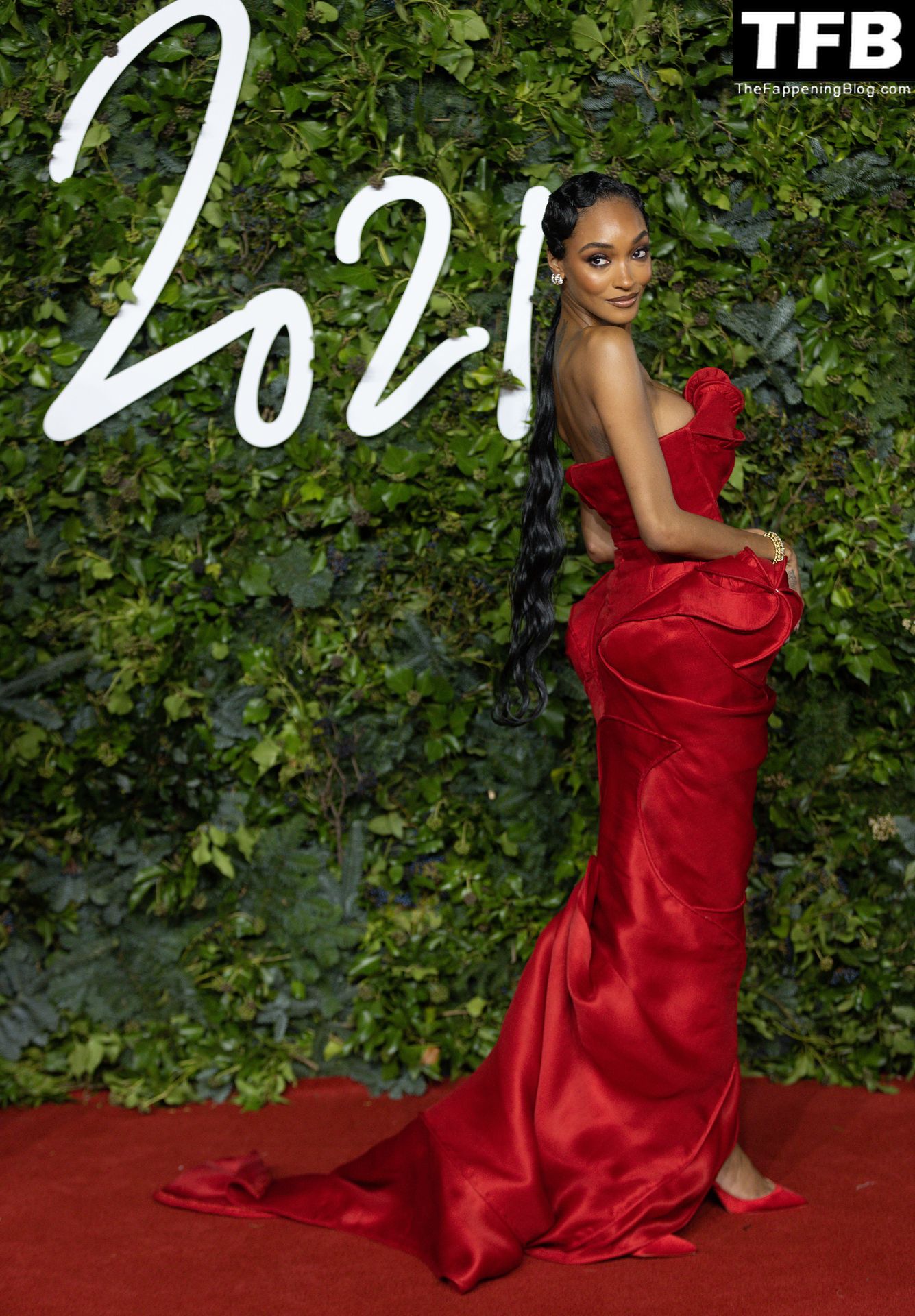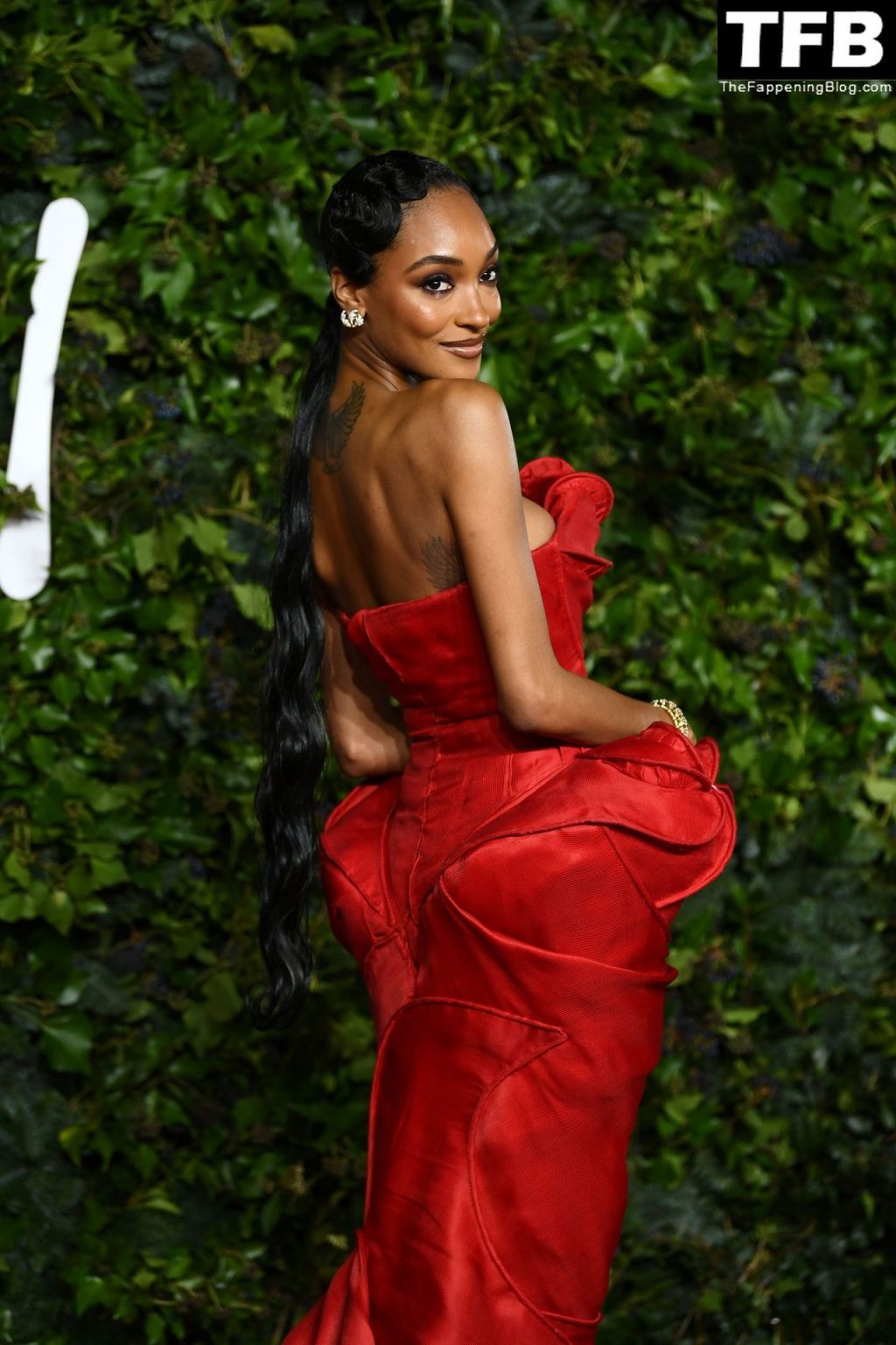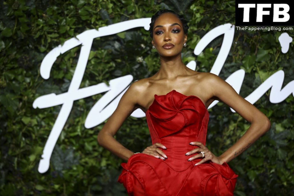 Model Jourdan Dunn muestra sus pechos, vistiendo un vestido rojo mientras asiste a Los Premios de la Moda 2021 en el Royal Albert Hall en Londres, 29/11/2021.