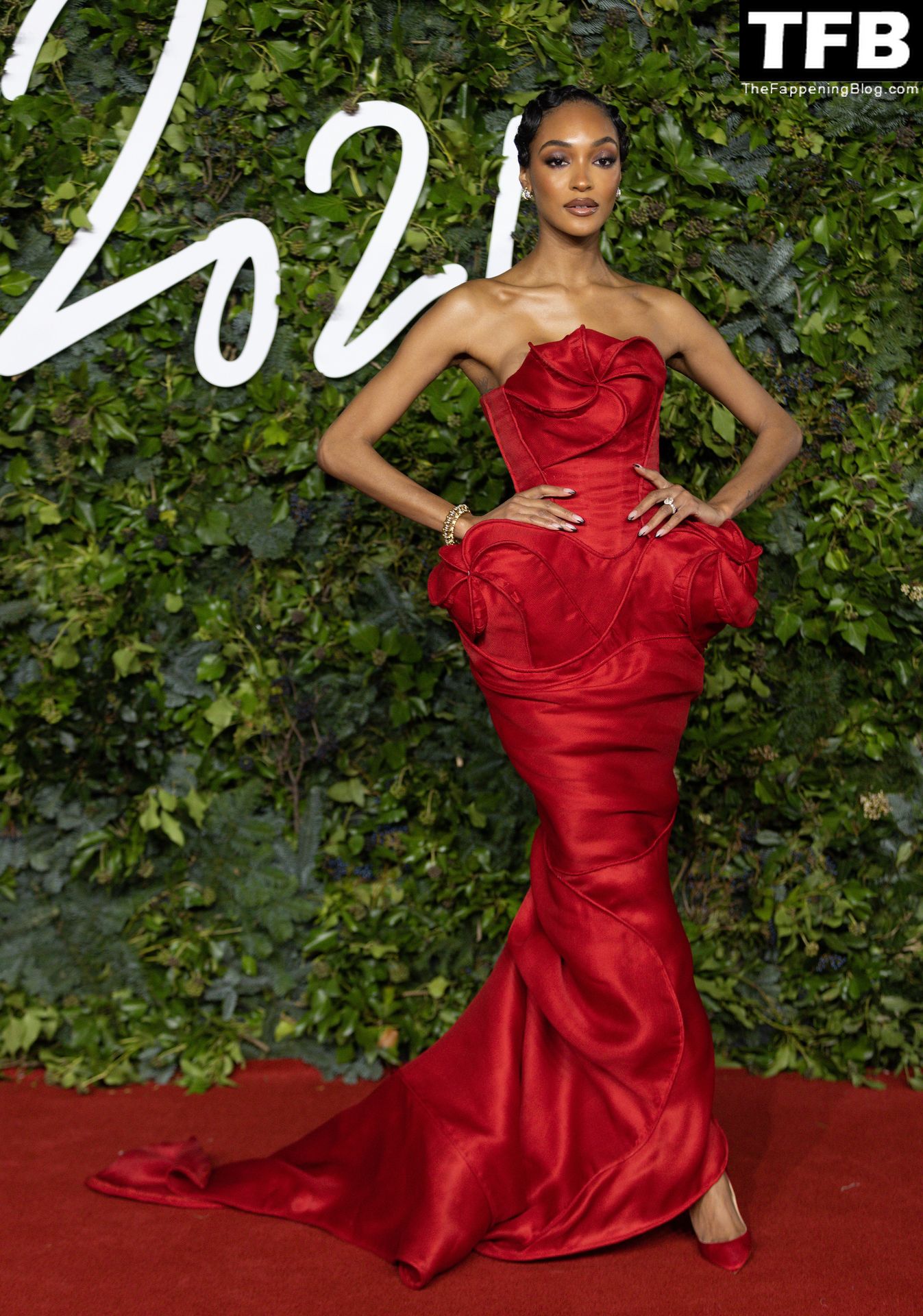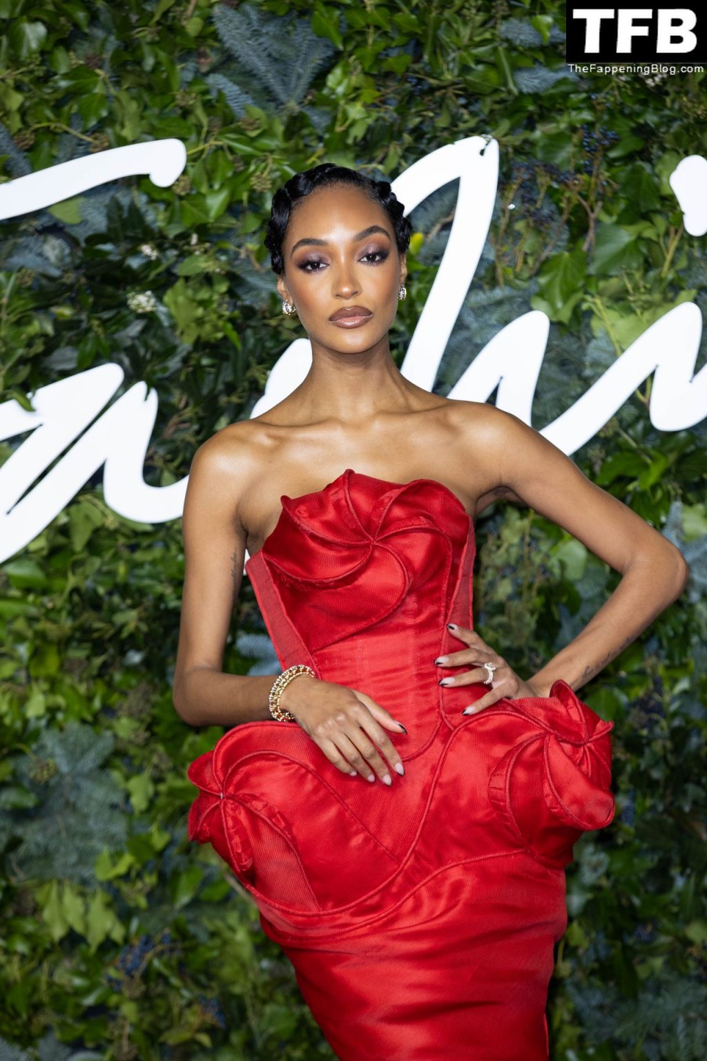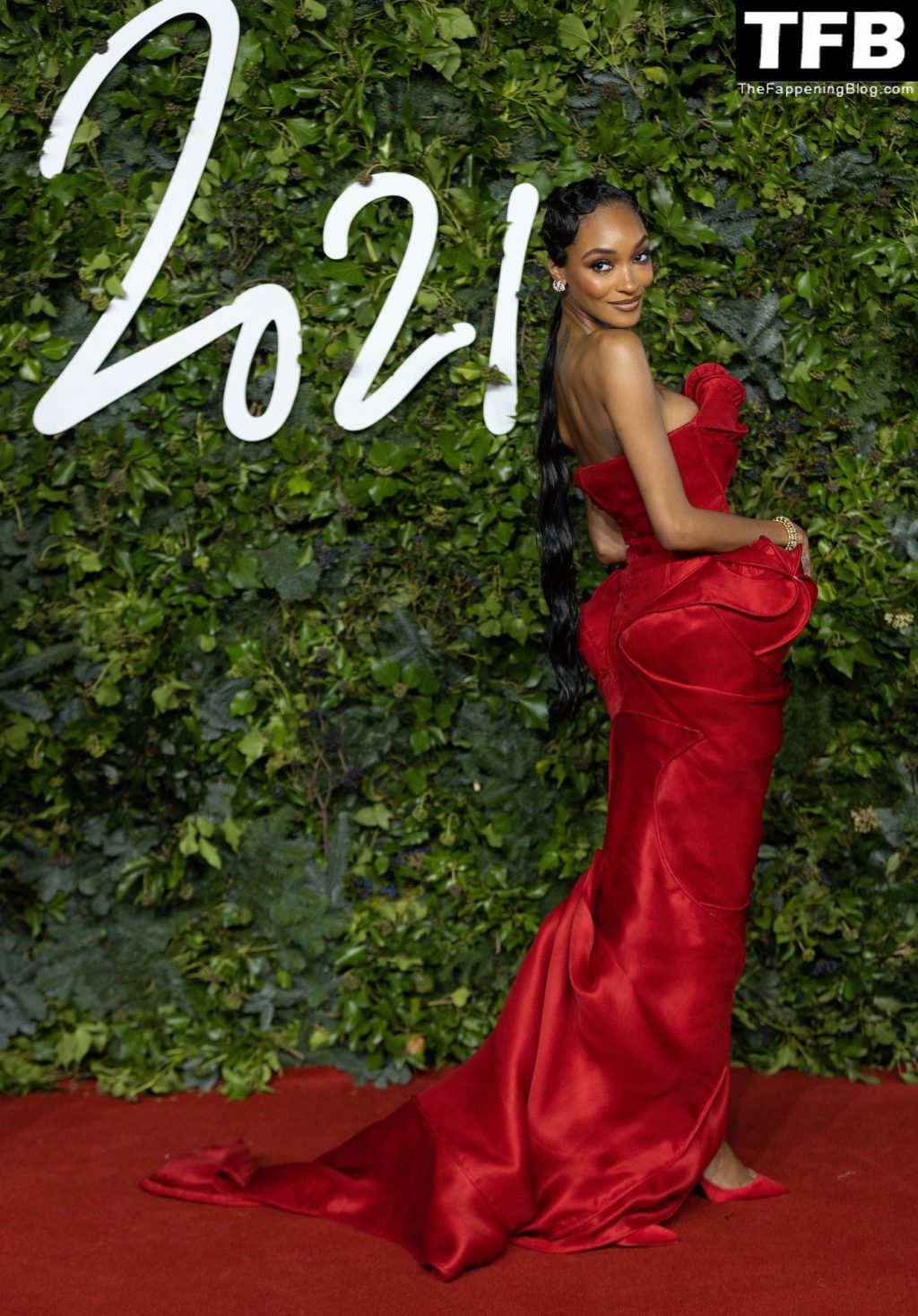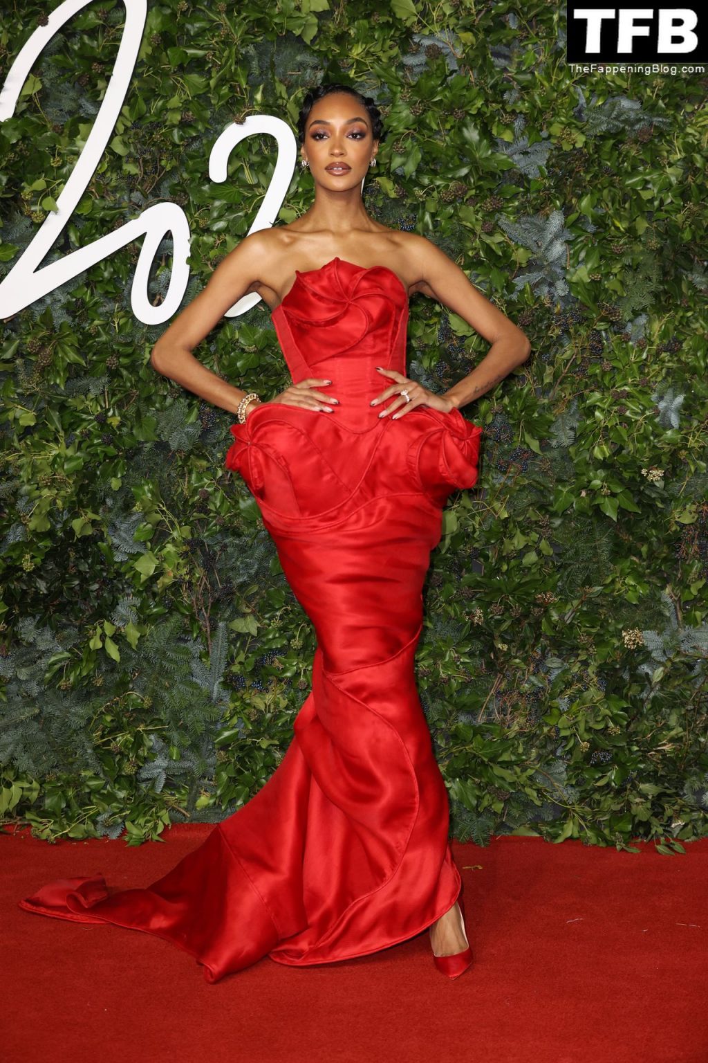 Model Jourdan Dunn muestra sus pechos, vistiendo un vestido rojo mientras asiste a Los Premios de la Moda 2021 en el Royal Albert Hall en Londres, 29/11/2021.