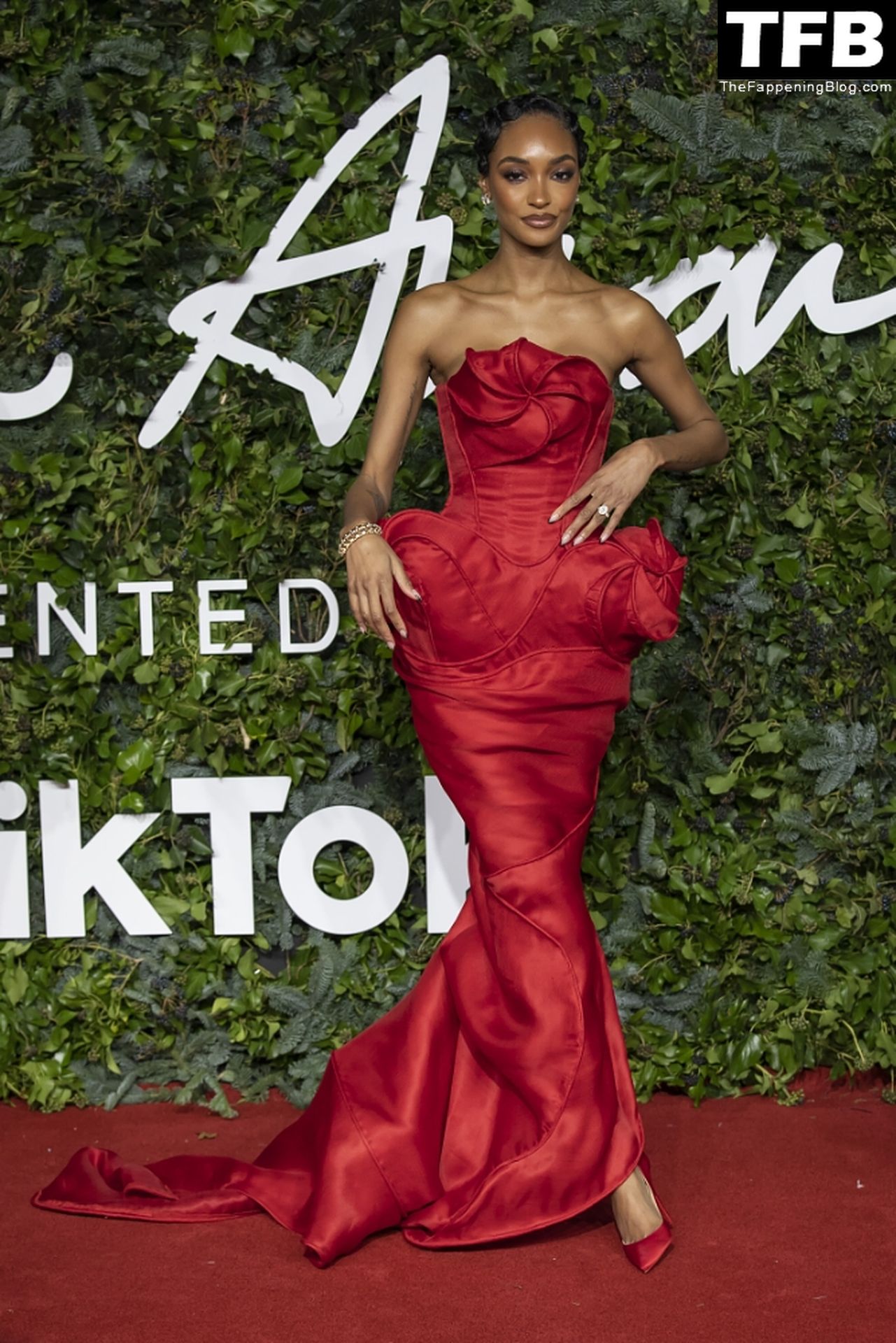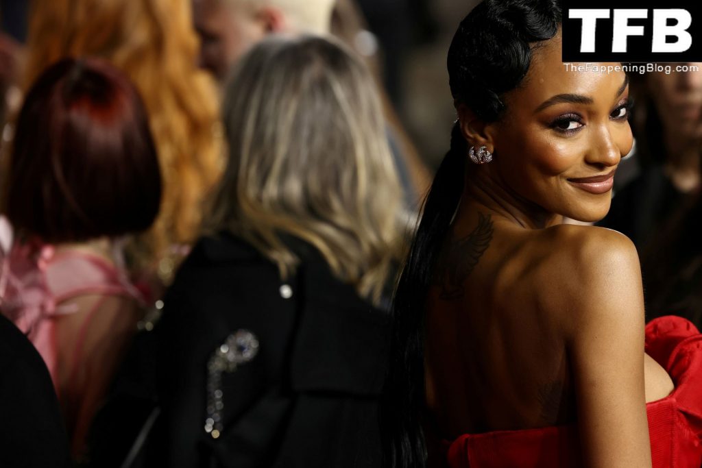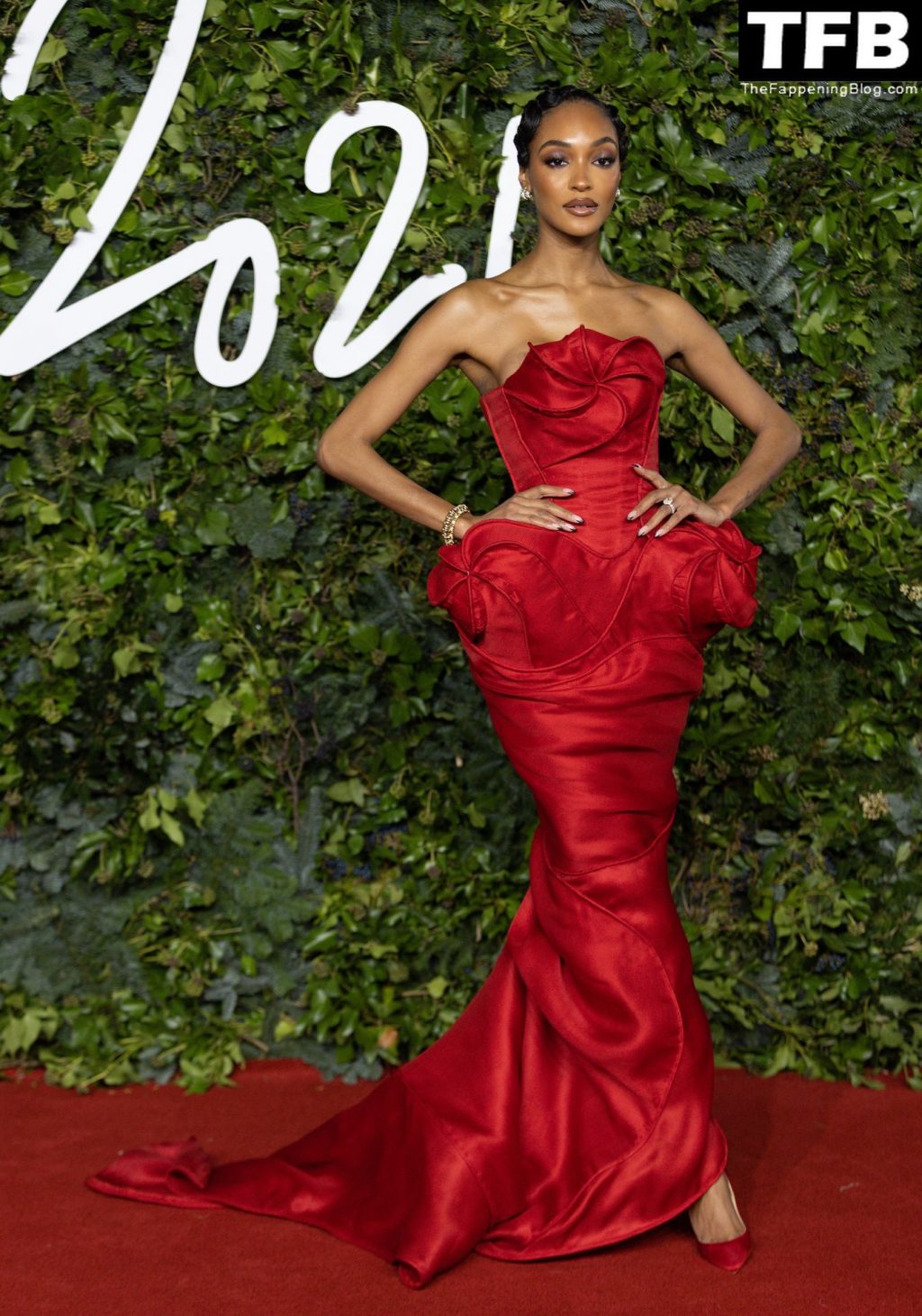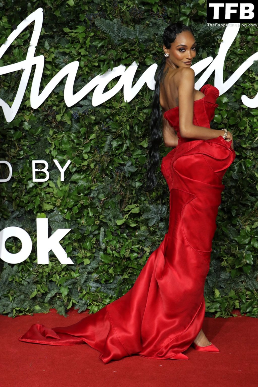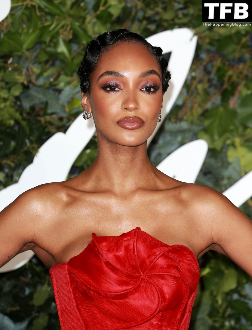Model Jourdan Dunn muestra sus pechos, vistiendo un vestido rojo mientras asiste a Los Premios de la Moda 2021 en el Royal Albert Hall en Londres, 29/11/2021.