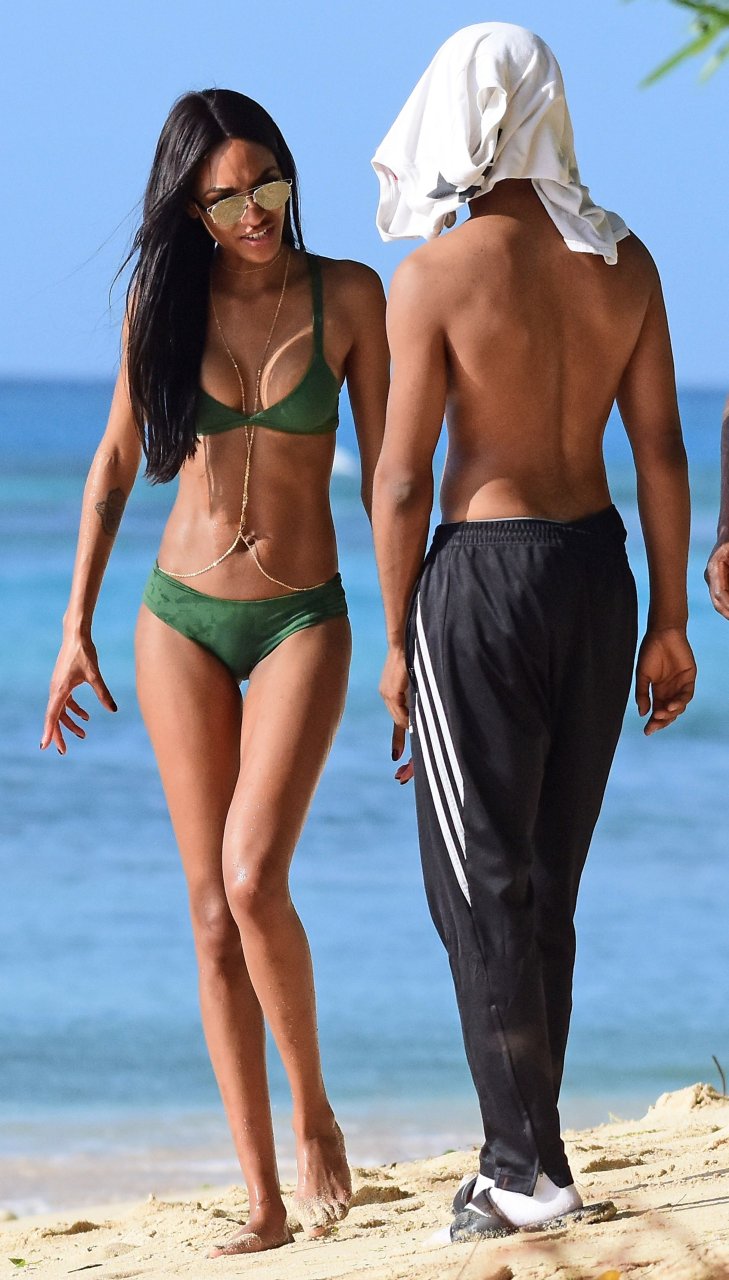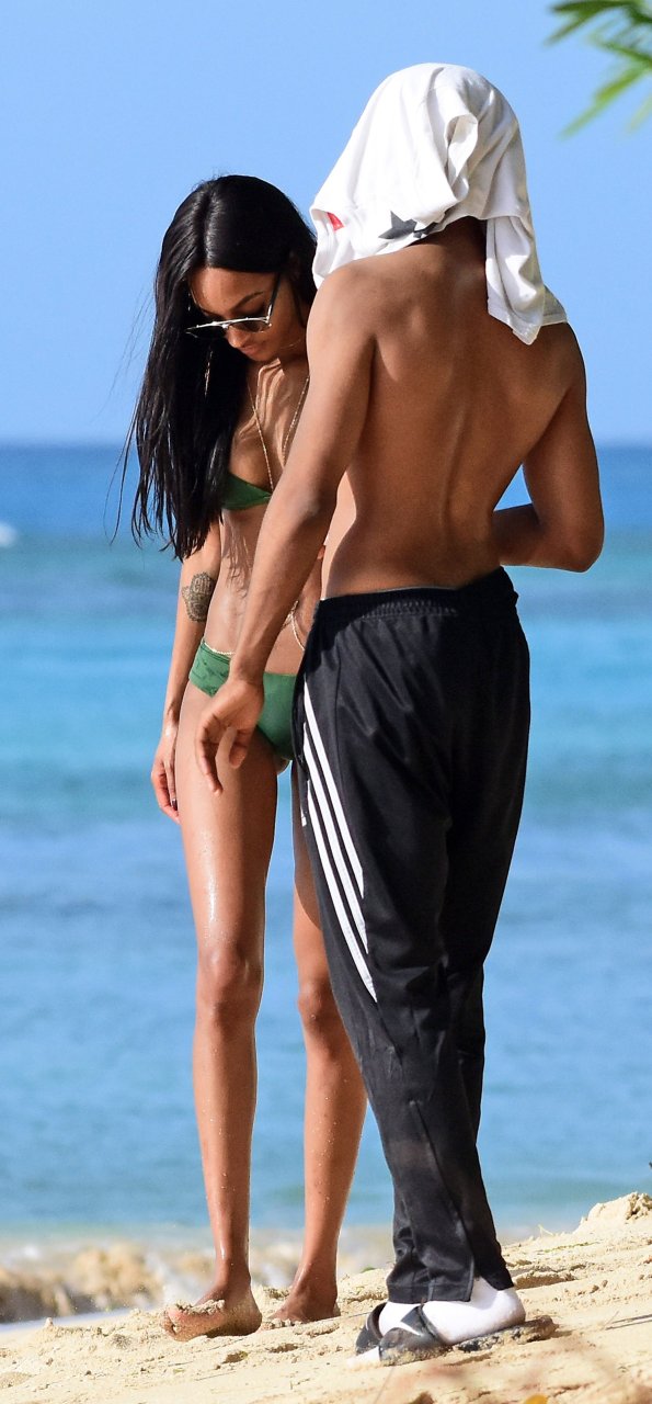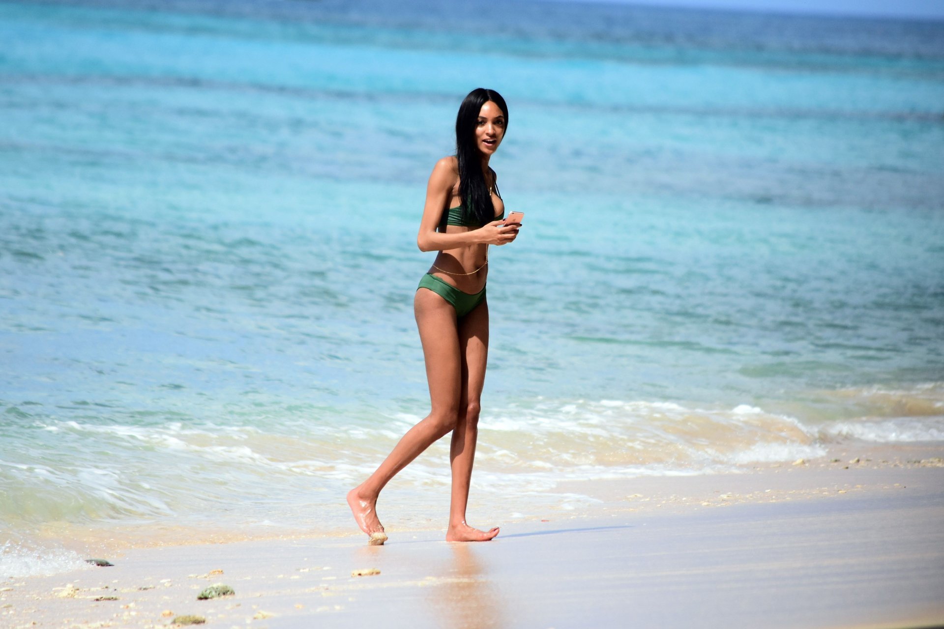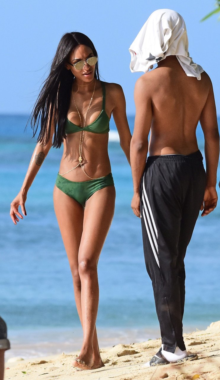 Jourdan Dunn vista en bikini verde en la playa de Barbados, 24/12/2016. Jourdan Dunn es una modelo inglesa. Edad: 26 (nacida el 3 de agosto de 1990).