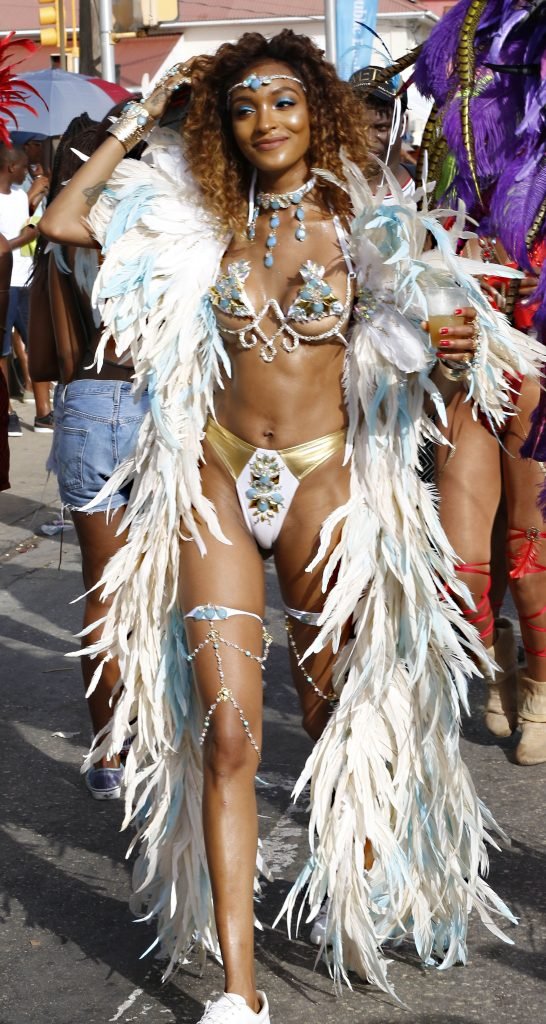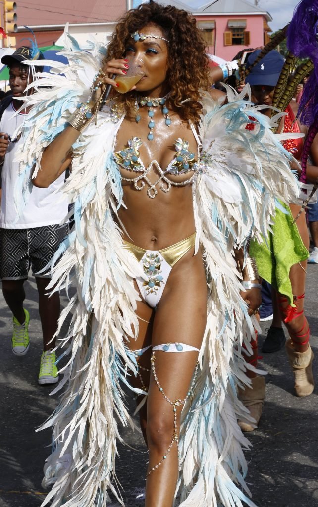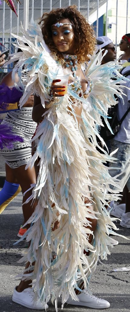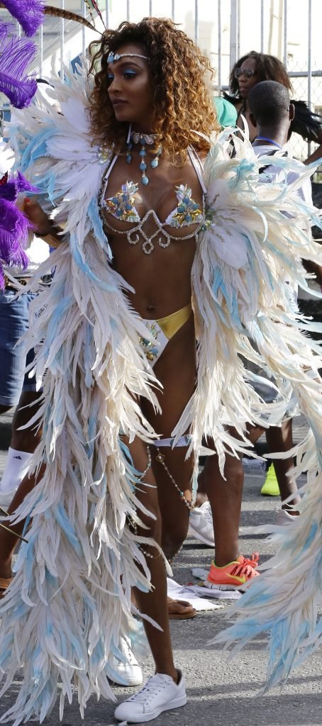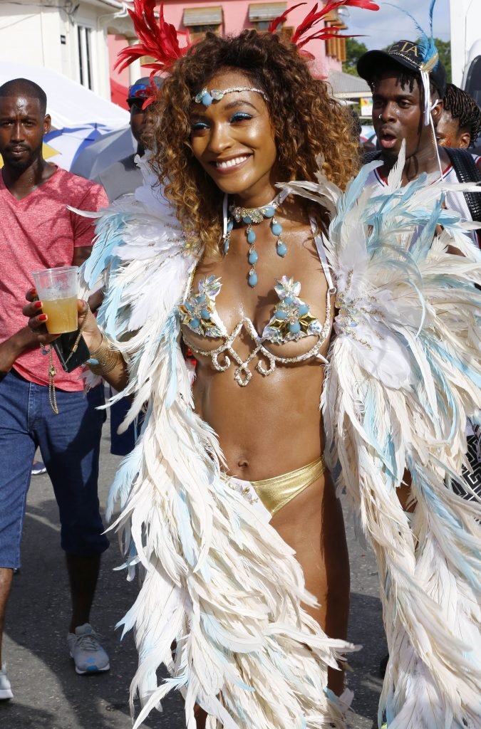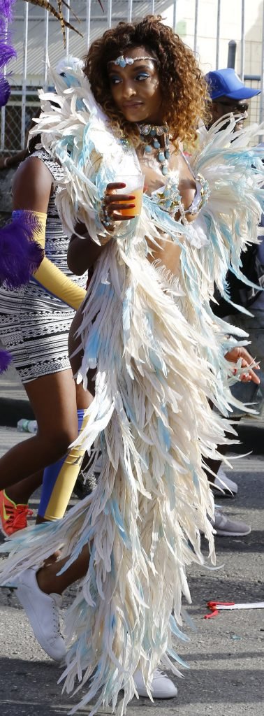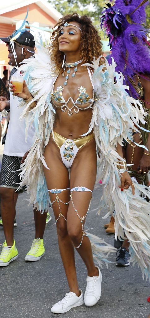 Model Jourdan Dunn es vista desfilando por las calles de Barbados con un disfraz blanco de plumas, 08/07/2017.